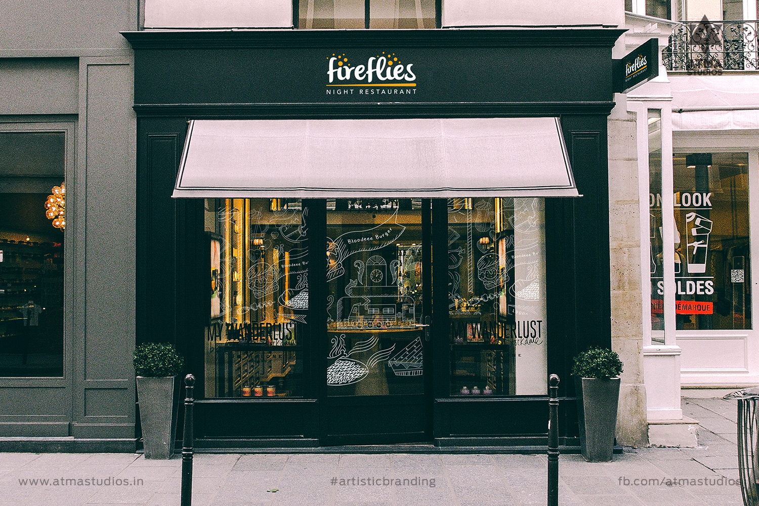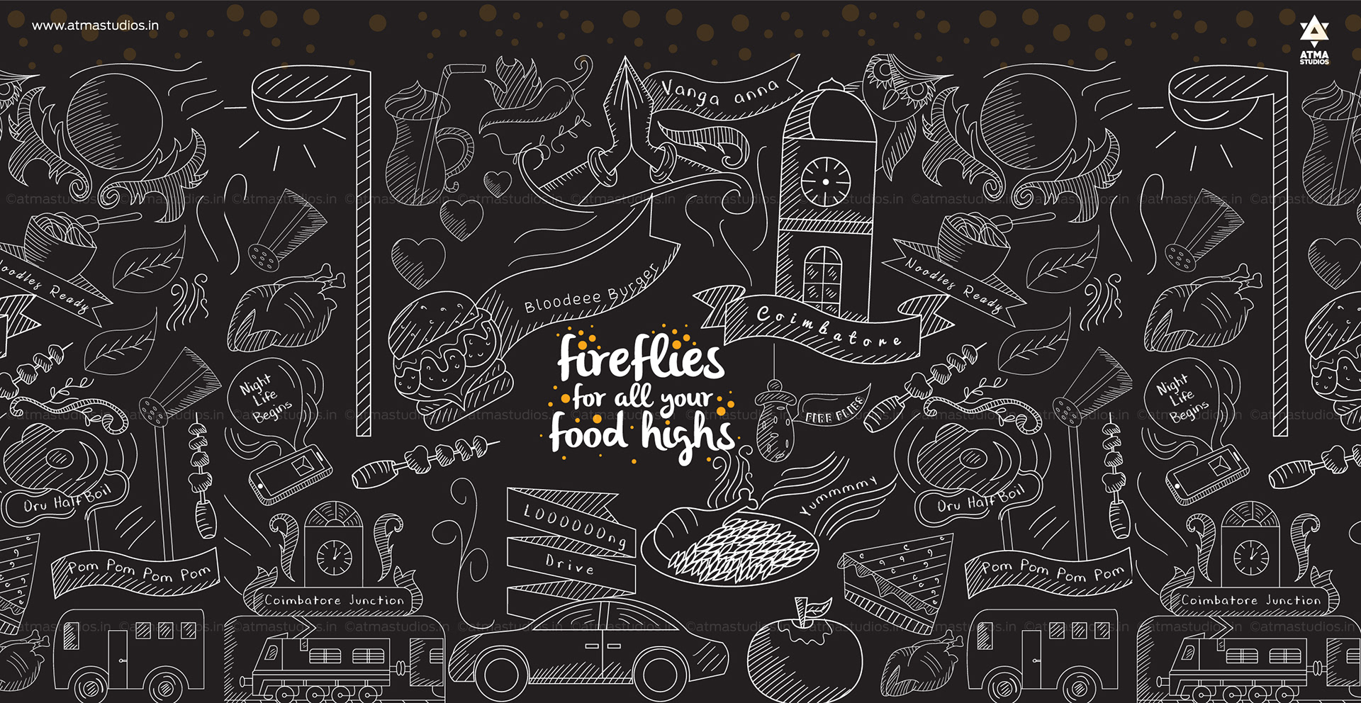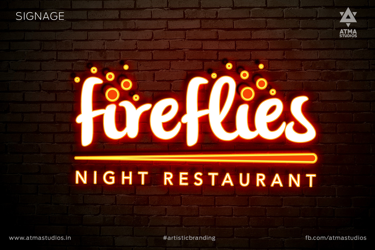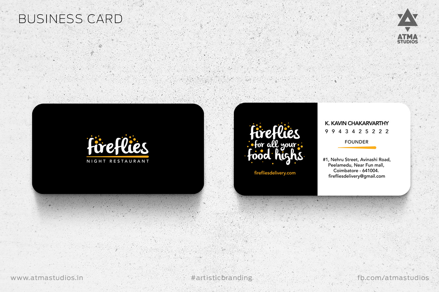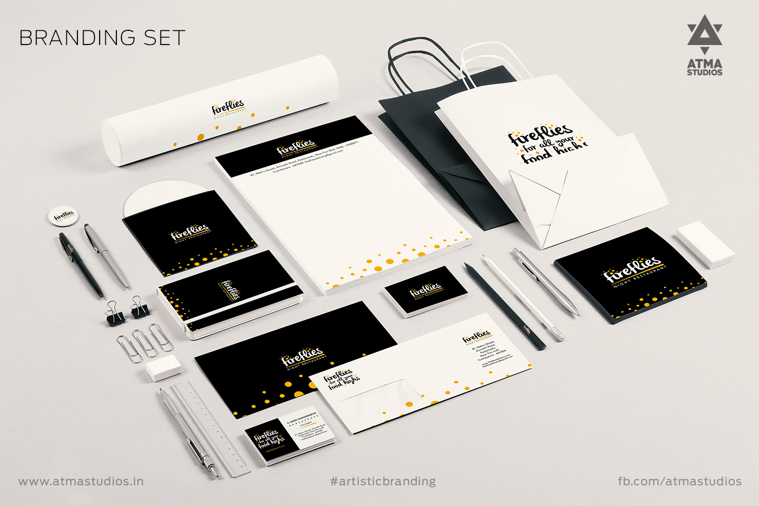 Brand Name As the name Fireflies goes with light in the dark, so as we light your life at night. It is a new way introduction to the Night life, first time ever in Coimbatore. Brand Colors Black color indicates darkness, when actually the business starts. Yellow indicates new fresh ideas like the blooming of Night Restaurant, first of its kind in Coimbatore. White specifies the purity in service. Brand Element The bubbles moving upwards show the rising of new efforts to heights and also indicate that such businesses that help people at night are yet to come.