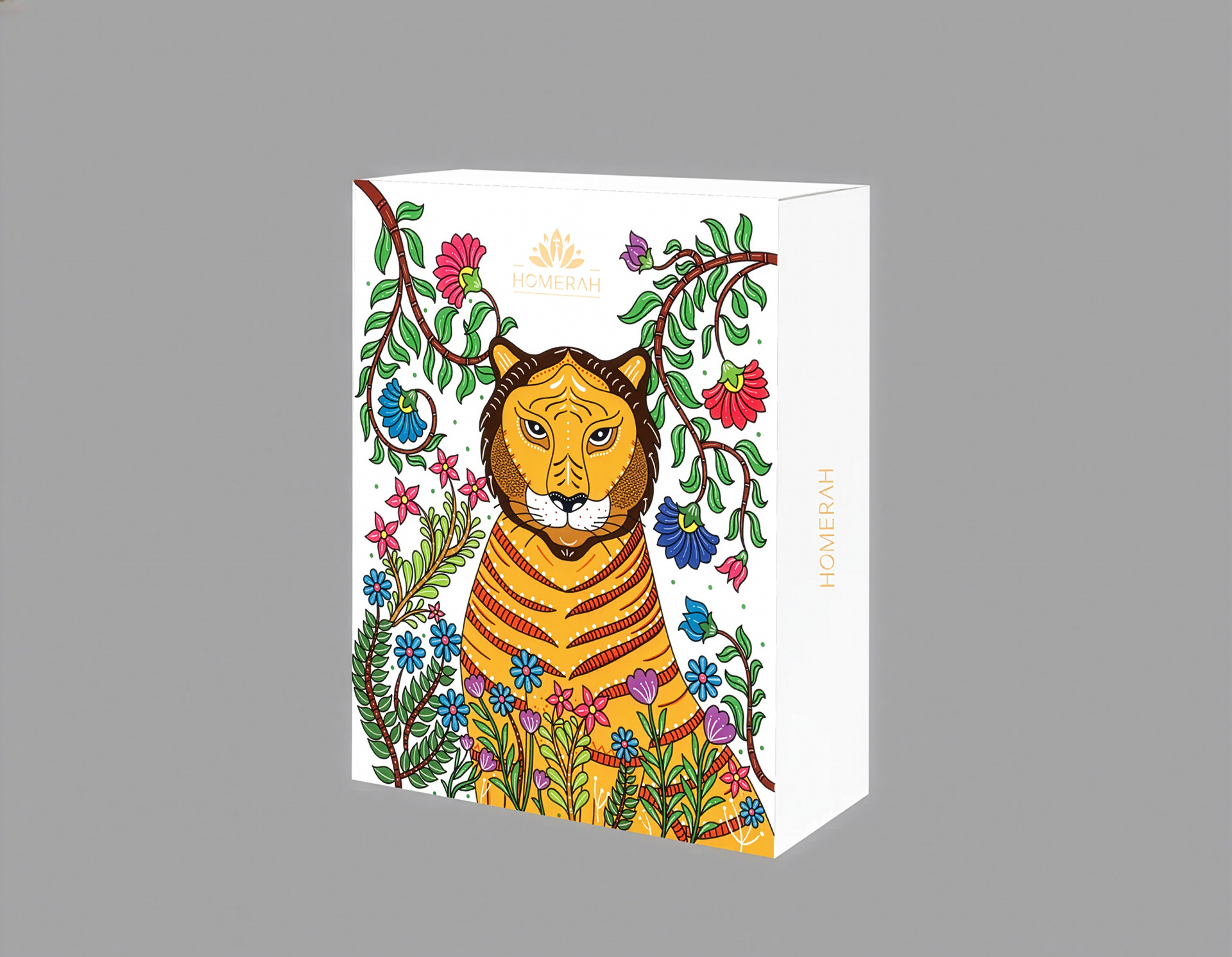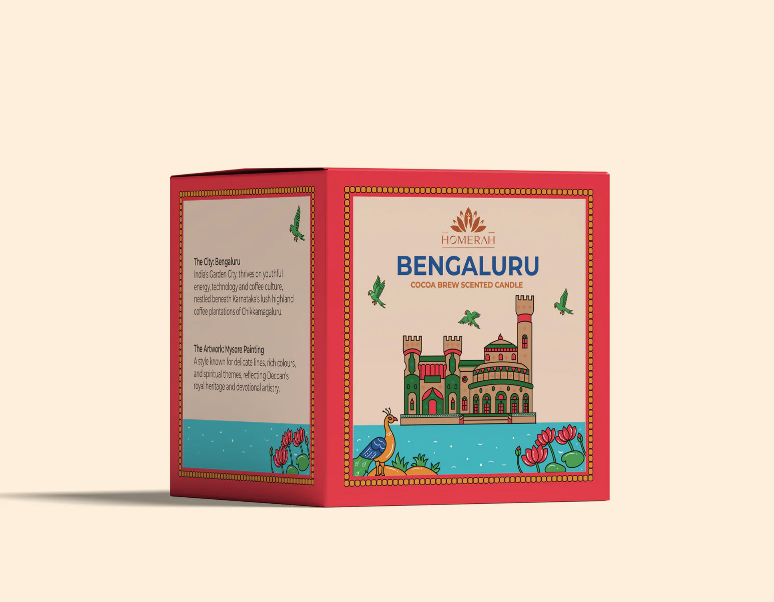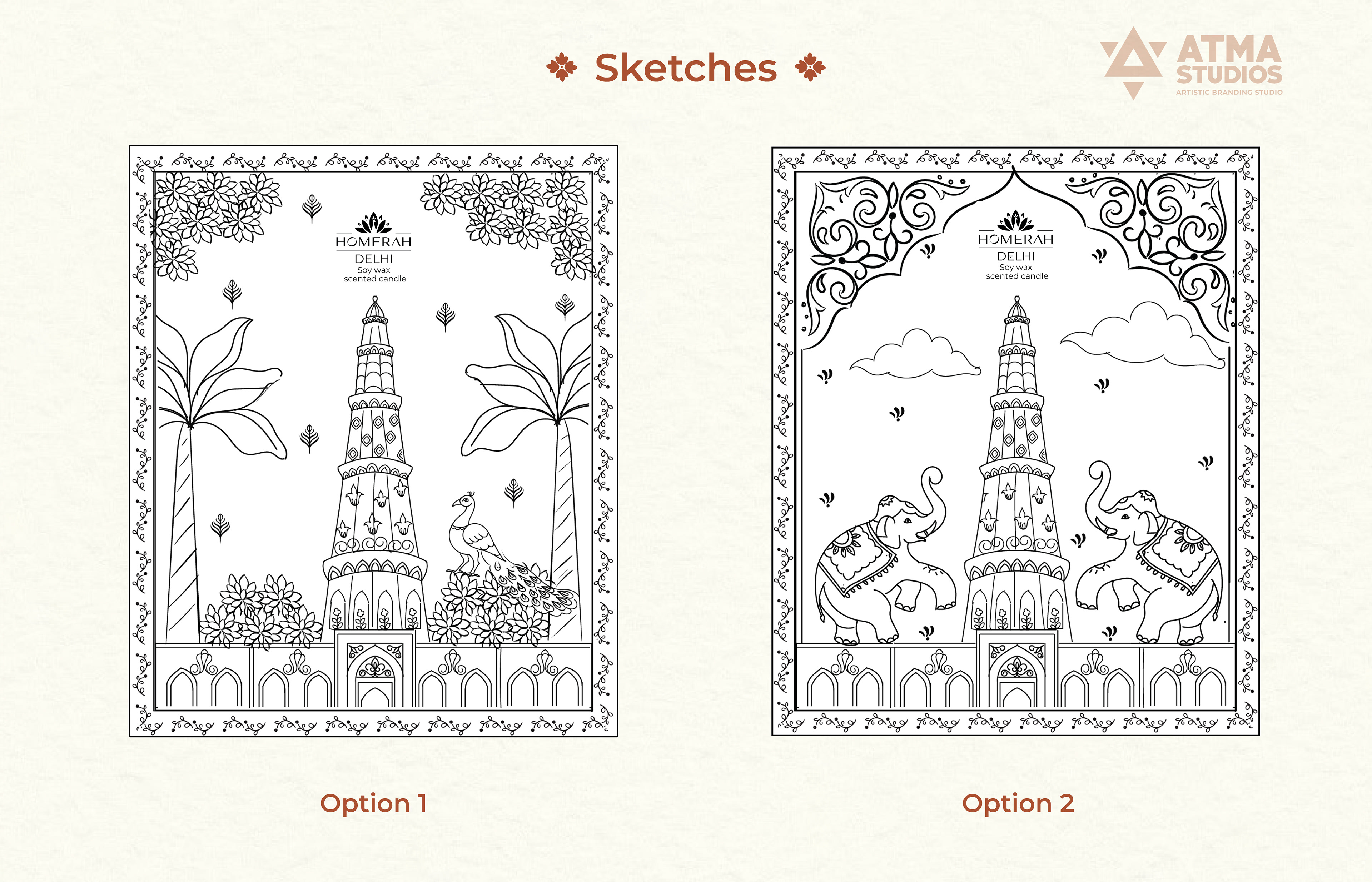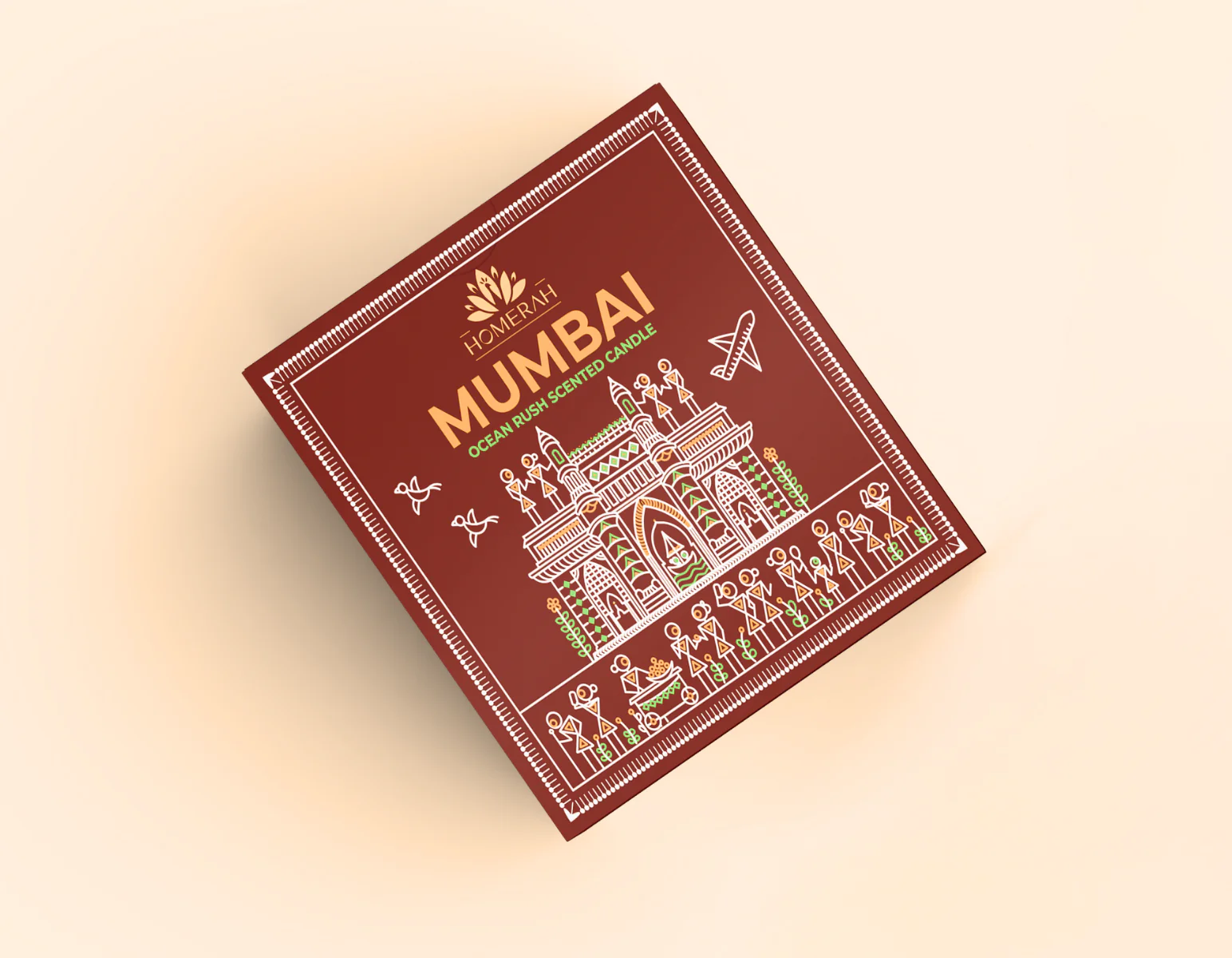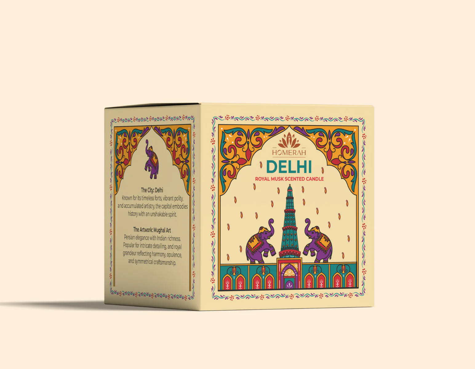 A premium incense candle and gift box design project for Homerah, inspired by India’s rich cultural heritage. Completely visualised and designed by Atma Studios. Each label and package artwork translates iconic cities, traditional art forms and heritage narratives into contemporary illustrations, creating a cohesive, luxurious visual identity across the product range.