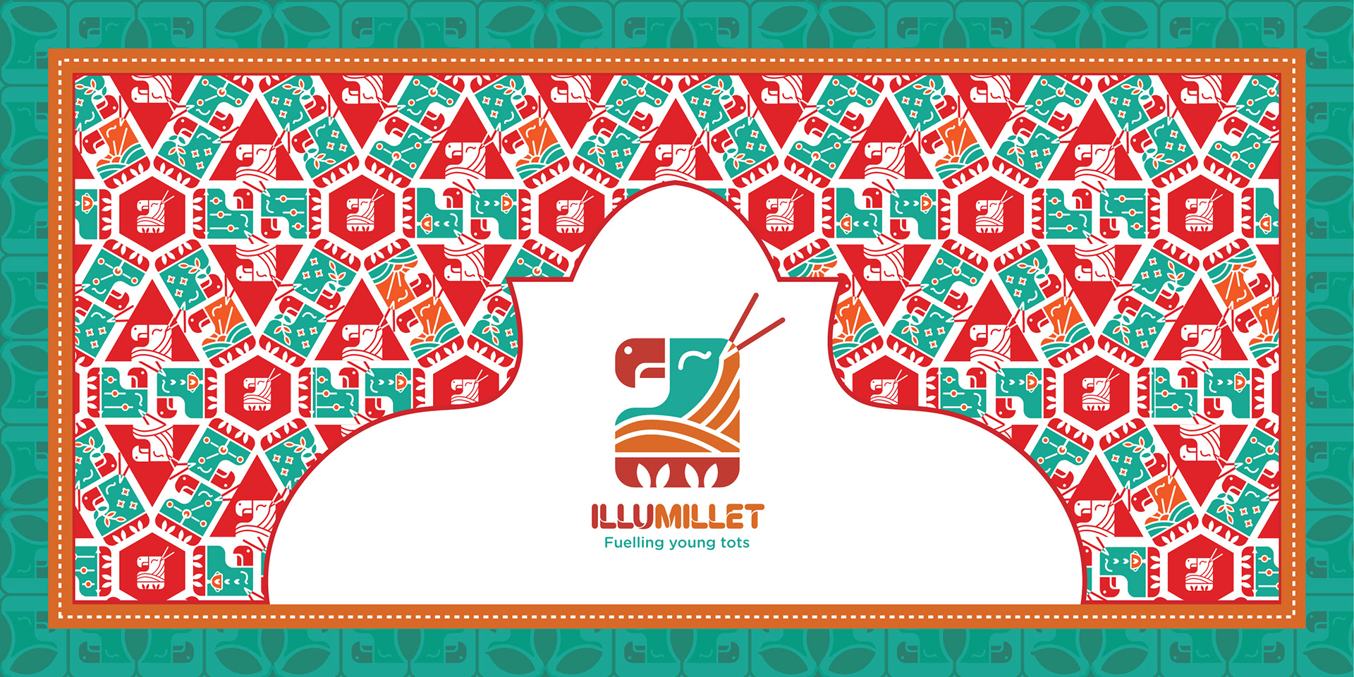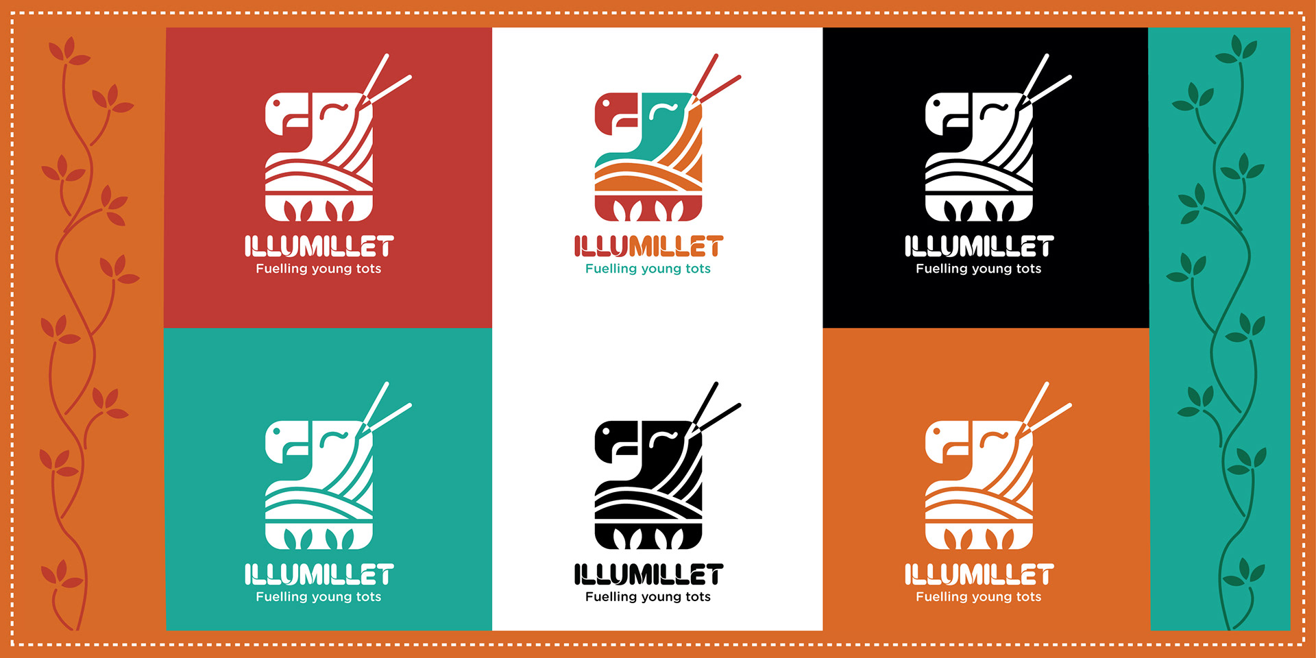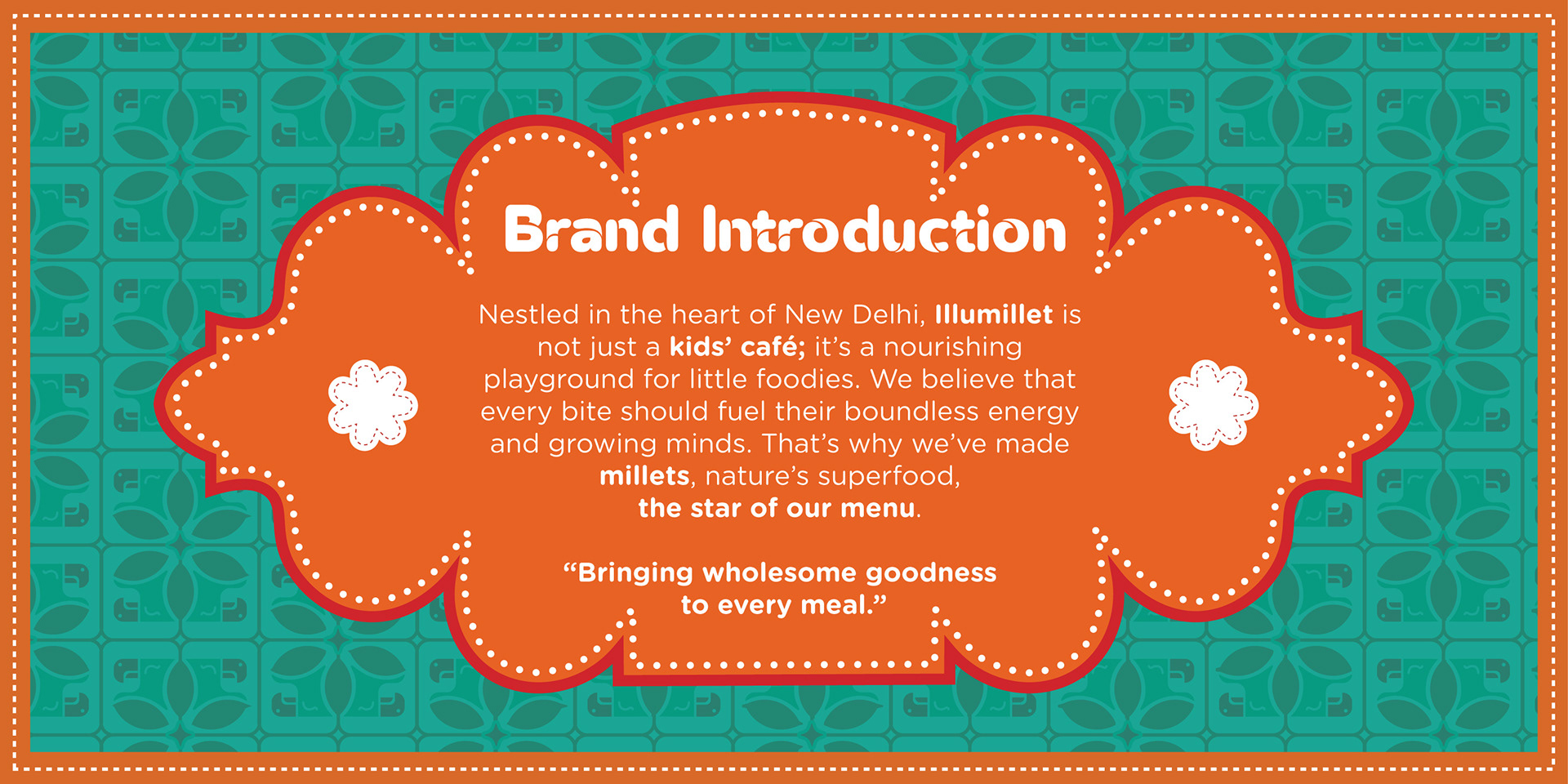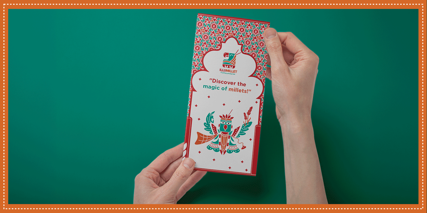 Illumillet is a vibrant kids' café that blends traditional Indian ingredients with modern tastes, promoting healthy eating habits through millet-based snacks in a fun, culturally rich environment. The brand is designed to be warm, friendly, with a touch of playfulness to engage the young audience.