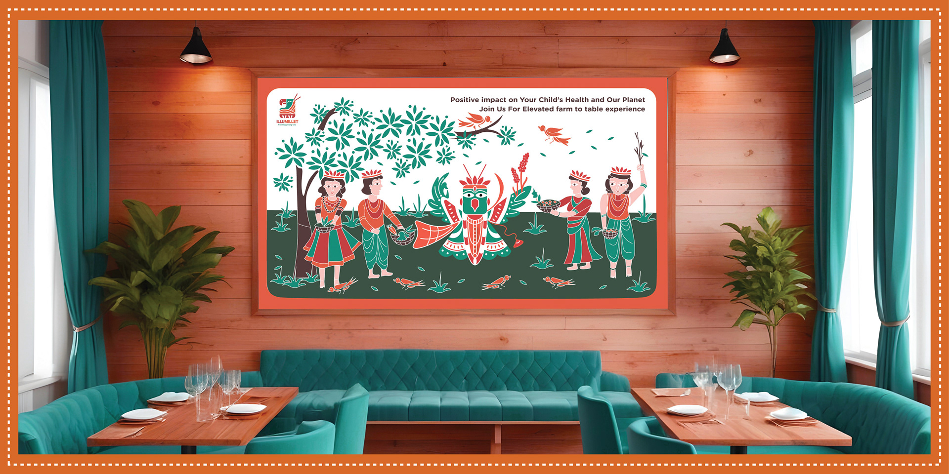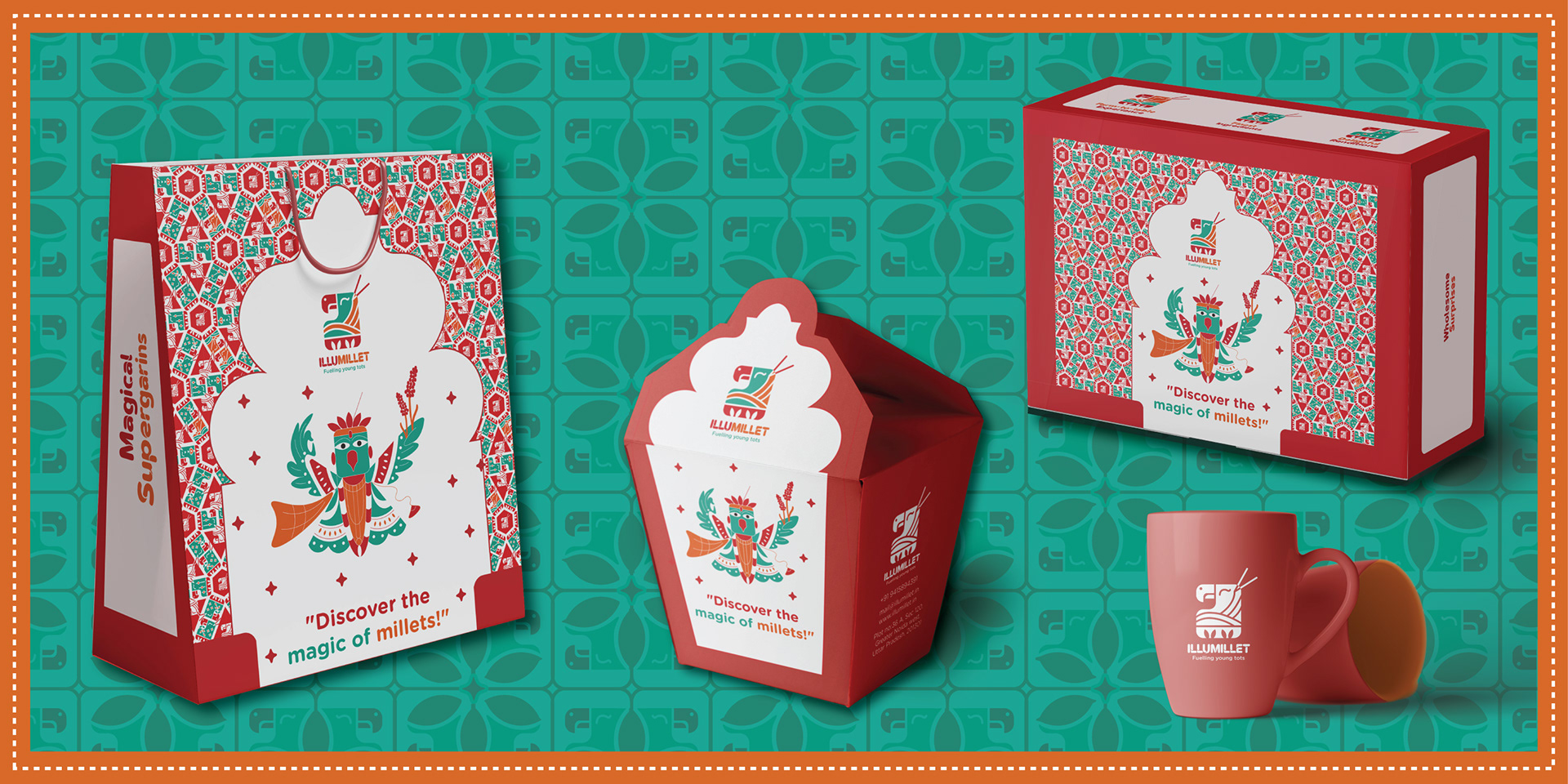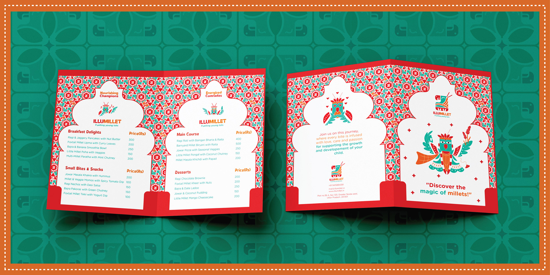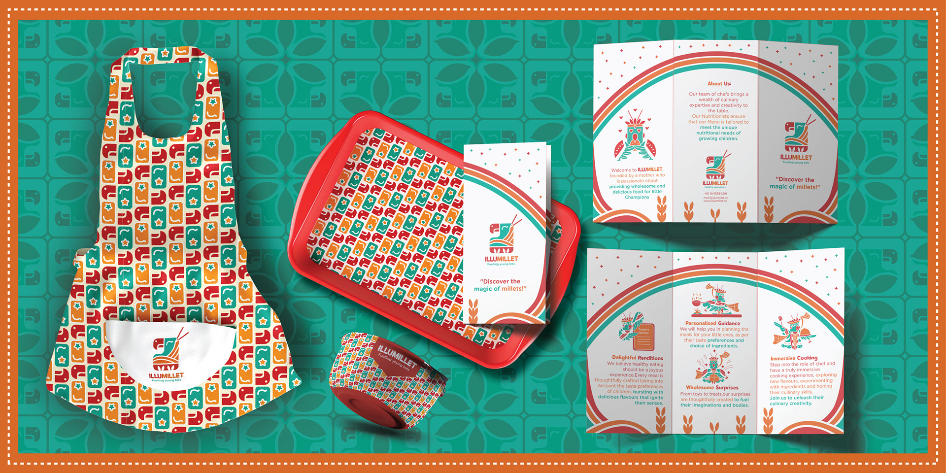 Illumillet is a vibrant kids' café that blends traditional Indian ingredients with modern tastes, promoting healthy eating habits through millet-based snacks in a fun, culturally rich environment. The brand is designed to be warm, friendly, with a touch of playfulness to engage the young audience.