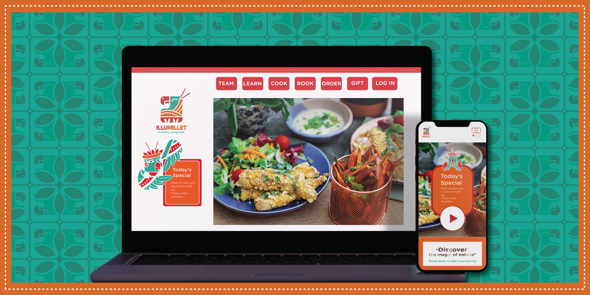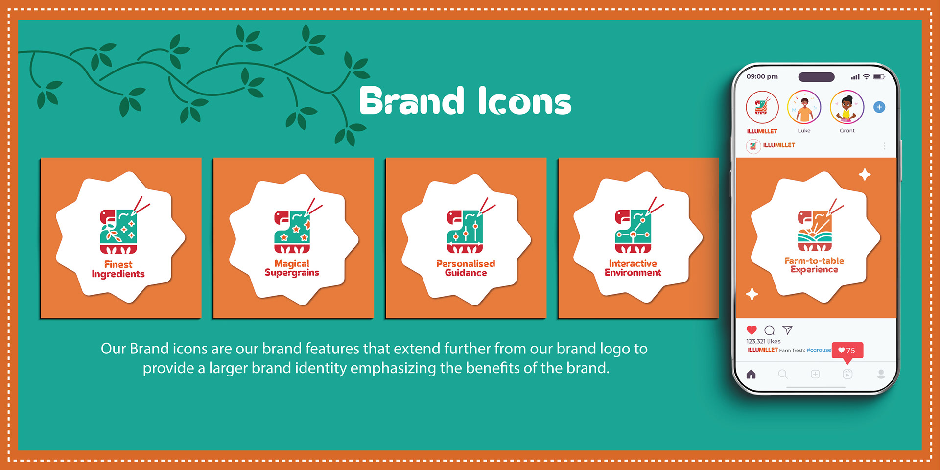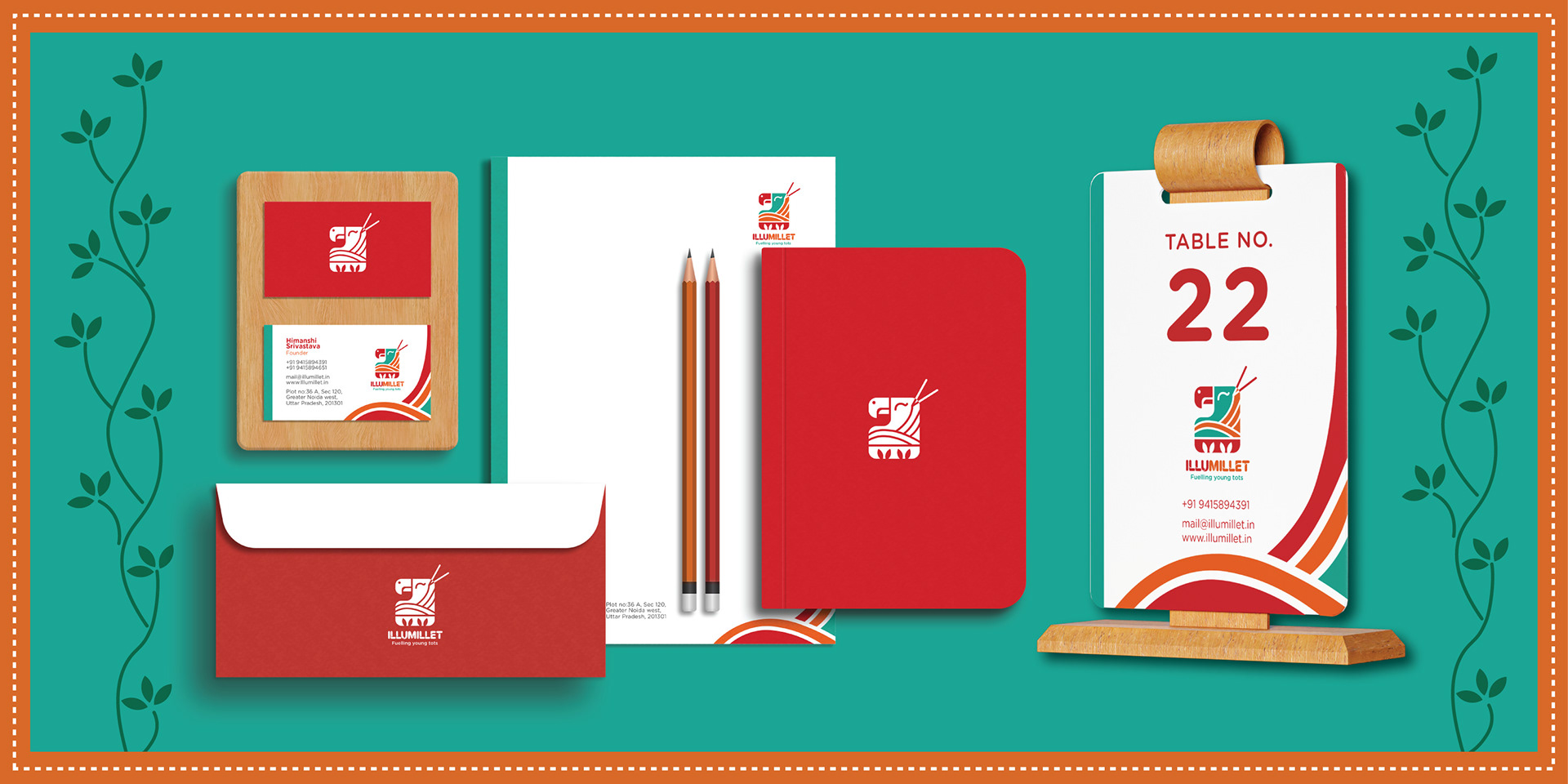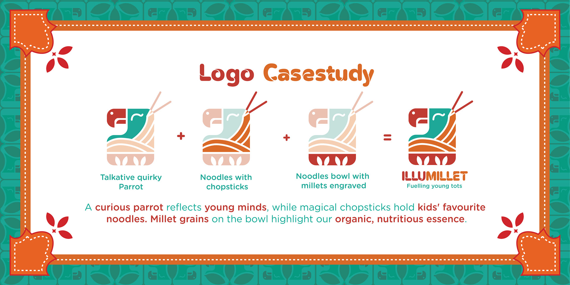 Illumillet is a vibrant kids' café that blends traditional Indian ingredients with modern tastes, promoting healthy eating habits through millet-based snacks in a fun, culturally rich environment. The brand is designed to be warm, friendly, with a touch of playfulness to engage the young audience.