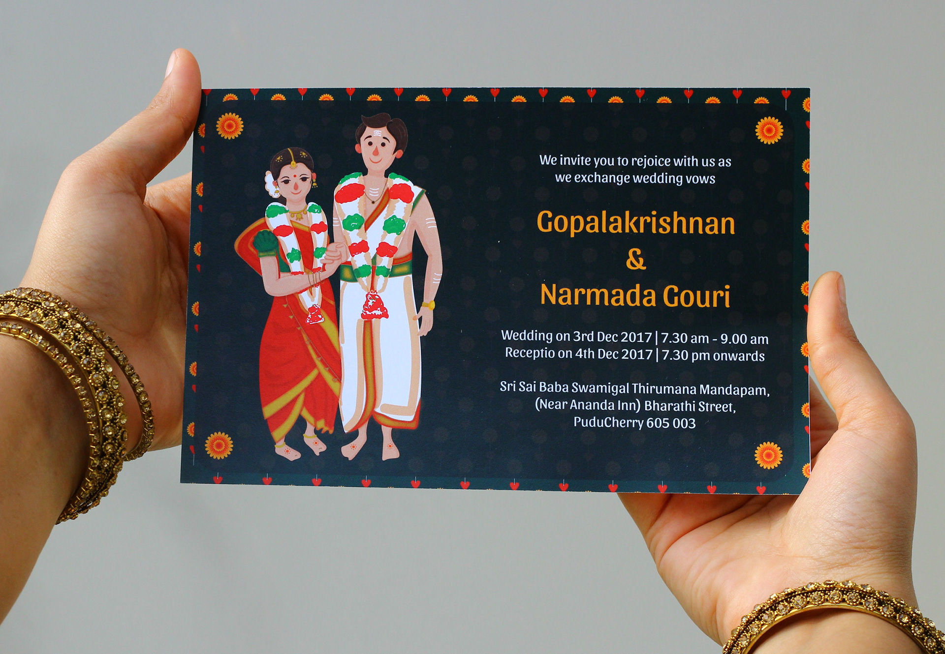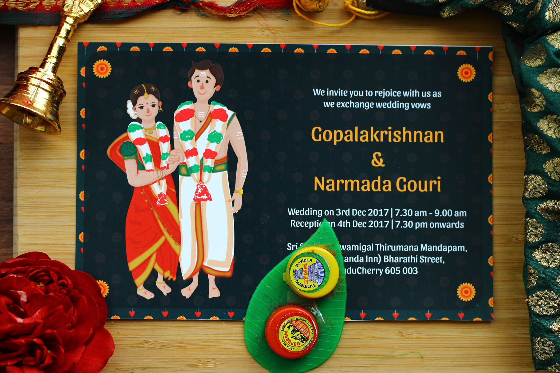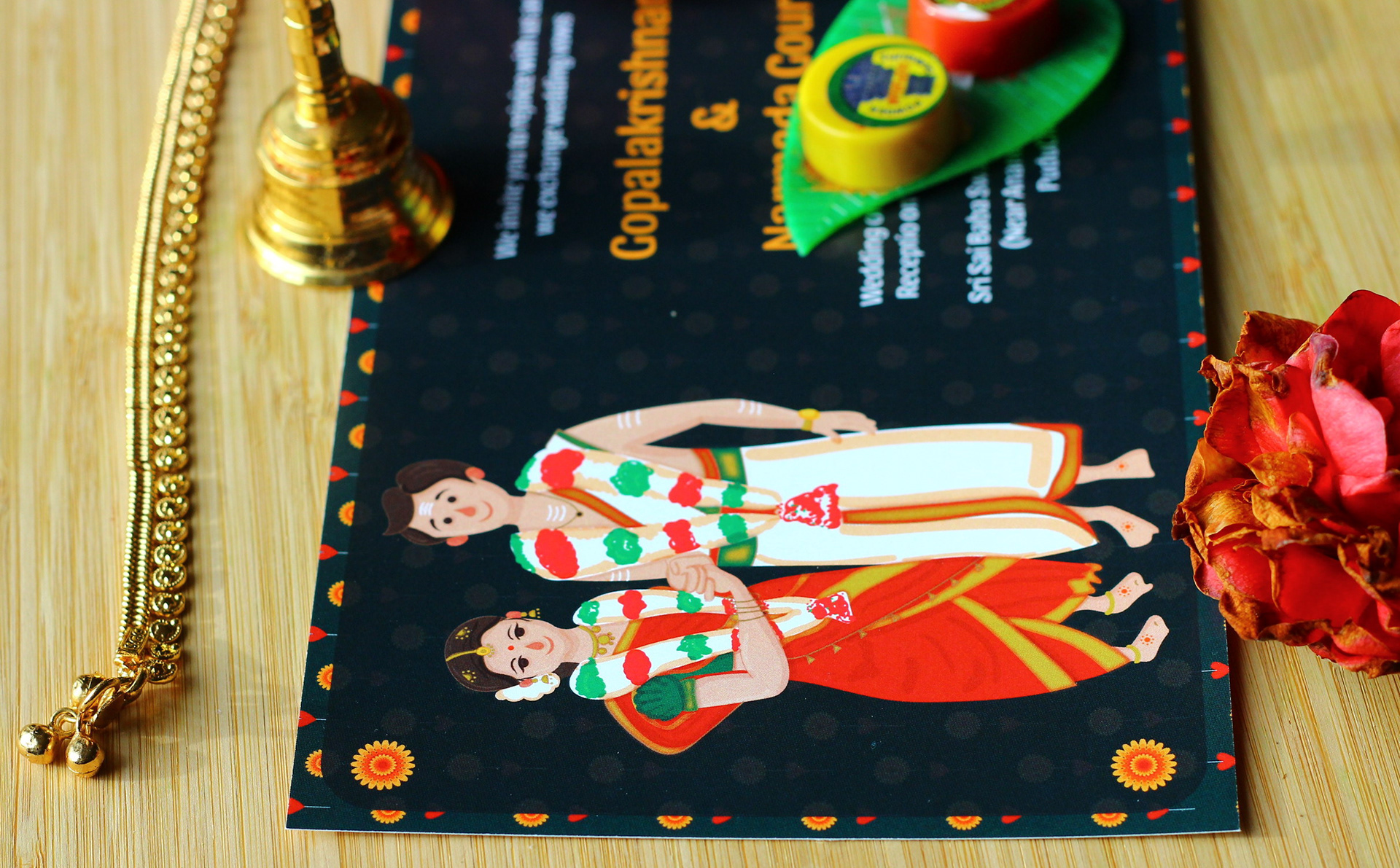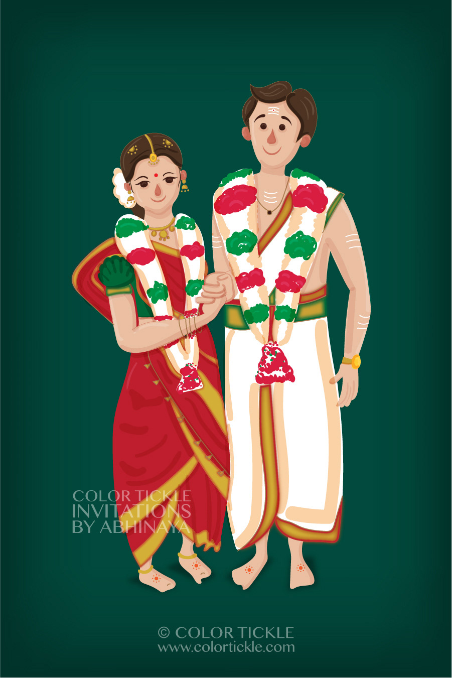 A Tambrahm - Iyer style invite illustrated to depict a modern yet traditional couple, who hold the values from best of both worlds