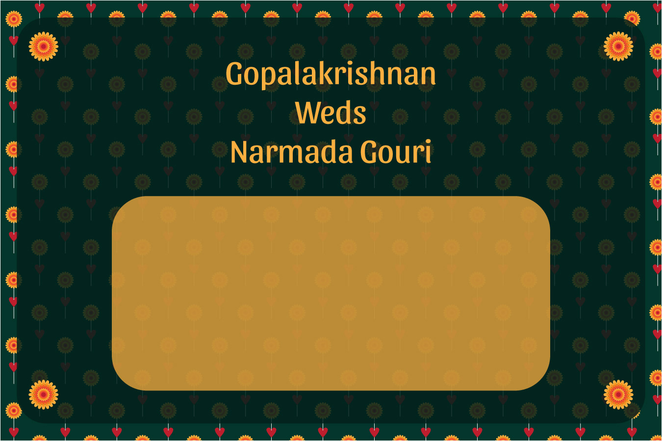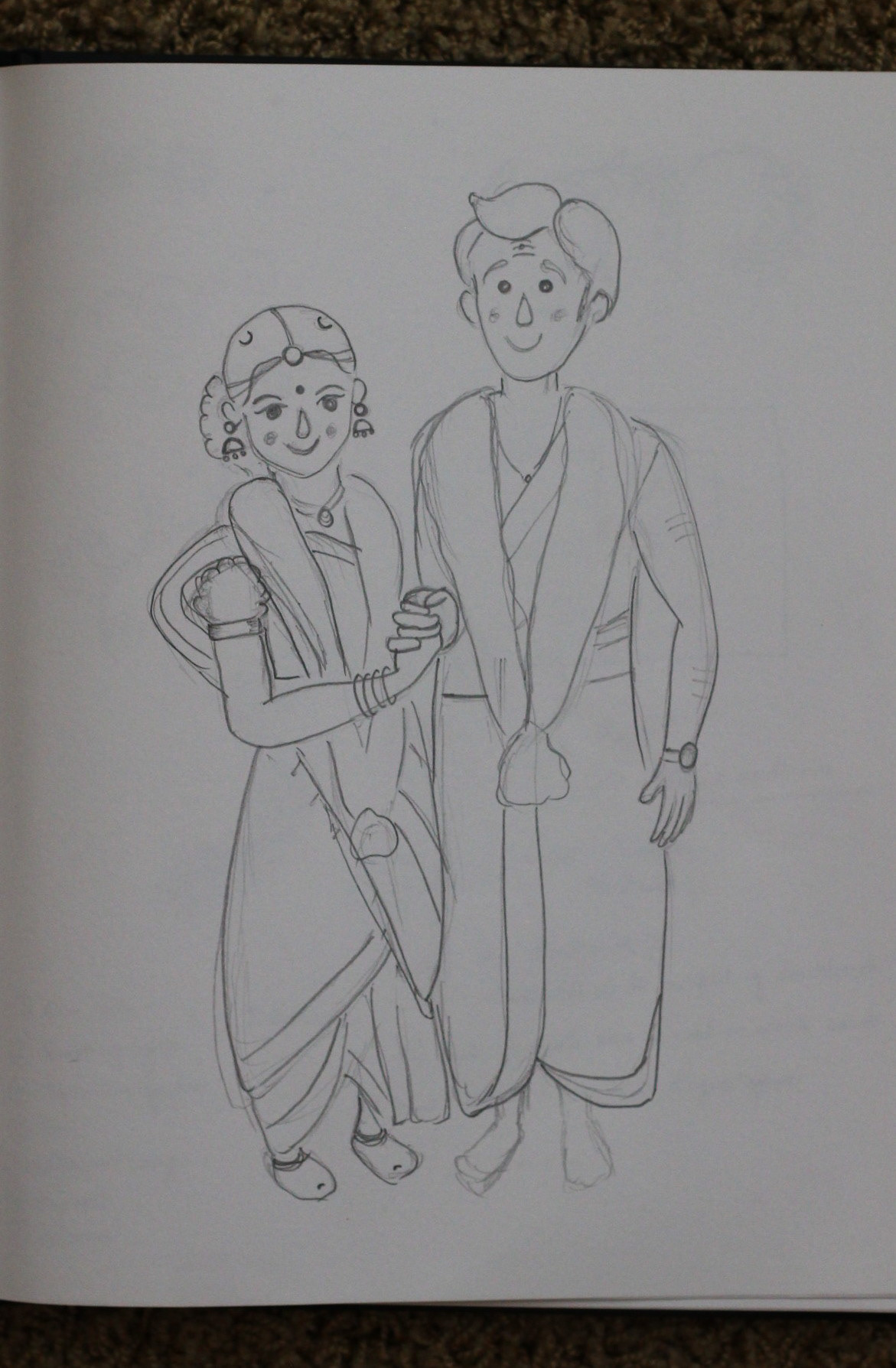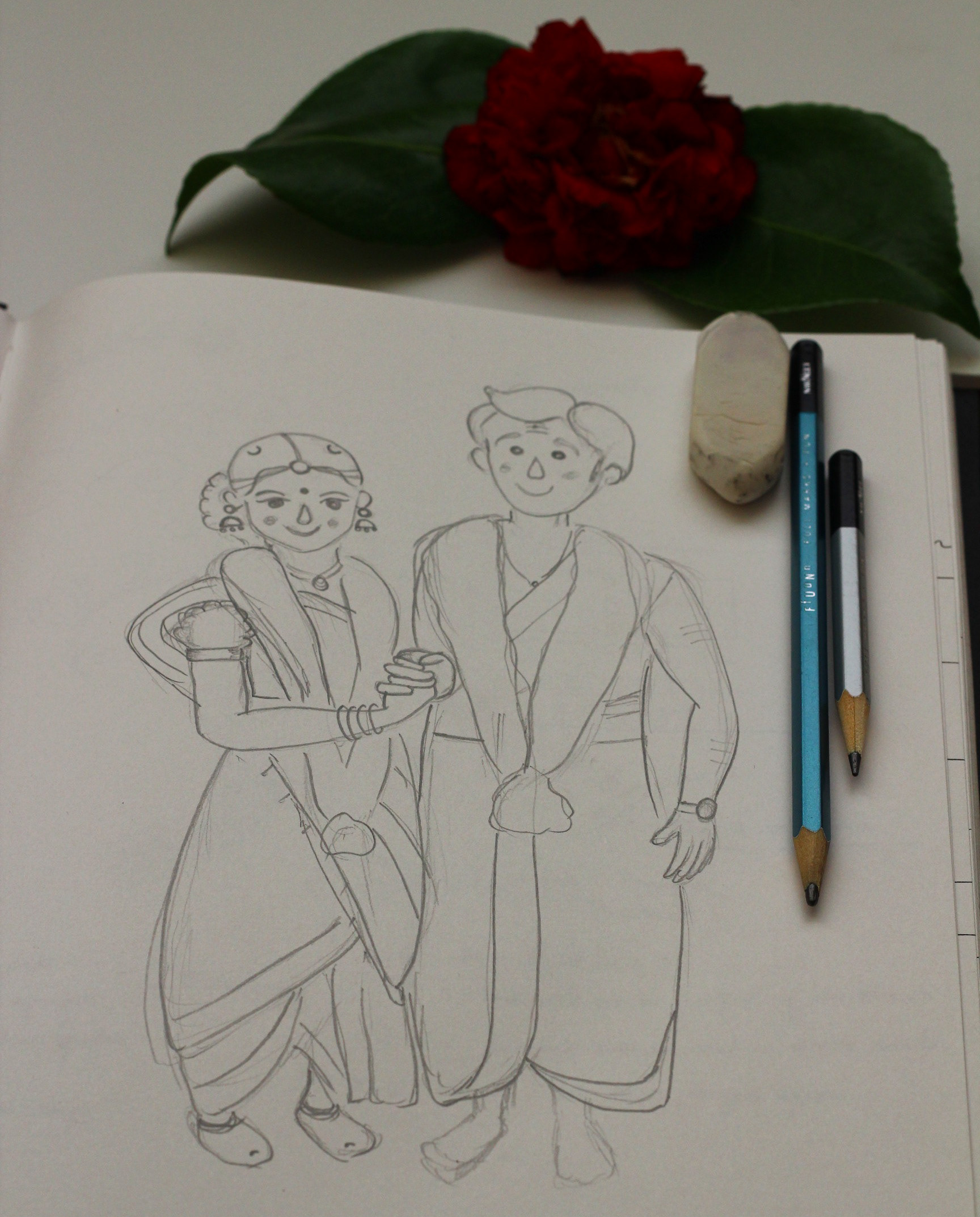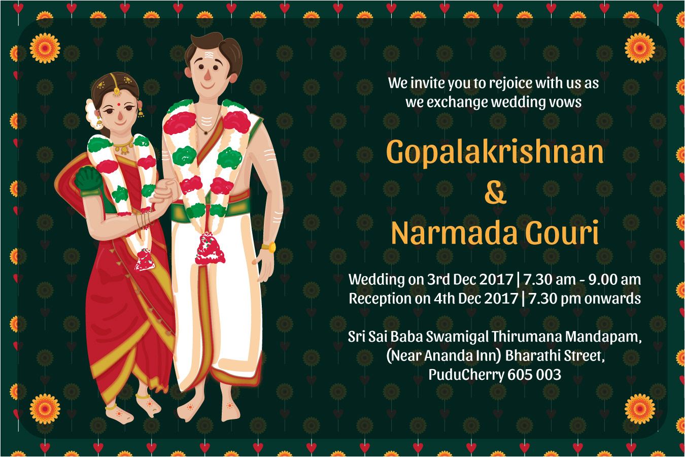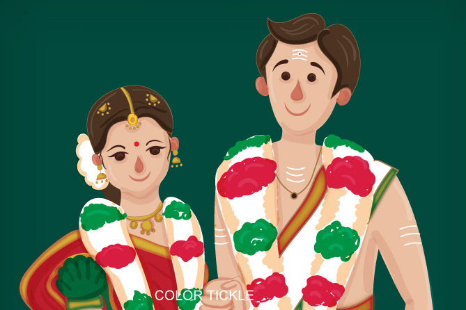 A Tambrahm - Iyer style invite illustrated to depict a modern yet traditional couple, who hold the values from best of both worlds