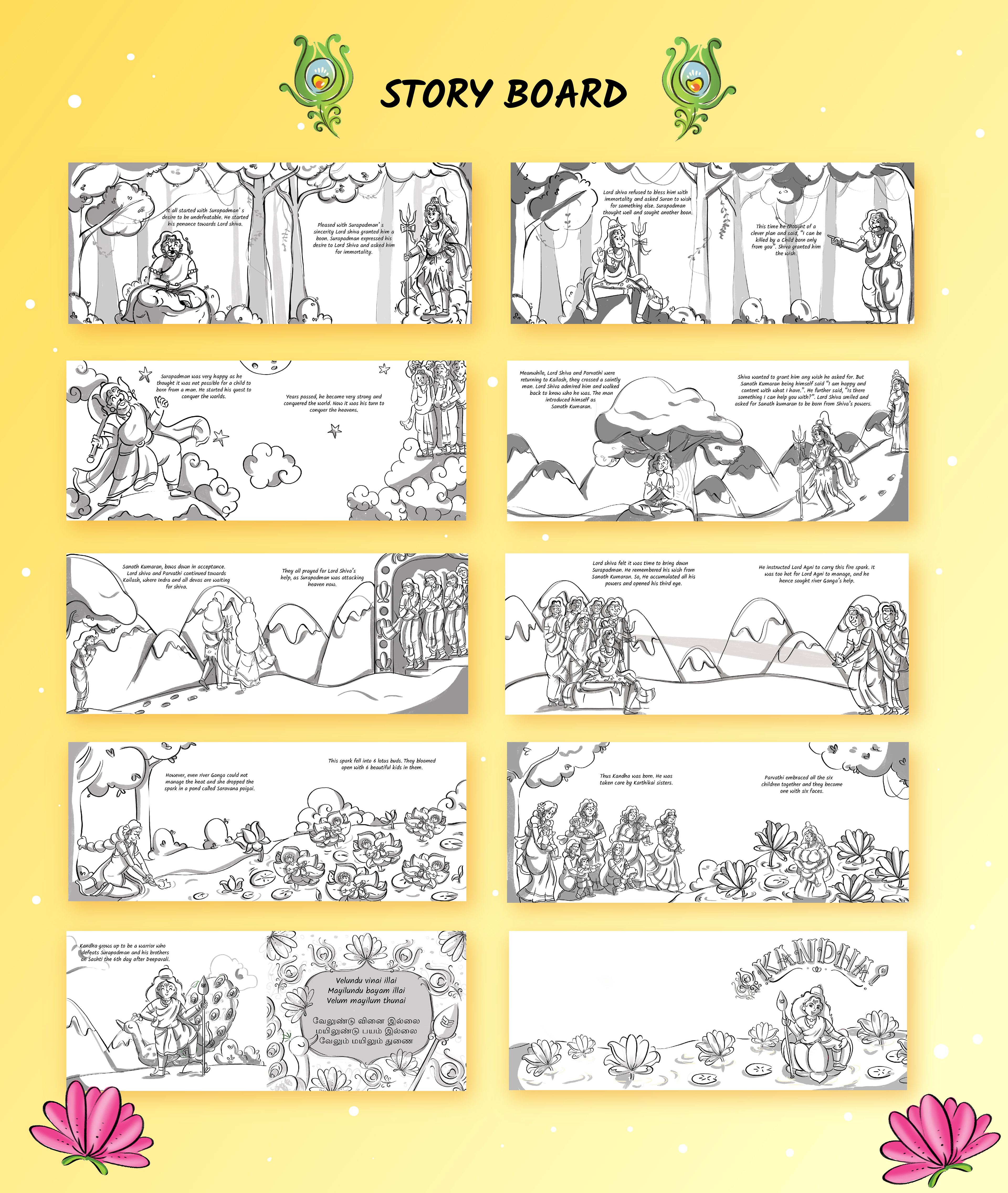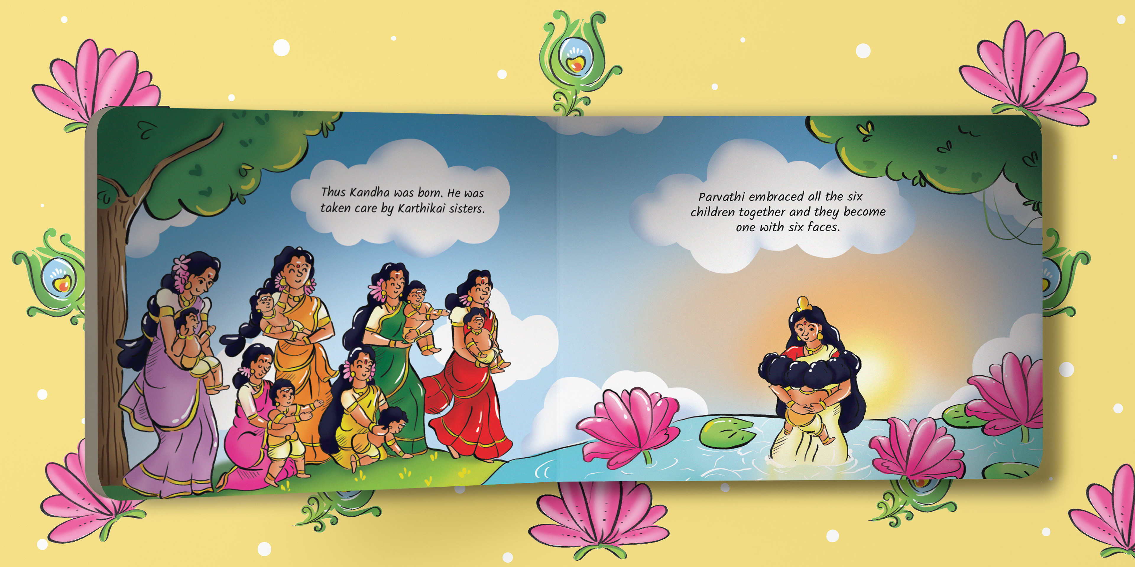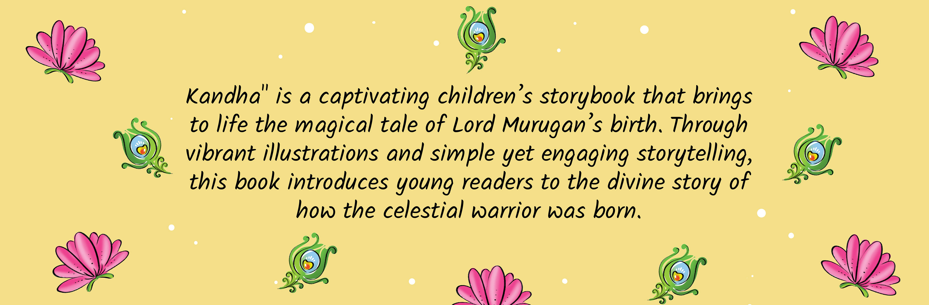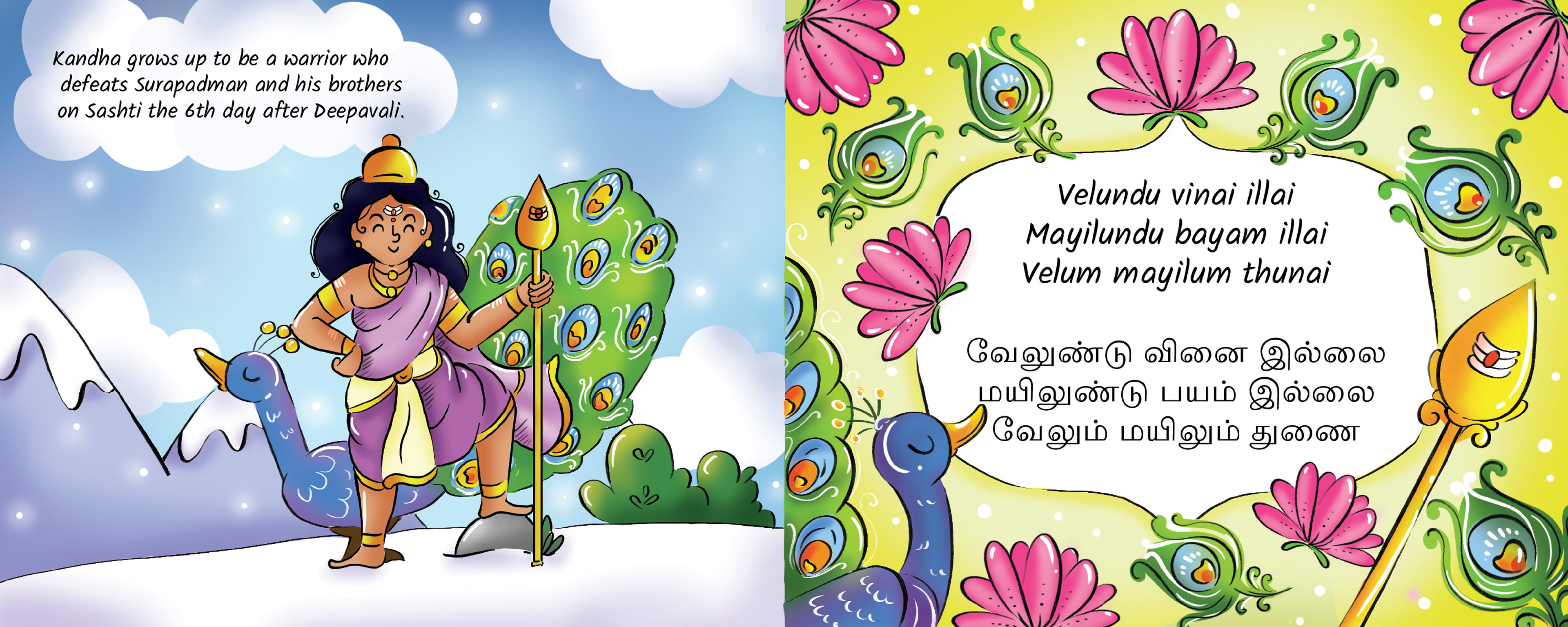 This is the tale of Lord Kandha, the beloved god of wisdom, courage, and kindness. Born from a spark of light created by Lord Shiva and nurtured by celestial beings, Kandha’s arrival was no ordinary event. With every page, these colorful illustrations will bring Kandha’s story to life.