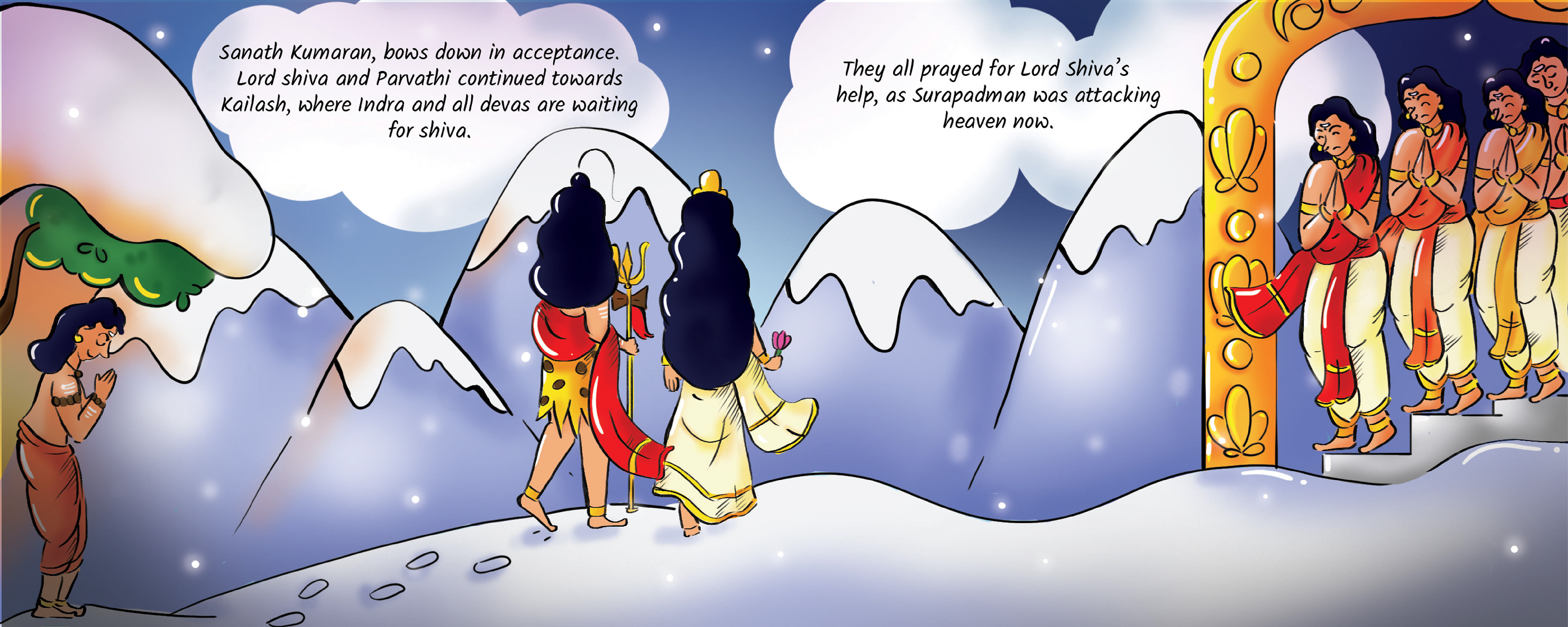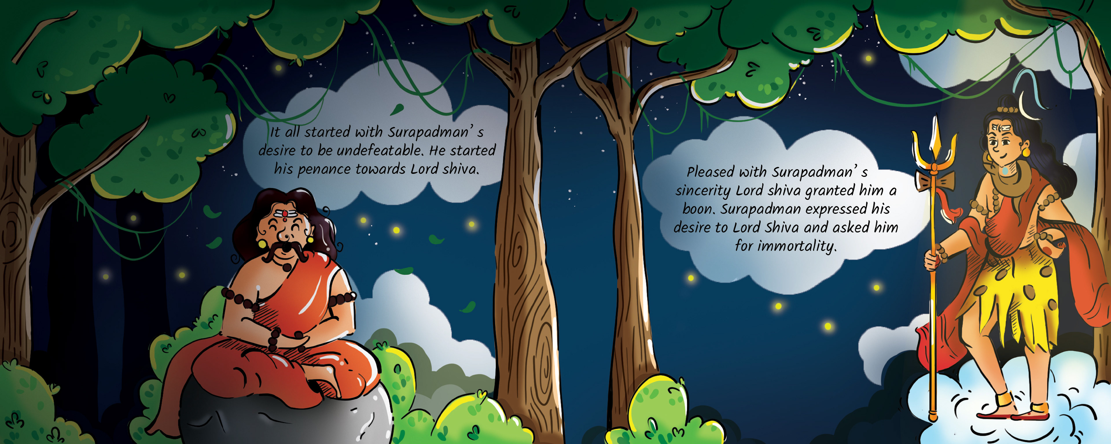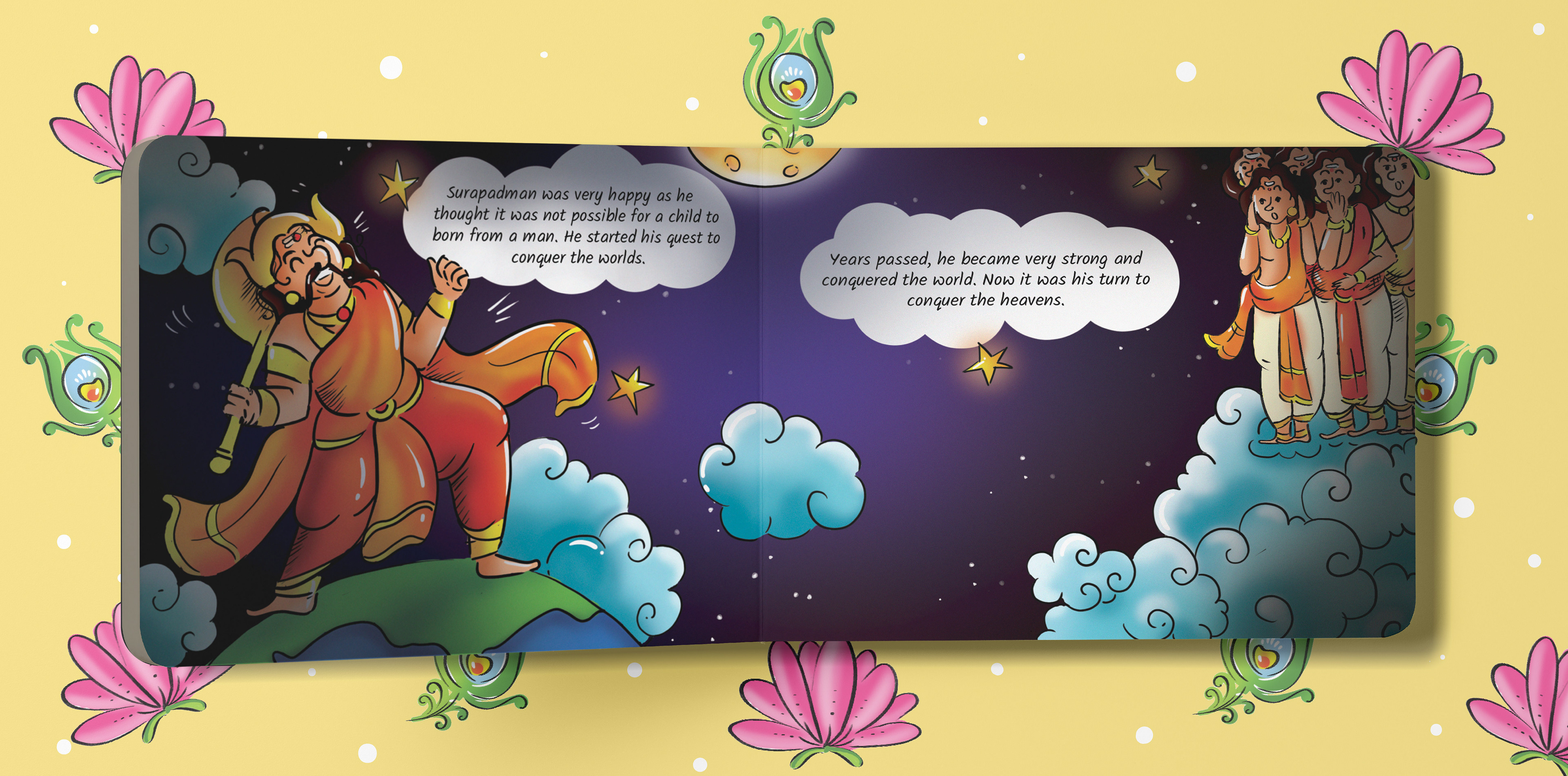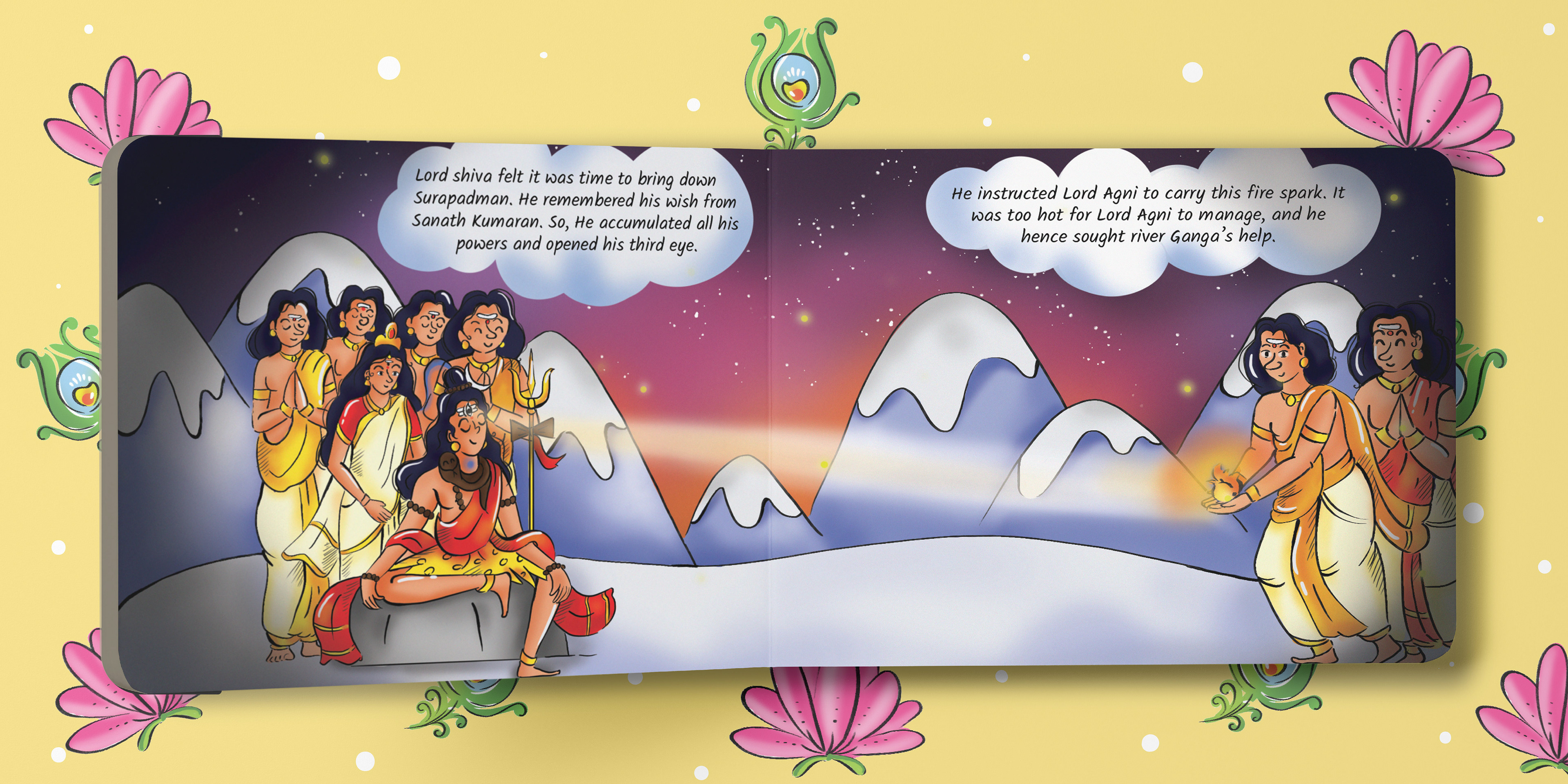This is the tale of Lord Kandha, the beloved god of wisdom, courage, and kindness. Born from a spark of light created by Lord Shiva and nurtured by celestial beings, Kandha’s arrival was no ordinary event. With every page, these colorful illustrations will bring Kandha’s story to life.