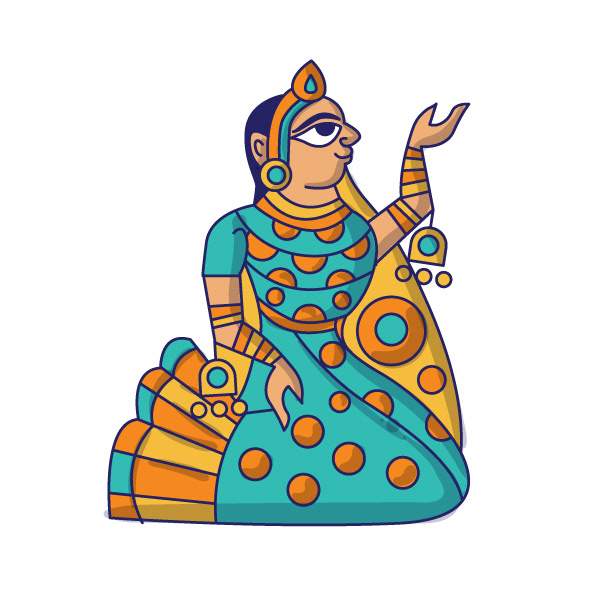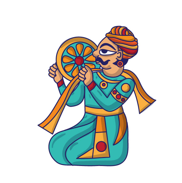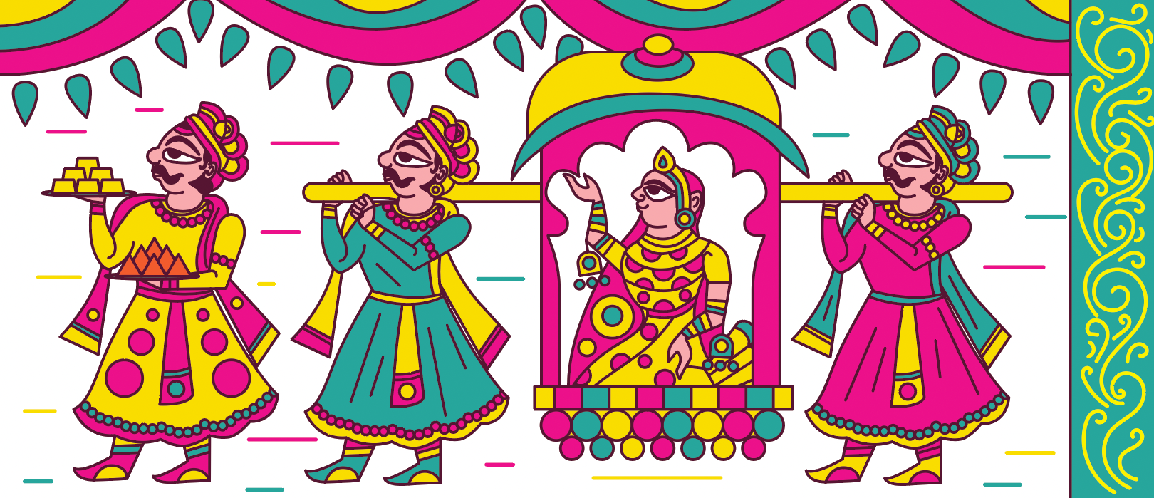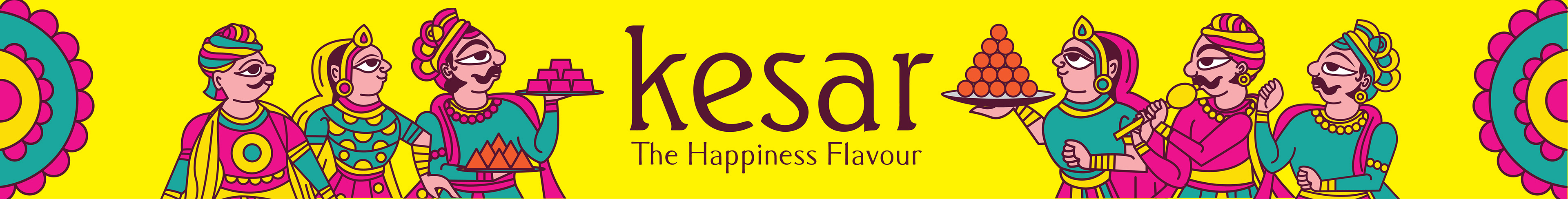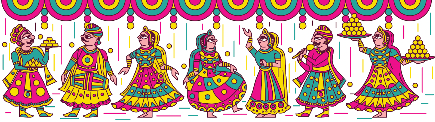 Digital wall mural illustrations of sweets in Indian weddings and events inspired by Rajasthani Phad Paintings for Kesar, a mithai boutique in Jaipur, has a long history of serving gourmet sweets worldwide.