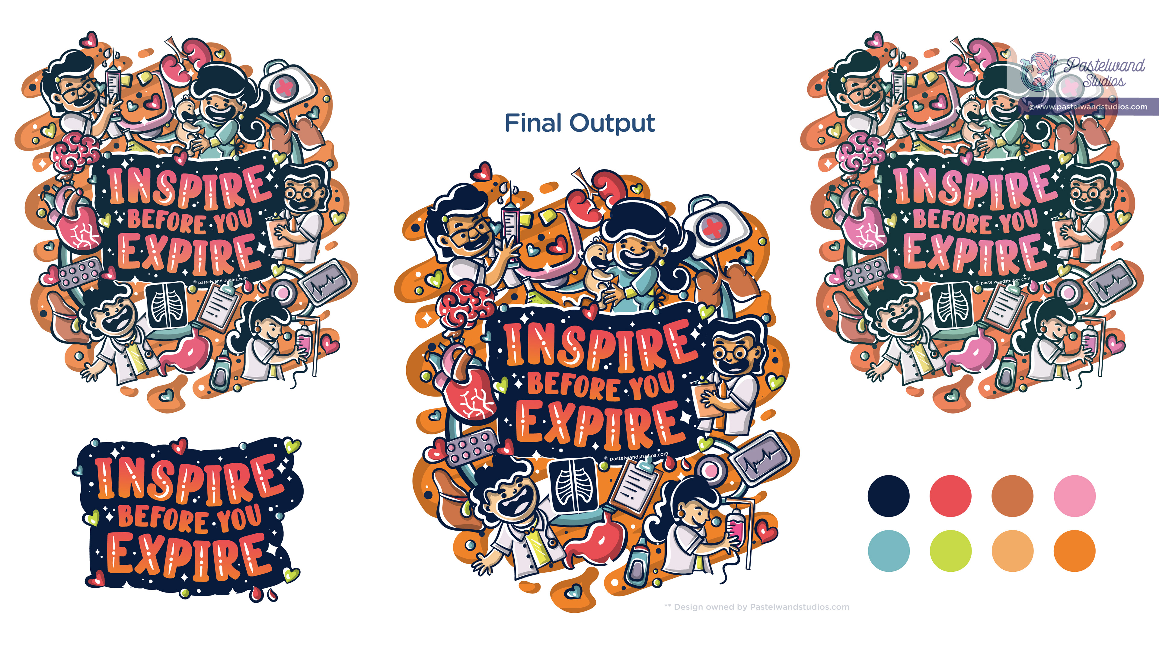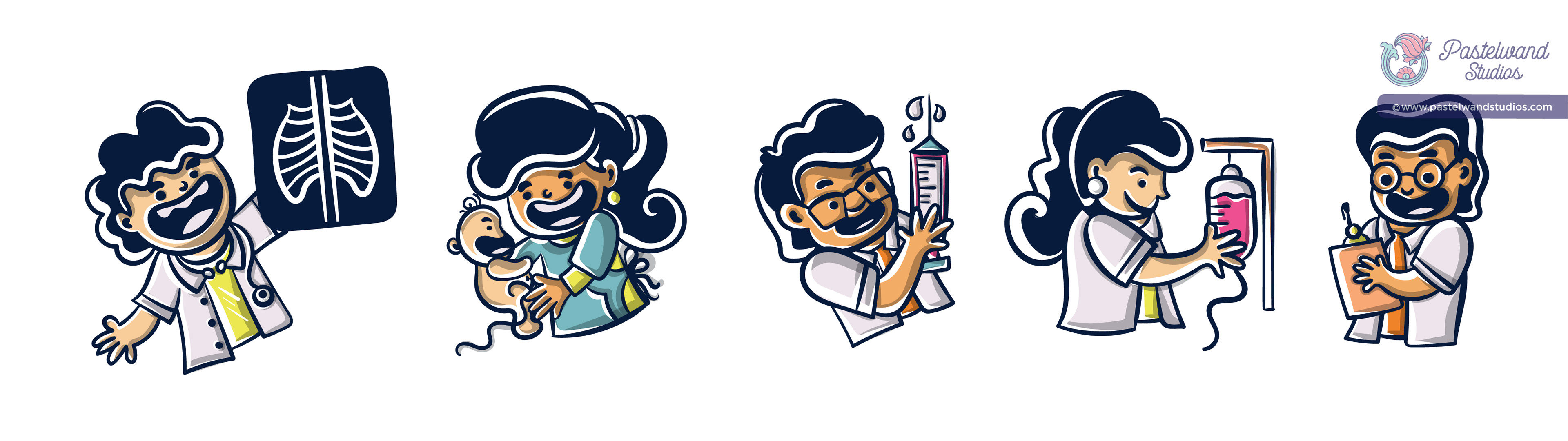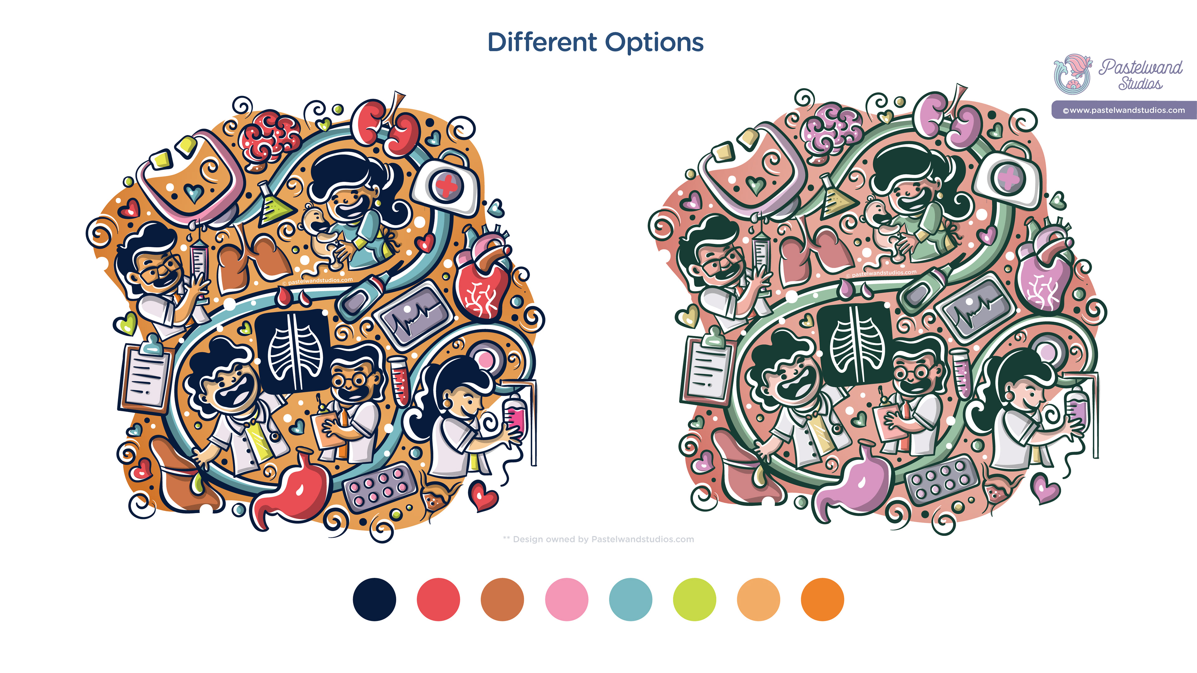 The clients are doctors who are currently doing their MBBS. They are planning an event at their campus and approached us since they needed an illustration with a medical theme. The customer was very happy with a previous merchandise project we had completed and wanted to stick with the same style but incorporate their own ideas. They desired to include many elements linked to medicine, such as gynaecologists, pulmonologists, anesthesiologists, organs such as the heart, brain, kidney, and stomach, as well as instruments such as stethoscopes and ECG monitors.