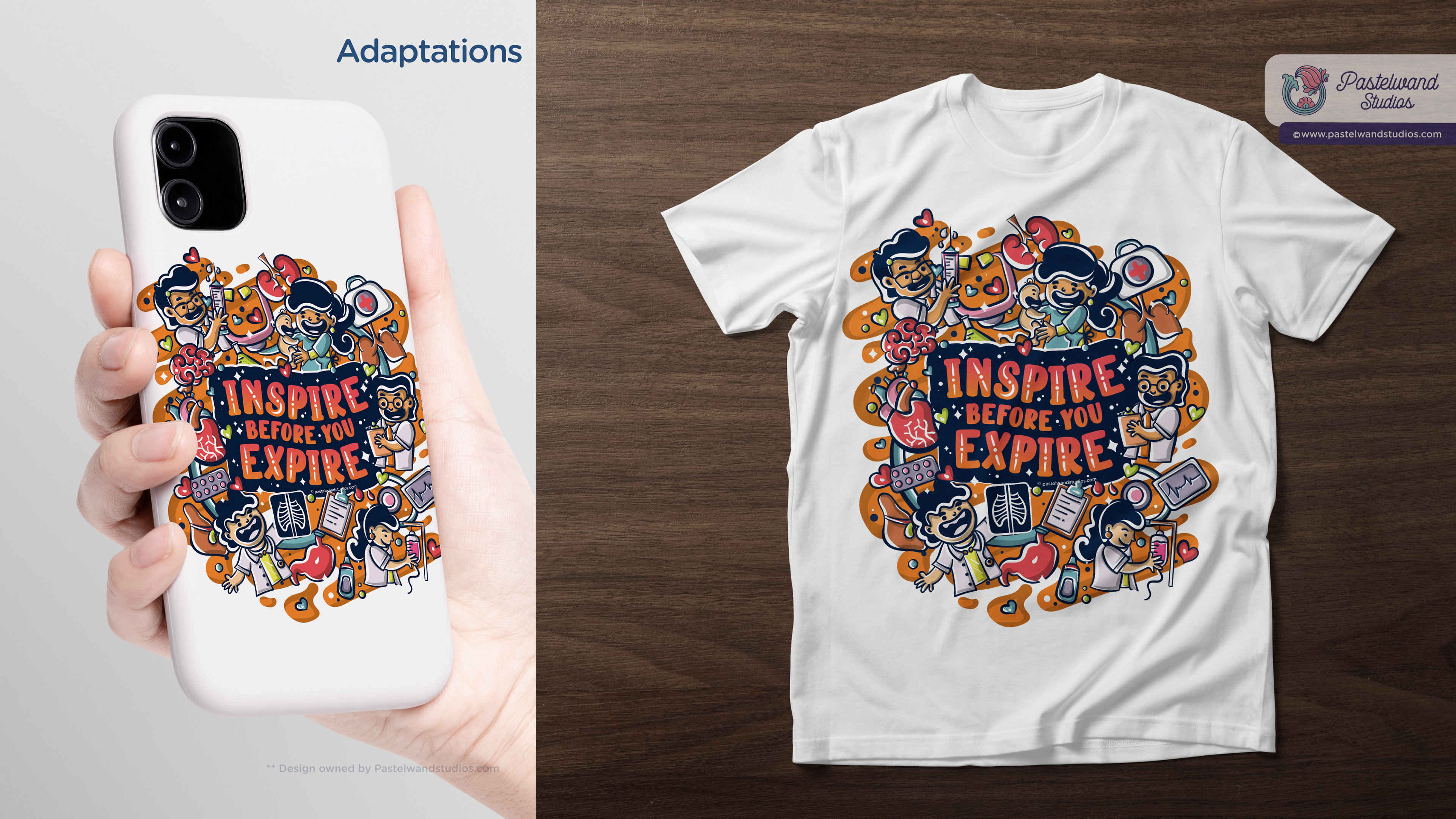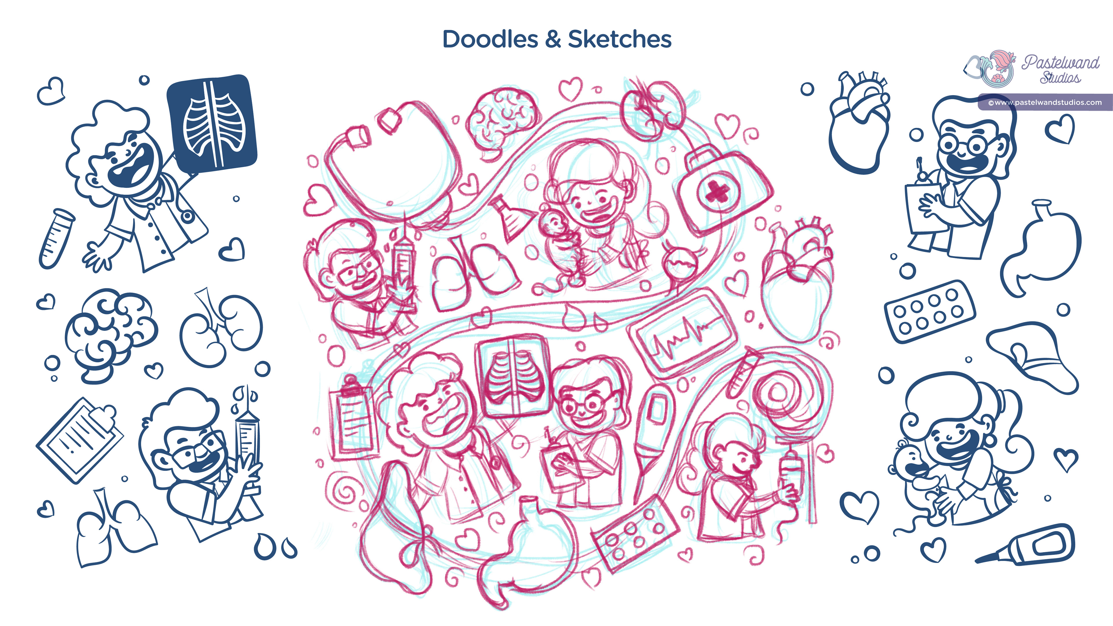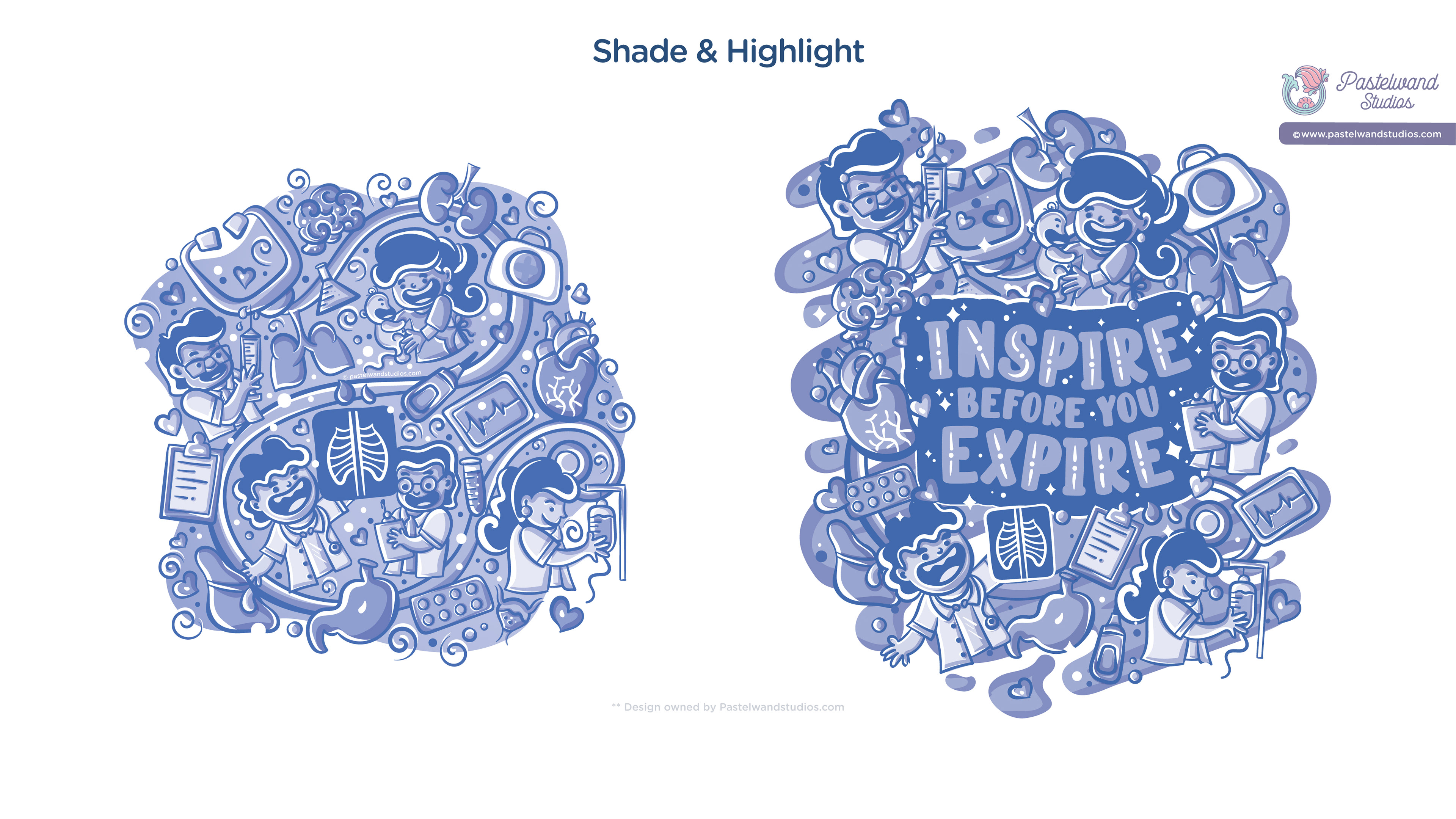 The clients are doctors who are currently doing their MBBS. They are planning an event at their campus and approached us since they needed an illustration with a medical theme. The customer was very happy with a previous merchandise project we had completed and wanted to stick with the same style but incorporate their own ideas. They desired to include many elements linked to medicine, such as gynaecologists, pulmonologists, anesthesiologists, organs such as the heart, brain, kidney, and stomach, as well as instruments such as stethoscopes and ECG monitors.