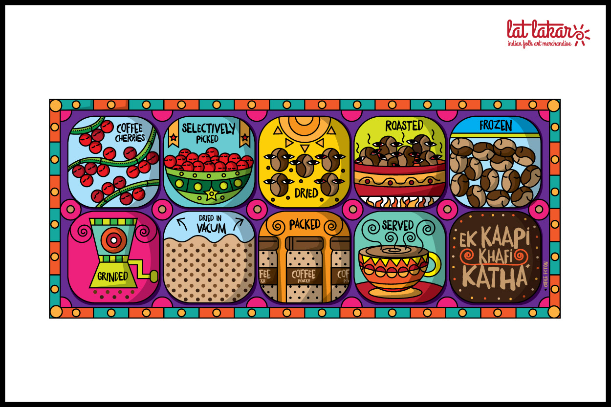 Traditional Bengali Patwa art is used to depict the process of how a plant becomes a steaming hot cuppa on our tables. We drink a lot of coffee and that is how we function. This is a small tribute to the great beverage.