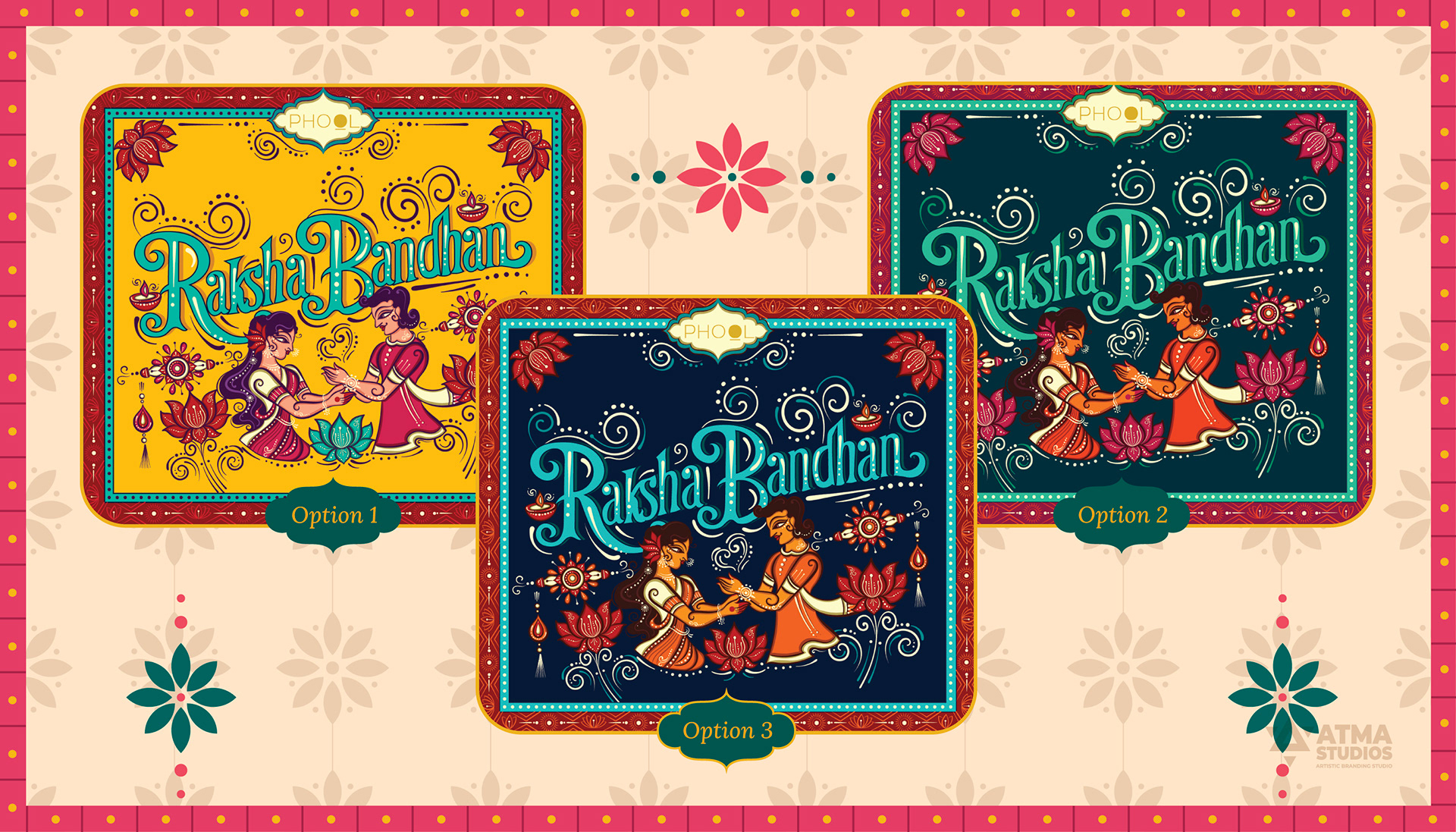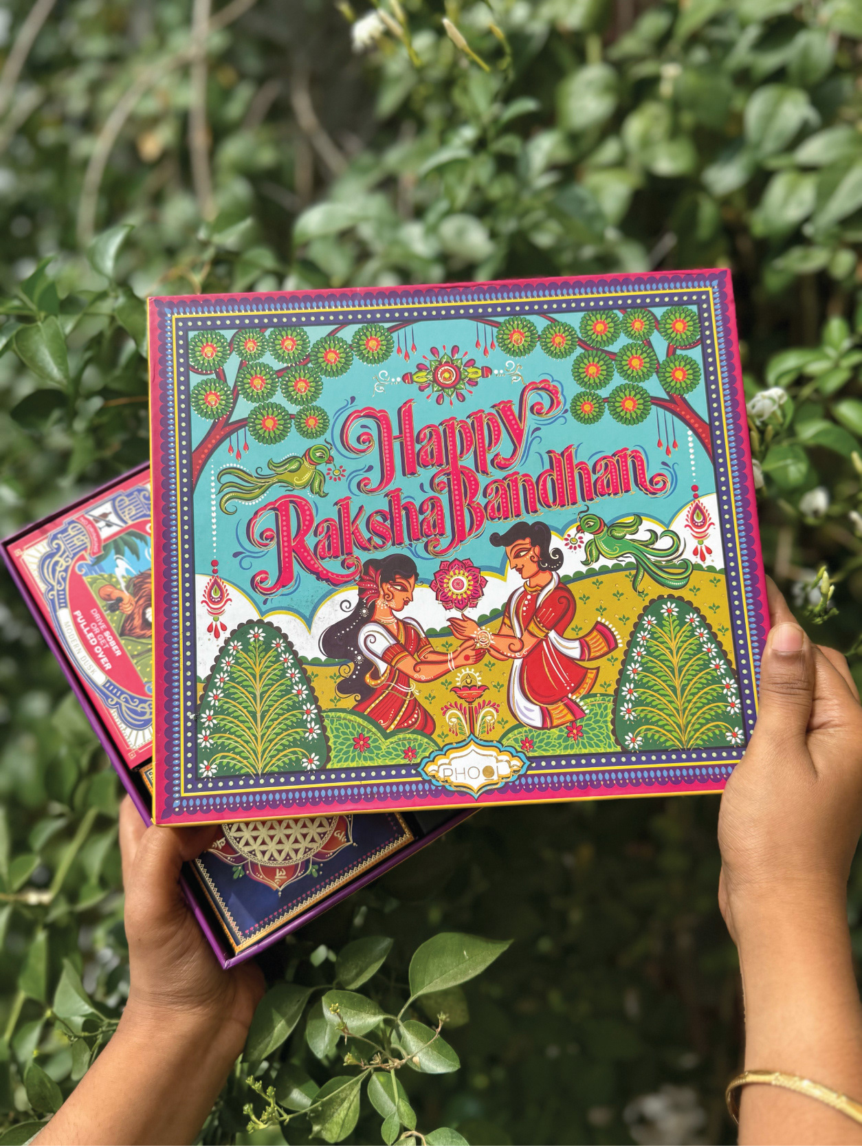 Phool’s Raksha Bandhan–themed gift box, designed by Atma Studios, reimagines sibling love and celebration through the vibrant lens of Neo-Bengal folk art. The illustration blends rich cultural motifs, expressive forms, and traditional storytelling to honor Indian heritage. Rooted in sustainable luxury, Phool upcycles temple flowers into eco-friendly products, embodying a harmony of tradition, craftsmanship, and conscious living. The packaging reflects elegance and cultural depth, transforming the art of gift-giving into a joyful and meaningful experience.