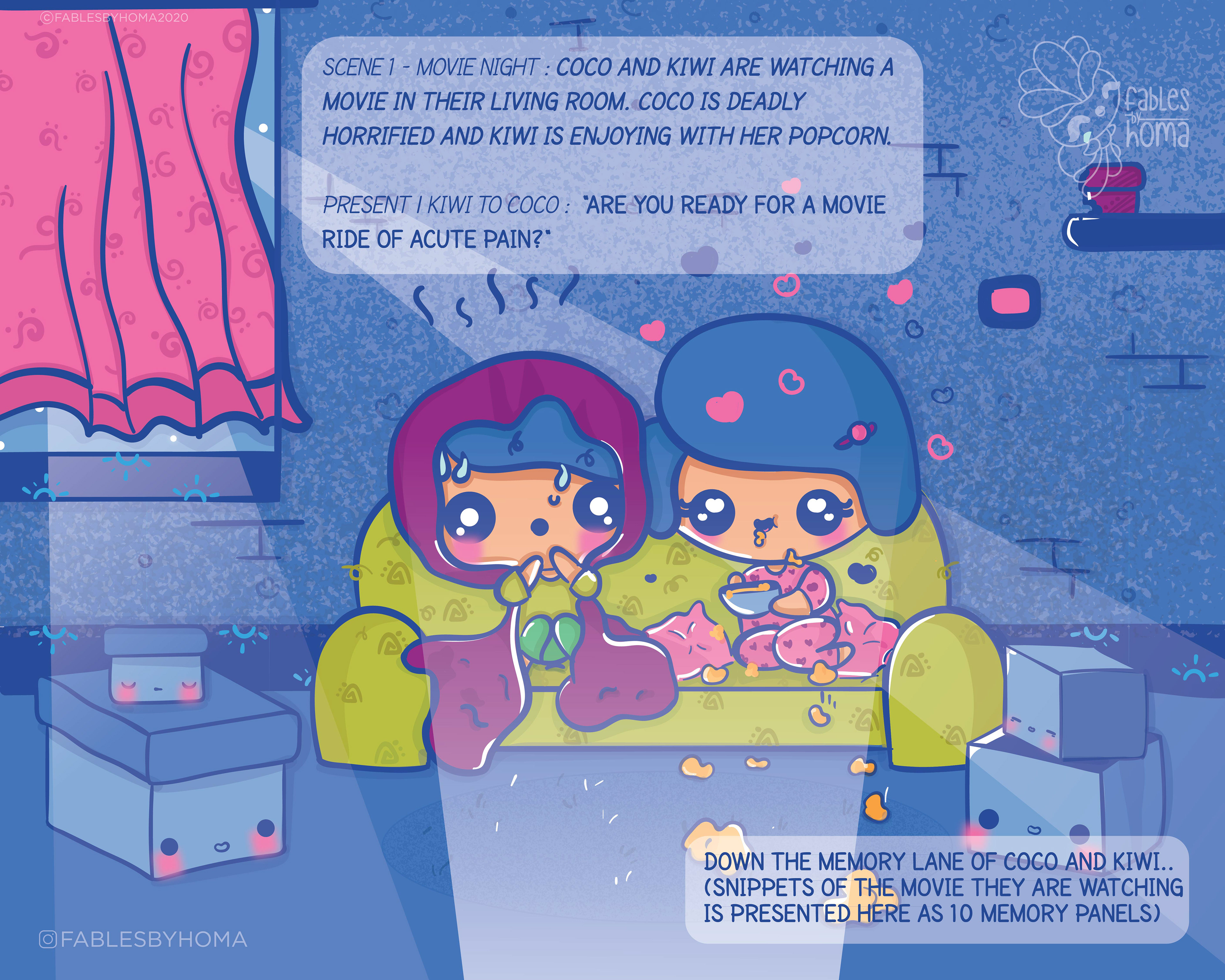 Coco and Kiwi are watching a horror movie in their living room. The horror movie is a cute version of Coco and Kiwi's memories.