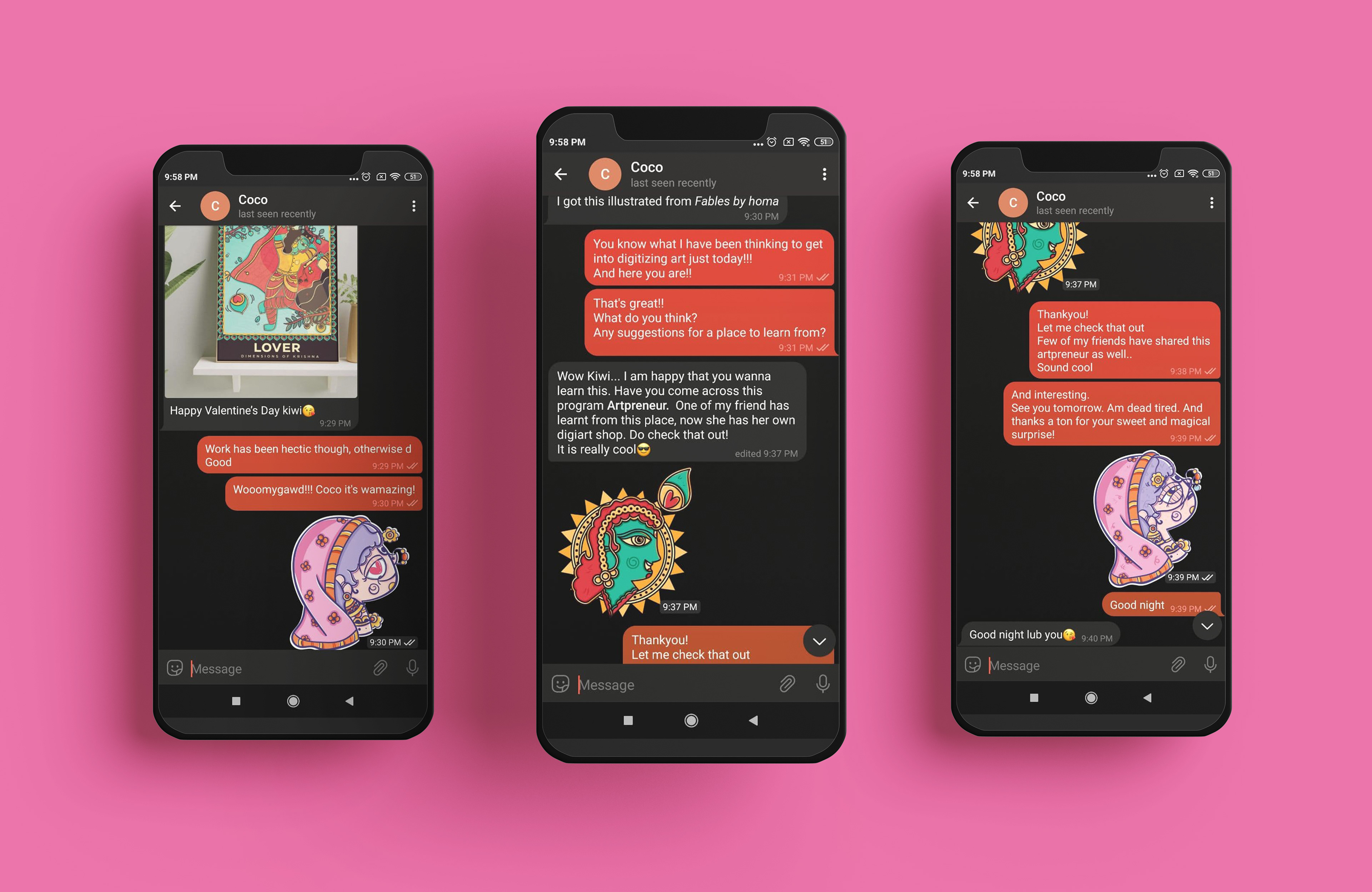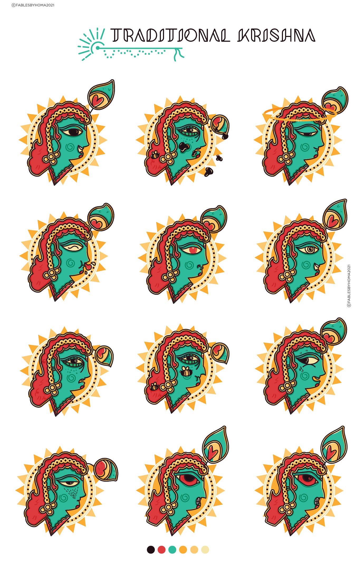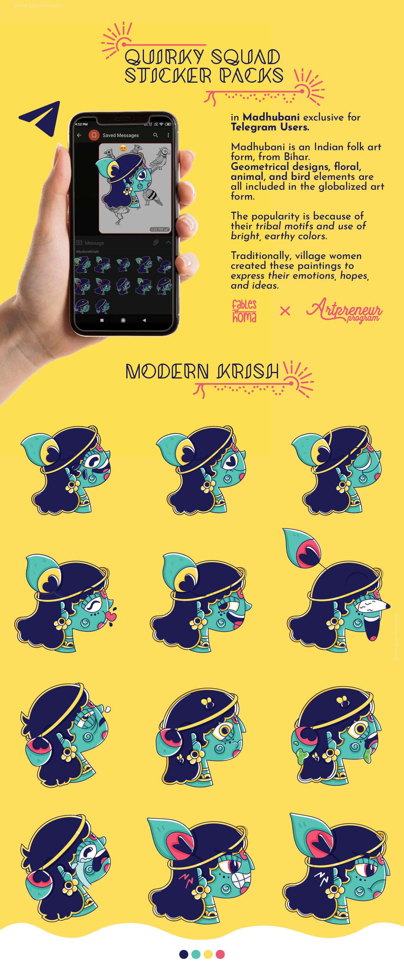 in Madhubani is an Indian folk art form, from Bihar. Geometrical designs, floral, animal, and bird elements are all included in the globalized art form. In this project, we have experimented with the nature of art form by adding curves to rigid geometric shapes. Traditionally, village women created these paintings to express their emotions, hopes, and ideas. We wanted to continue this tradition of emoting via stickers exclusive for telegram.
