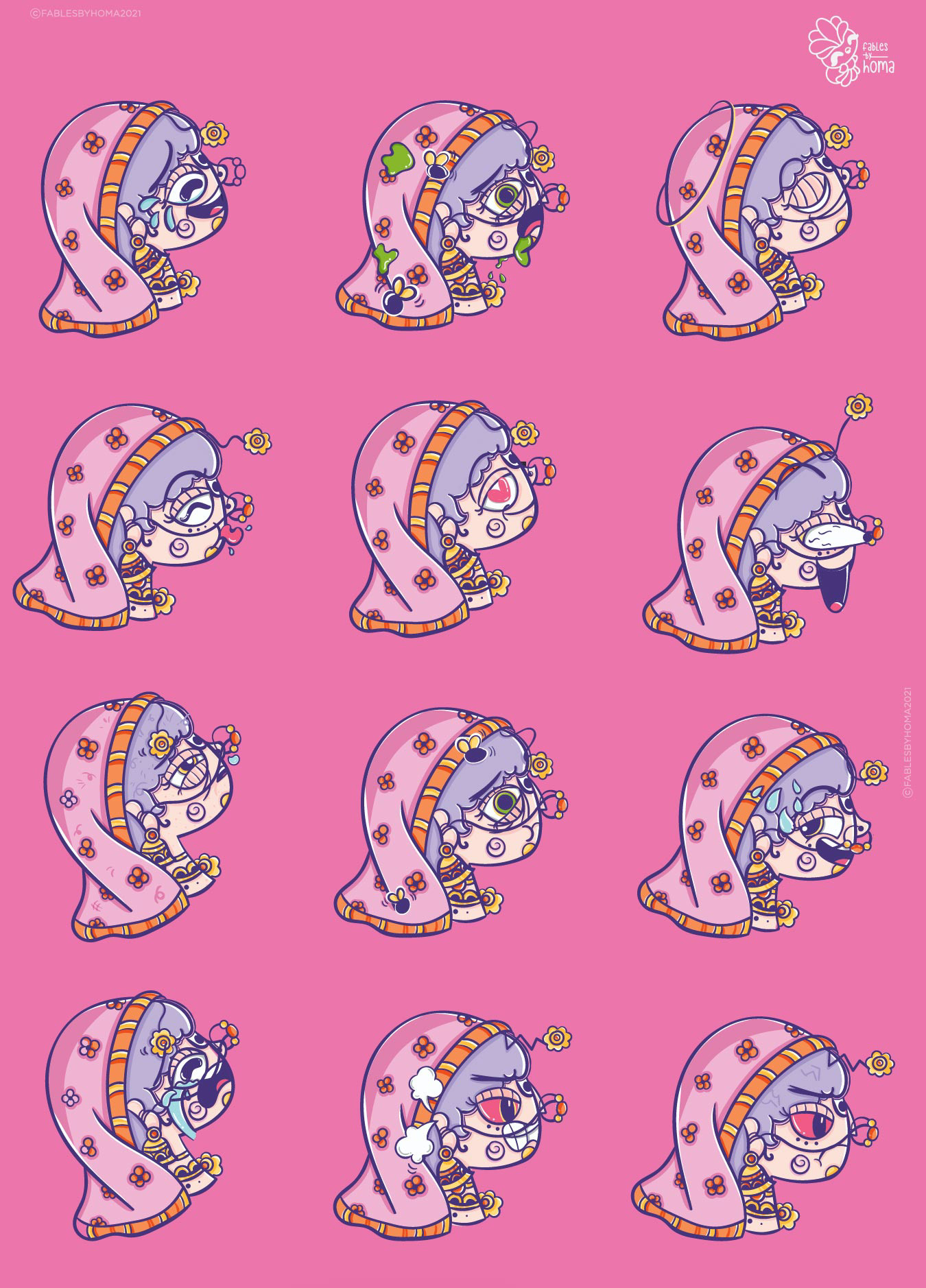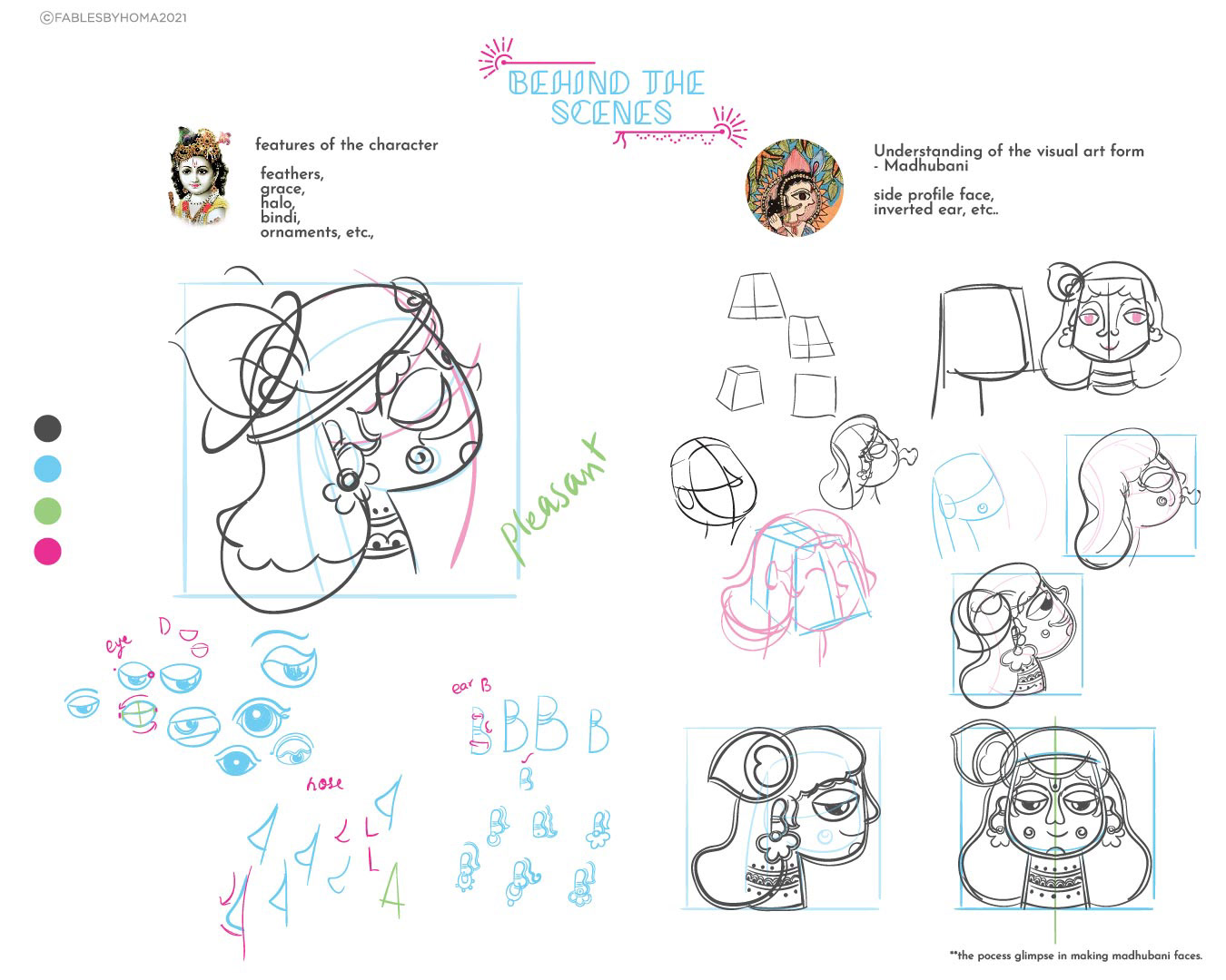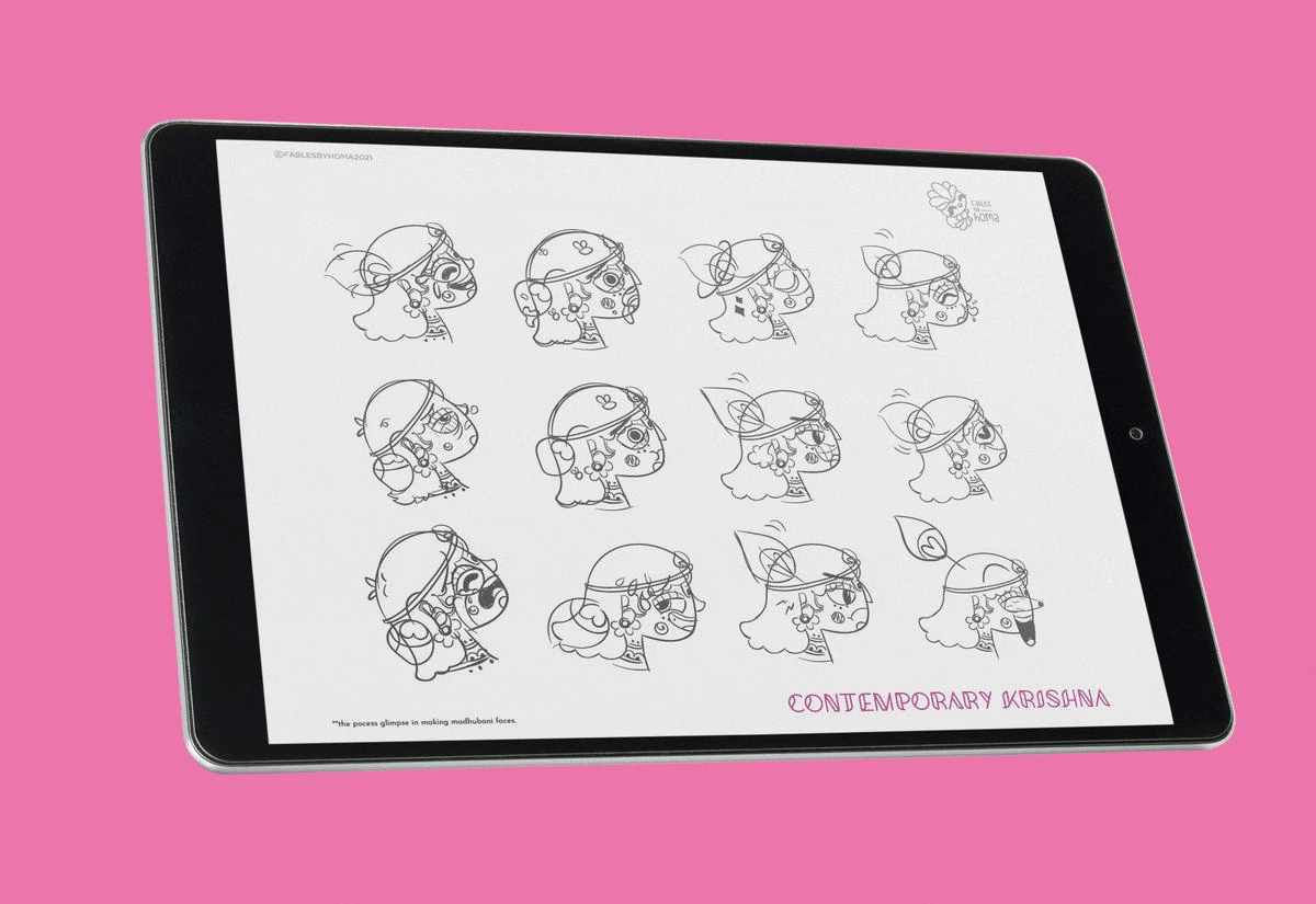 in Madhubani is an Indian folk art form, from Bihar. Geometrical designs, floral, animal, and bird elements are all included in the globalized art form. In this project, we have experimented with the nature of art form by adding curves to rigid geometric shapes. Traditionally, village women created these paintings to express their emotions, hopes, and ideas. We wanted to continue this tradition of emoting via stickers exclusive for telegram.
