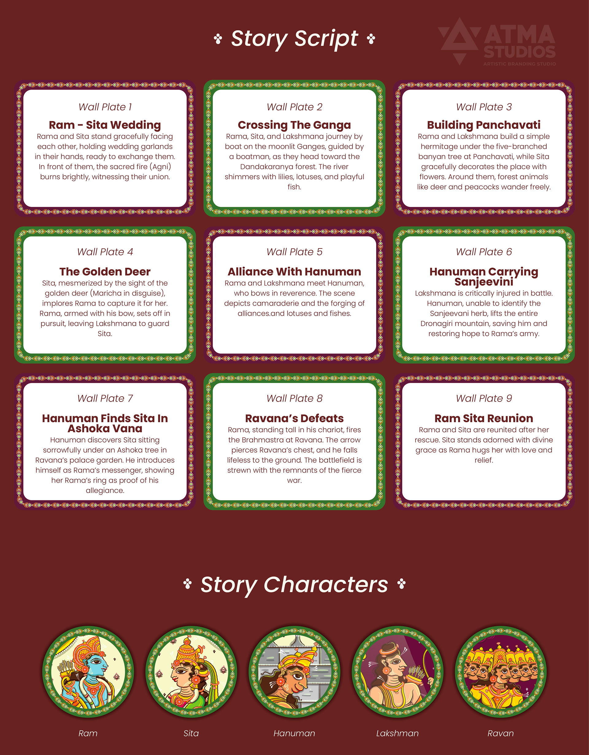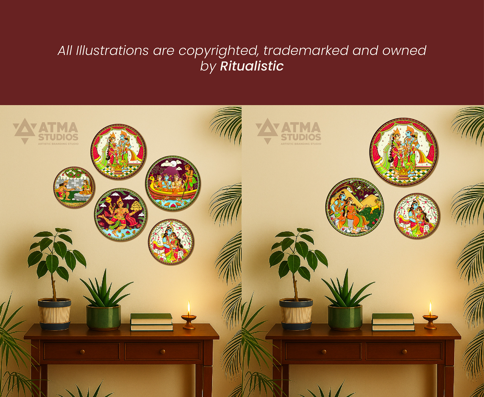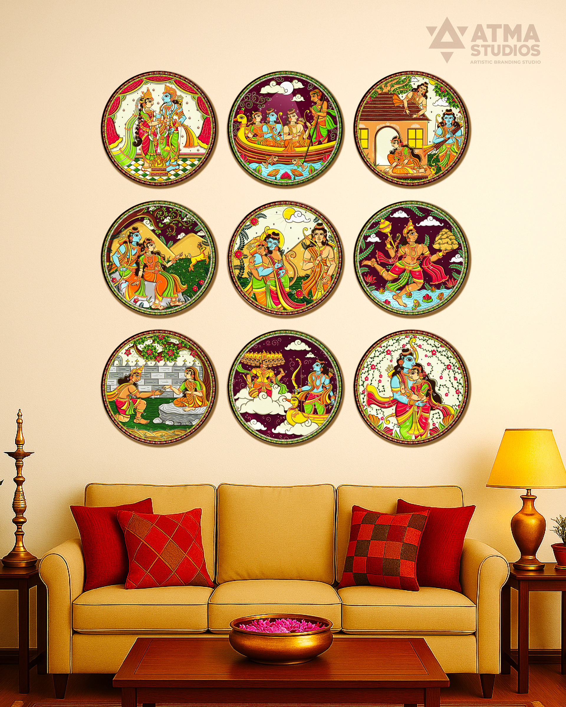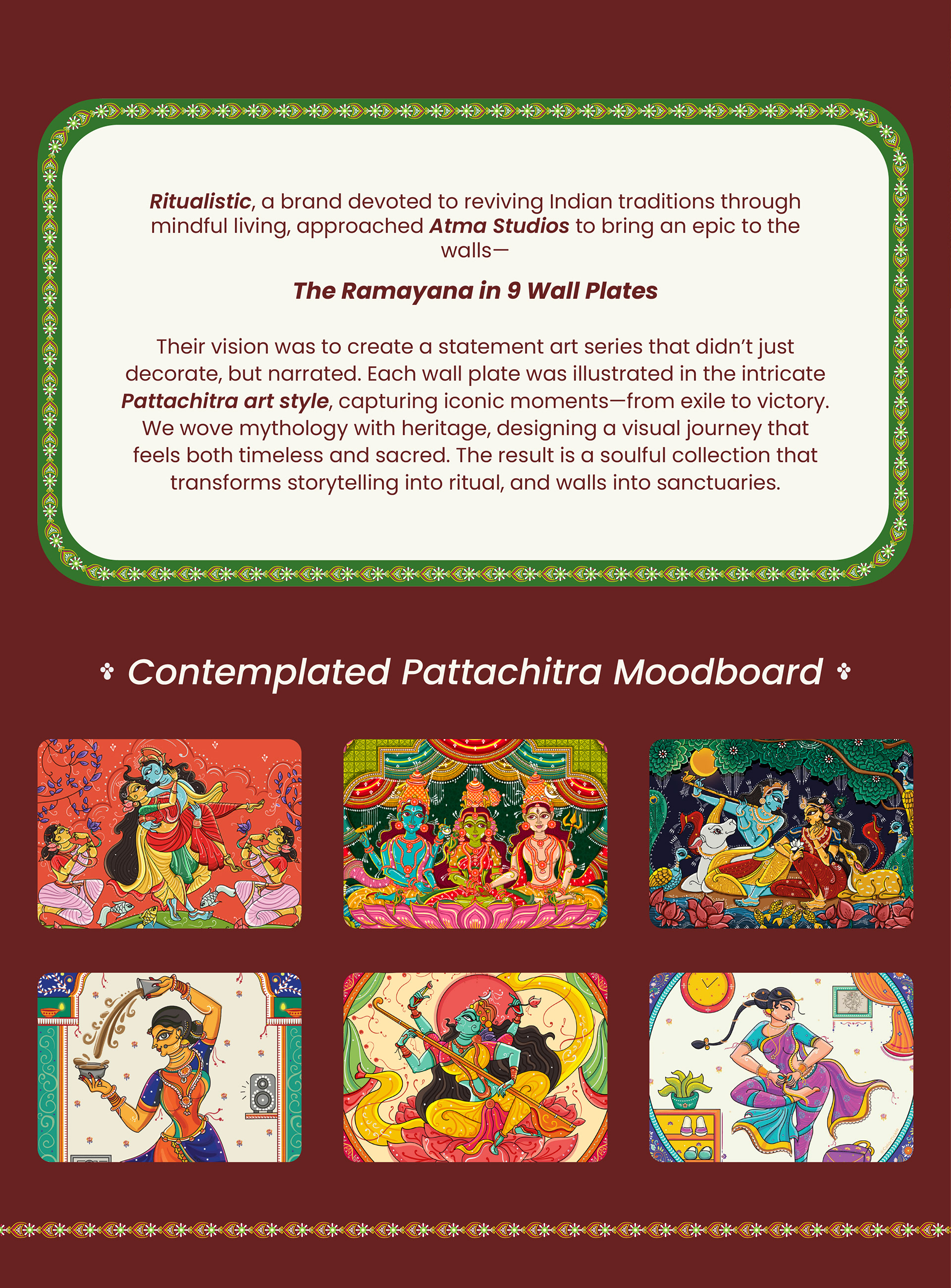 Ritualistic, a brand devoted to reviving Indian traditions through mindful living, approached Atma Studios to bring an epic to the walls— The Ramayana in 9 Wall Plates. Their vision was to create a statement art series that didn’t just decorate, but narrated. Each wall plate was illustrated in the intricate Pattachitra art style, capturing iconic moments—from exile to victory. We wove mythology with heritage, designing a visual journey that feels both timeless and sacred. The result is a soulful collection that transforms storytelling into ritual, and walls into sanctuaries.