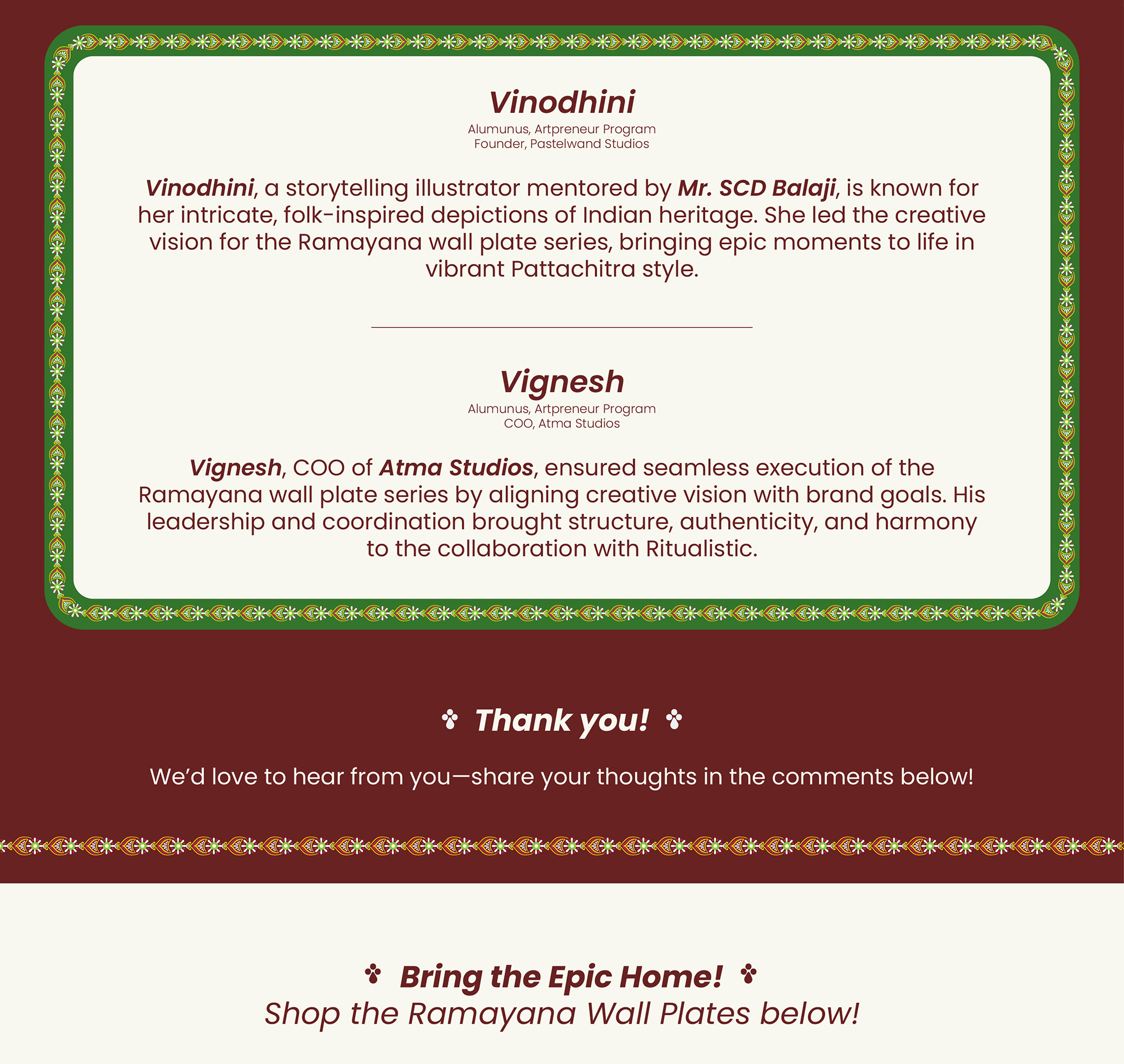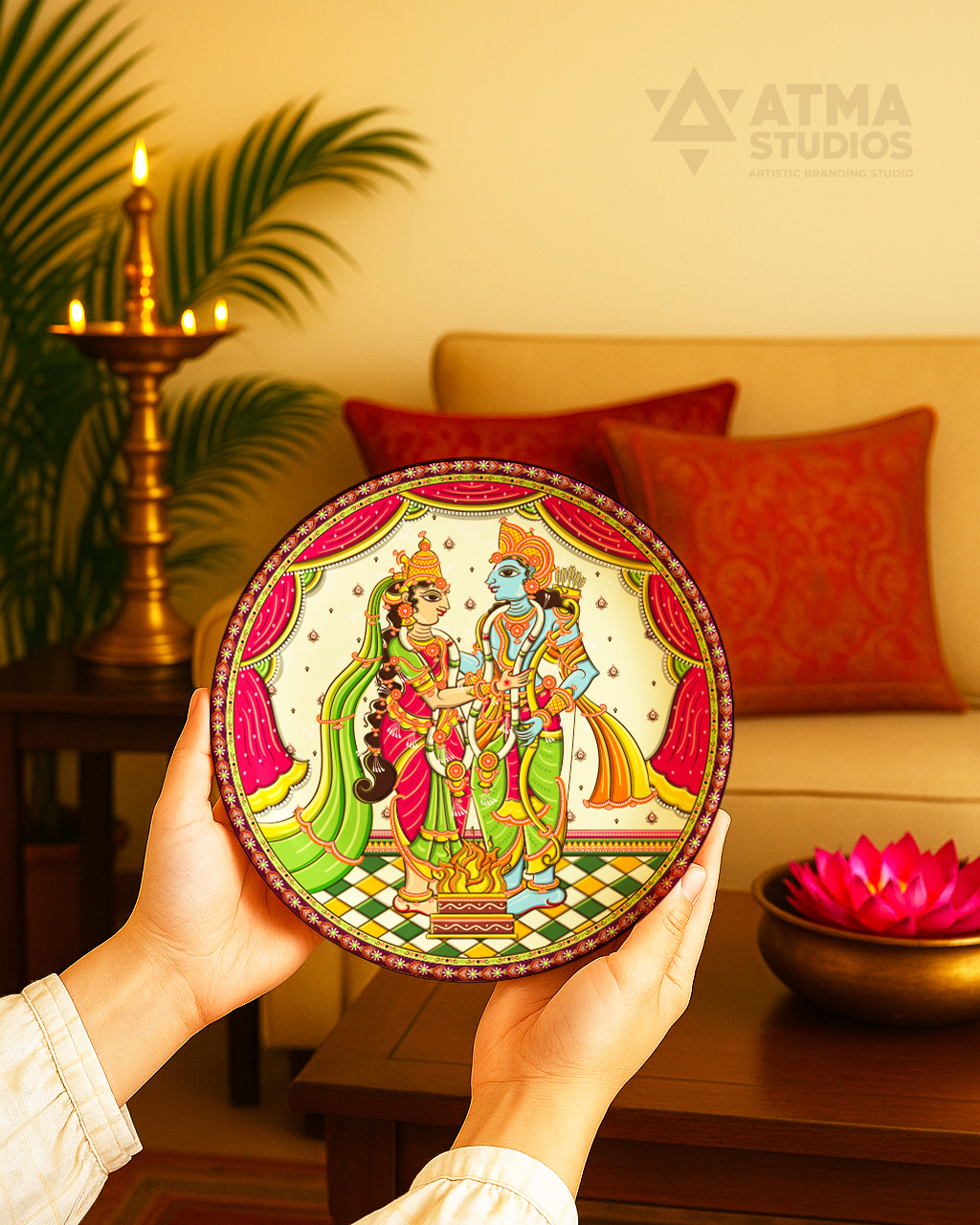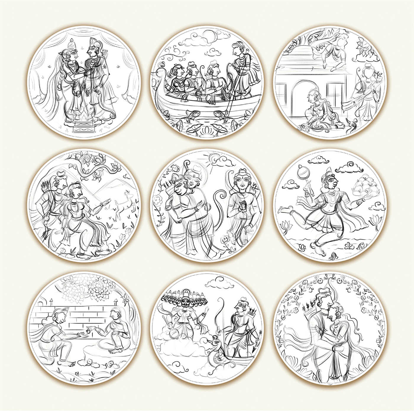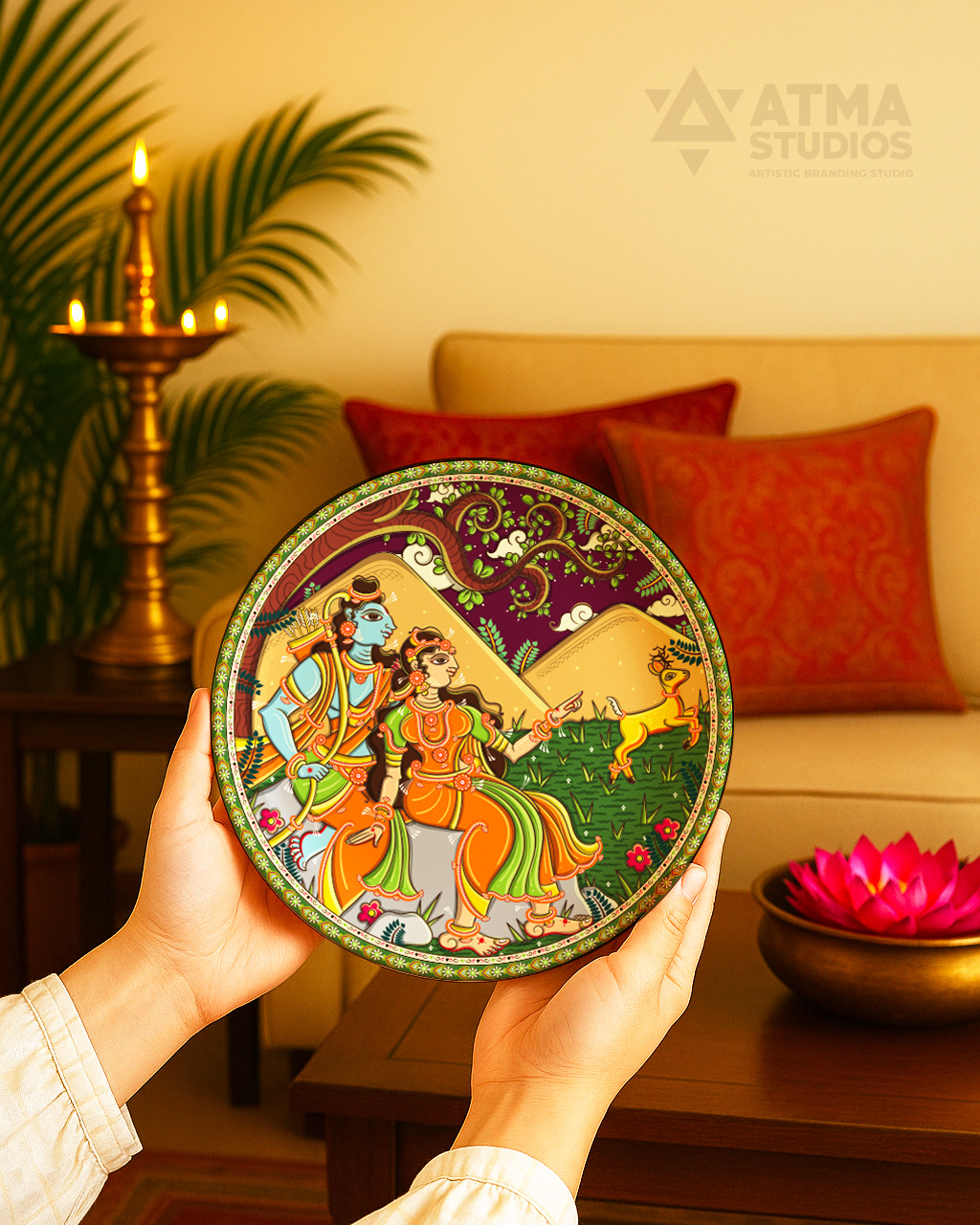 Ritualistic, a brand devoted to reviving Indian traditions through mindful living, approached Atma Studios to bring an epic to the walls— The Ramayana in 9 Wall Plates. Their vision was to create a statement art series that didn’t just decorate, but narrated. Each wall plate was illustrated in the intricate Pattachitra art style, capturing iconic moments—from exile to victory. We wove mythology with heritage, designing a visual journey that feels both timeless and sacred. The result is a soulful collection that transforms storytelling into ritual, and walls into sanctuaries.