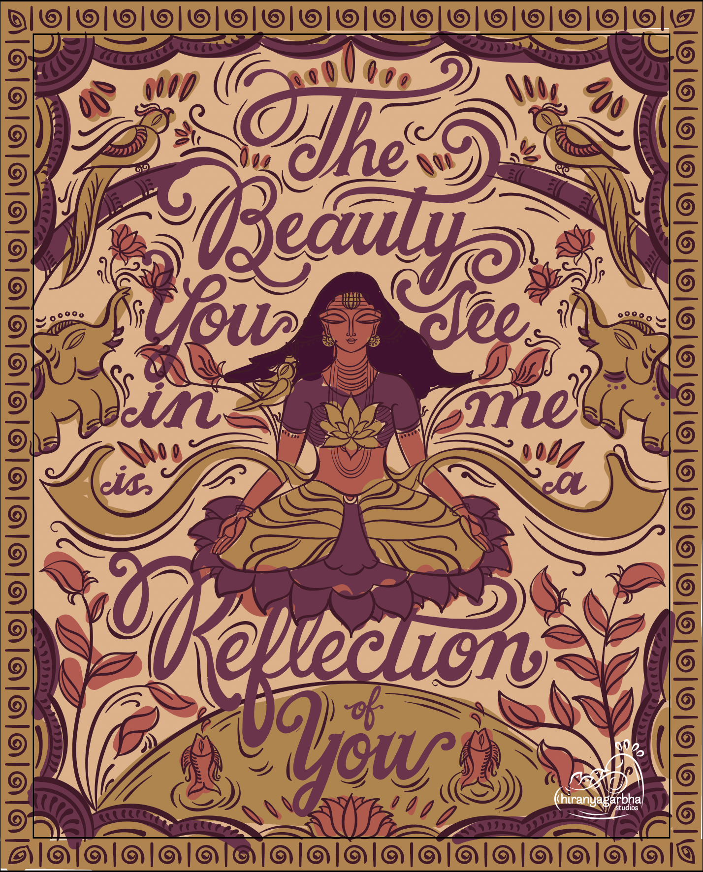 The quote "The beauty you see in me is a reflection of you" by Rumi is a powerful reminder of how the world around us is a reflection of our own perceptions and beliefs. This quote inspired me to create a lettering artwork that captures the essence of this message.Through this lettering artwork, I hope to inspire others to reflect on their own beliefs and perceptions and to recognize the beauty in themselves and others. Rumi's quote serves as a reminder of the interconnectedness of all things and the importance of looking within ourselves to find the beauty in the world around us.