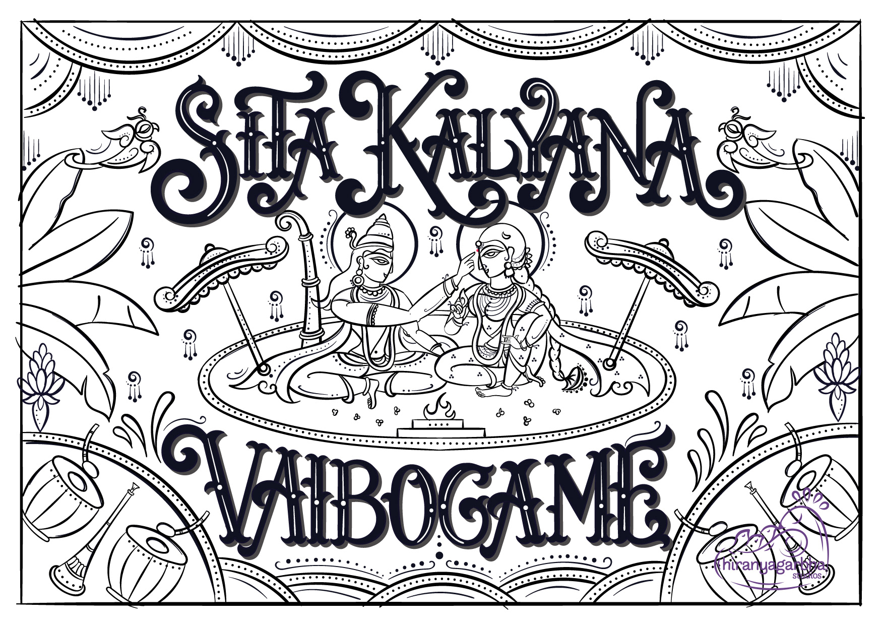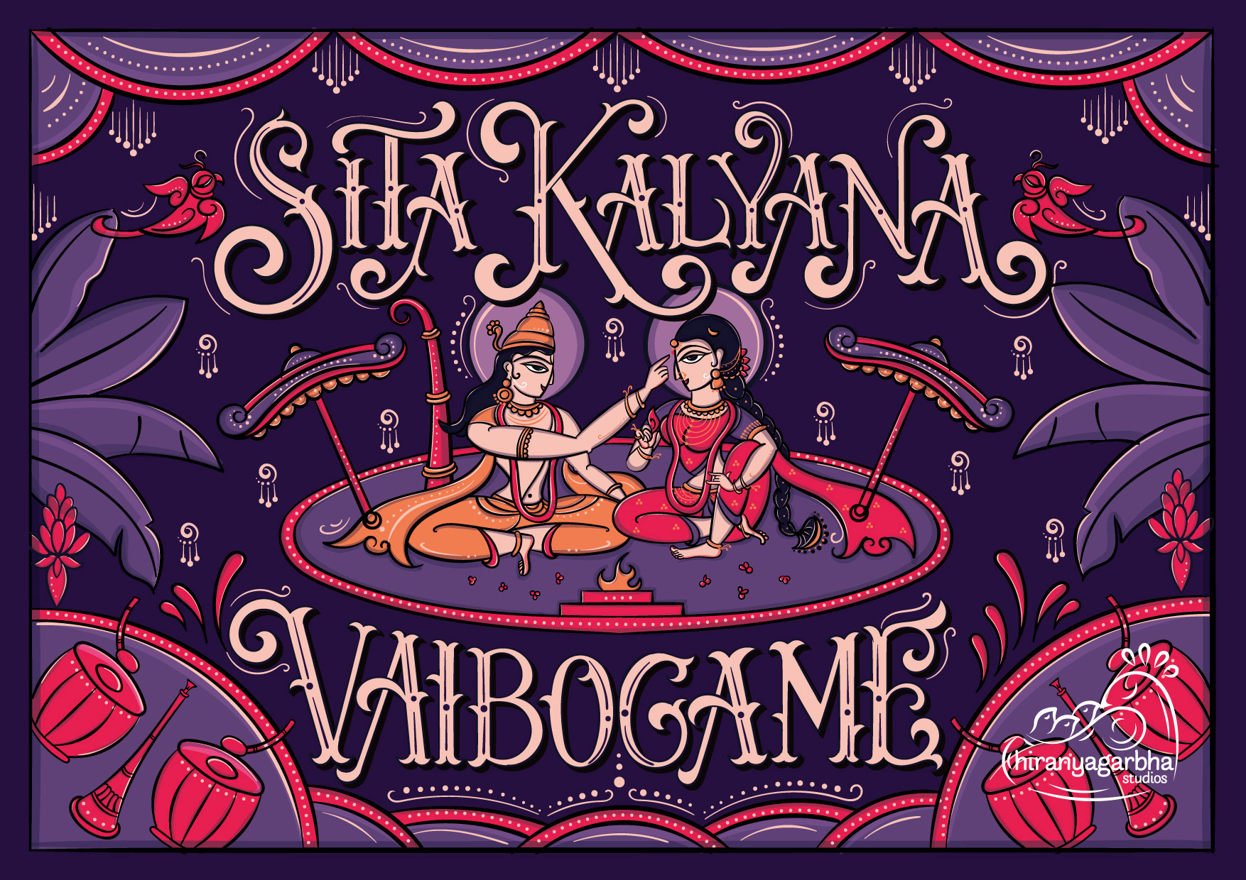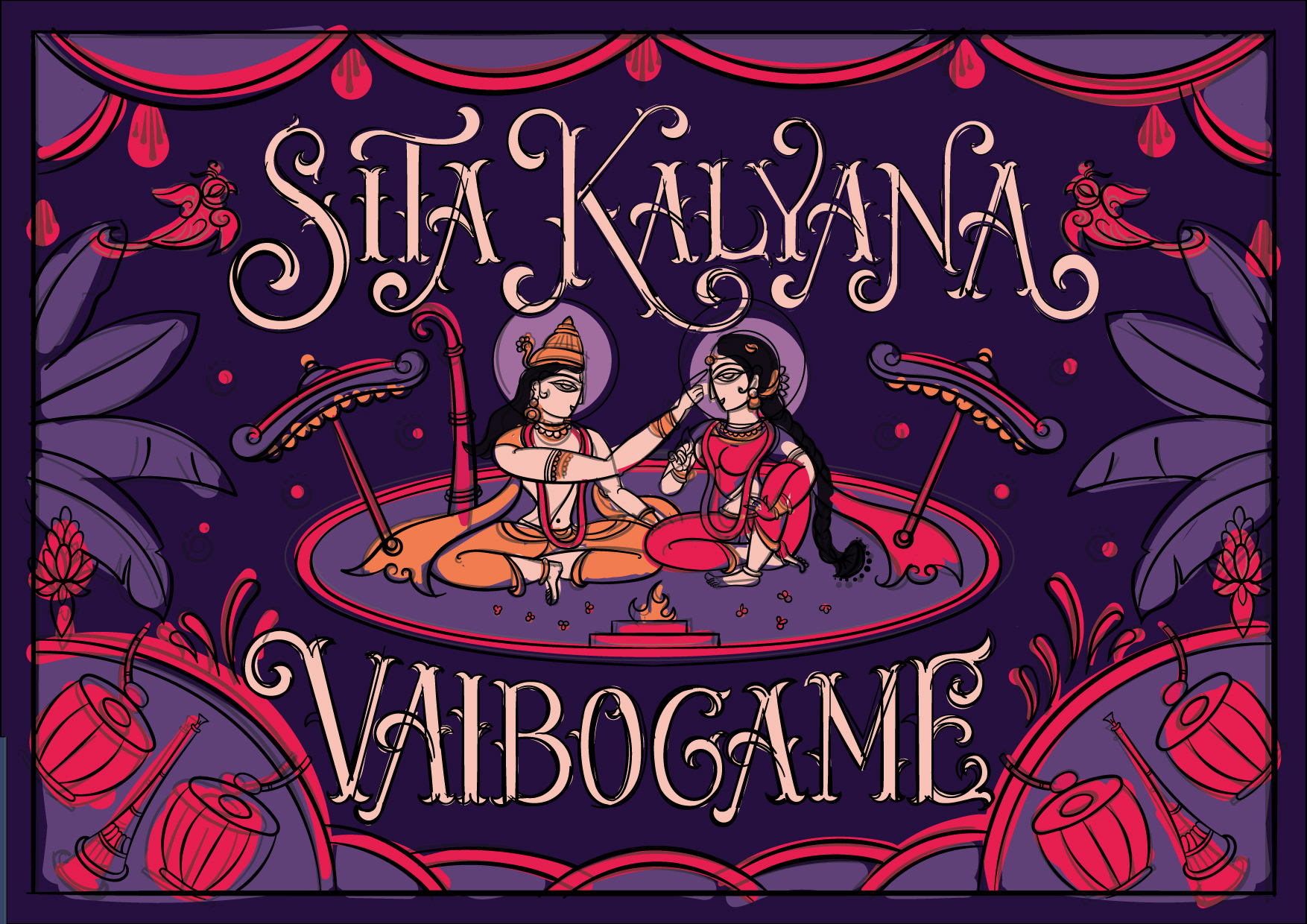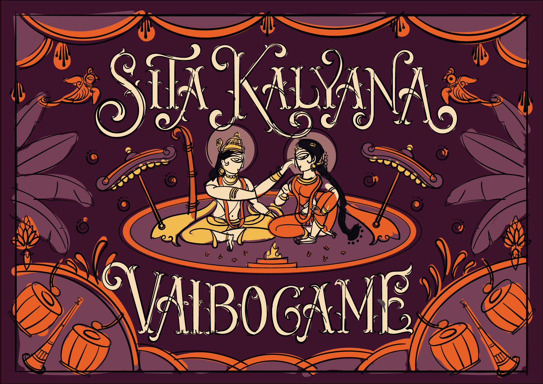 The wedding day is a special moment, a celebration of love and union. To make this day unforgettable, every detail must be perfect. A beautiful wedding invite is the perfect way to set the tone for this special occasion. The lettered quote "Sita Kalyana Vaibogame" in the contemplative Bengal Pattachitra art is a unique fusion of tradition and contemporary art. The bright colours and intricate patterns of the art form perfectly capture the spirit of the celebration. The quote means "Let the wedding of Sita be a celebration" and is a beautiful sentiment to include on the wedding invite. The blend of circus & victorian lettering style adds a touch of elegance and refinement to the invite, perfectly complementing the vibrant colors of the art.
