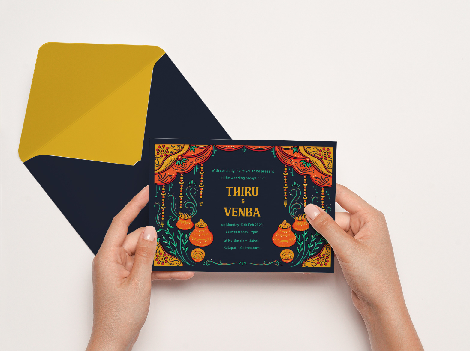 Overall, this illustrated lettering wedding invite perfectly captures the joy and excitement of a traditional South Indian wedding feast, inviting your loved ones to share in the love and laughter of your special day.