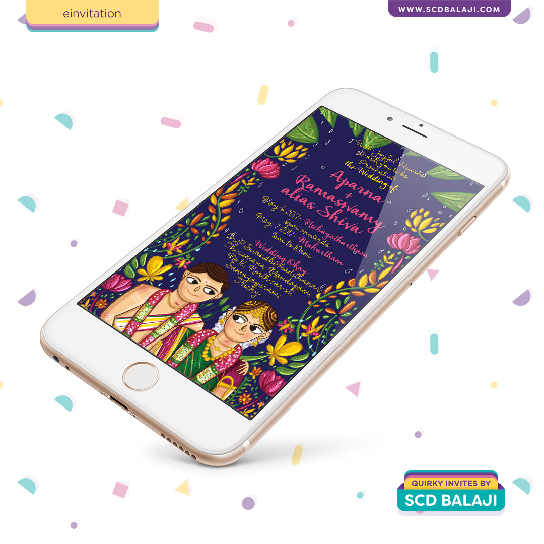 This creative and quirky Tamil brahmin aka tambrahm wedding invitation card designed by Indian illustrator, SCD Balaji features the couple dressed in traditional brahmin attire where the bride wears a madisar. The designer has illustrated the invite with a floral background to add beauty to it. A complimentary einvite comes along with the wedding stationery package. Illustrated and Designed in Adobe Illustrator.