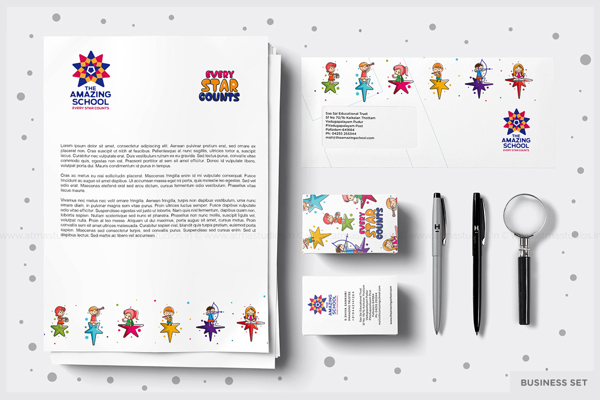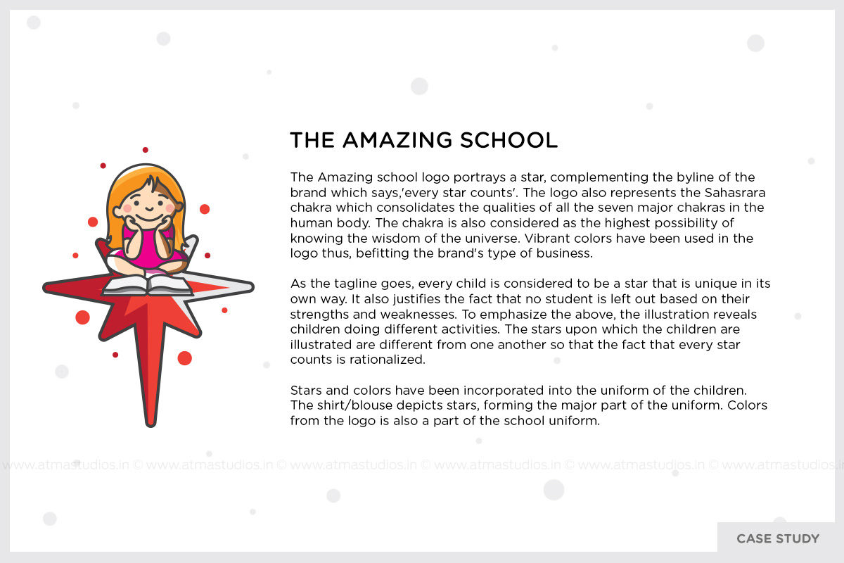 The Amazing school logo portrays a star, complementing the byline of the brand which says,'every star counts'. The logo also represents the Sahasrara chakra which consolidates the qualities of all the seven major chakras in the human body. The chakra is also considered as the highest possibility of knowing the wisdom of the universe. Vibrant colours have been used in the logo thus, befitting the brand's type of business. As the tagline goes, every child is considered to be a star that is unique in its own way. It also justifies the fact that no student is left out based on their strengths and weaknesses. To emphasise the above, the illustration reveals children doing different activities. The stars upon which the children are illustrated are different from one another so that the fact that every star counts is rationalised. Stars and colours have been incorporated into the uniform of the children. The shirt/blouse depicts stars, forming the major part of the uniform. Colours from the logo is also a part of the school uniform.