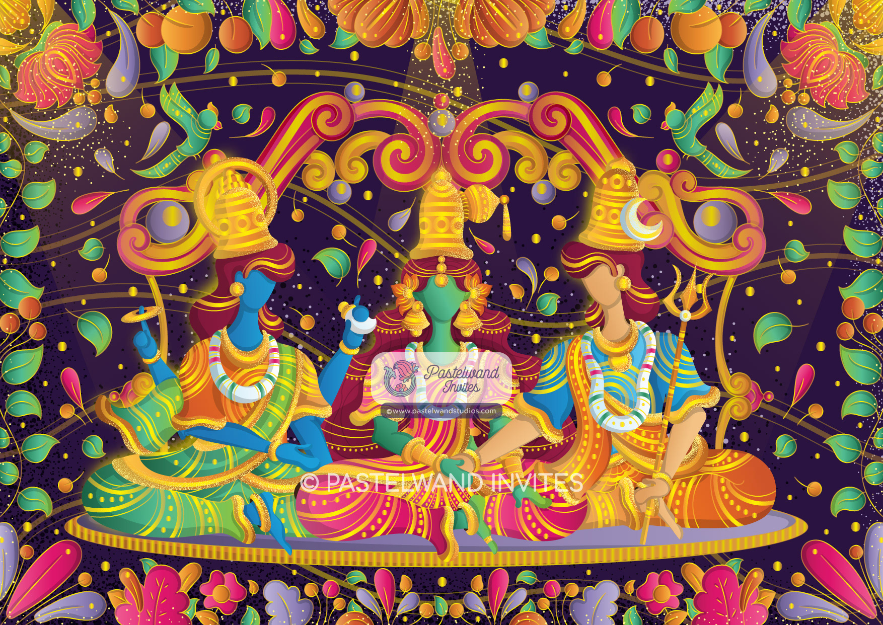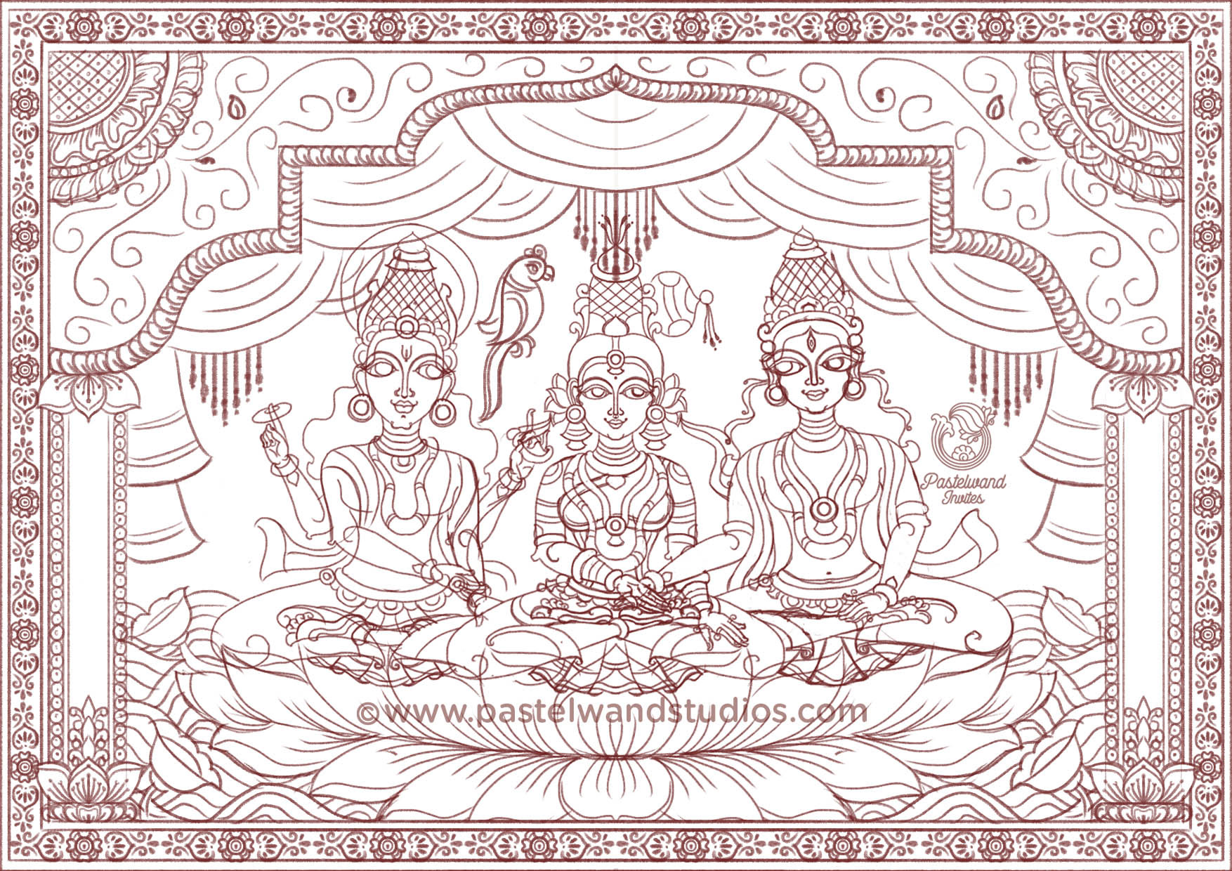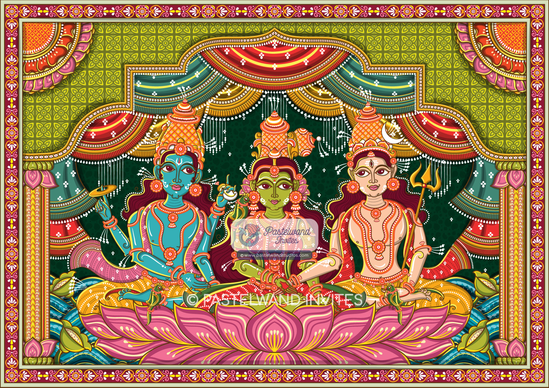 The love between Shiva and Parvati is shown as Meenakshi and Sundareshwarar in the Madurai Wedding Invitation in the style of the Odisha Pattachitra! Pattachitra painting typically features Hindu deities and tales. One of the most well-known and traditional forms of art in Odisha is the pattachitra style of painting. Sanskrit terms patta, which means canvas, and chitra, which means picture, were combined to form the name Pattachitra. Pattachitra is a canvas painting that expresses simple topics, mostly mythological in nature, with richly applied colour, imaginative motifs, and designs. Pattachitra painting customs date back over a thousand years.