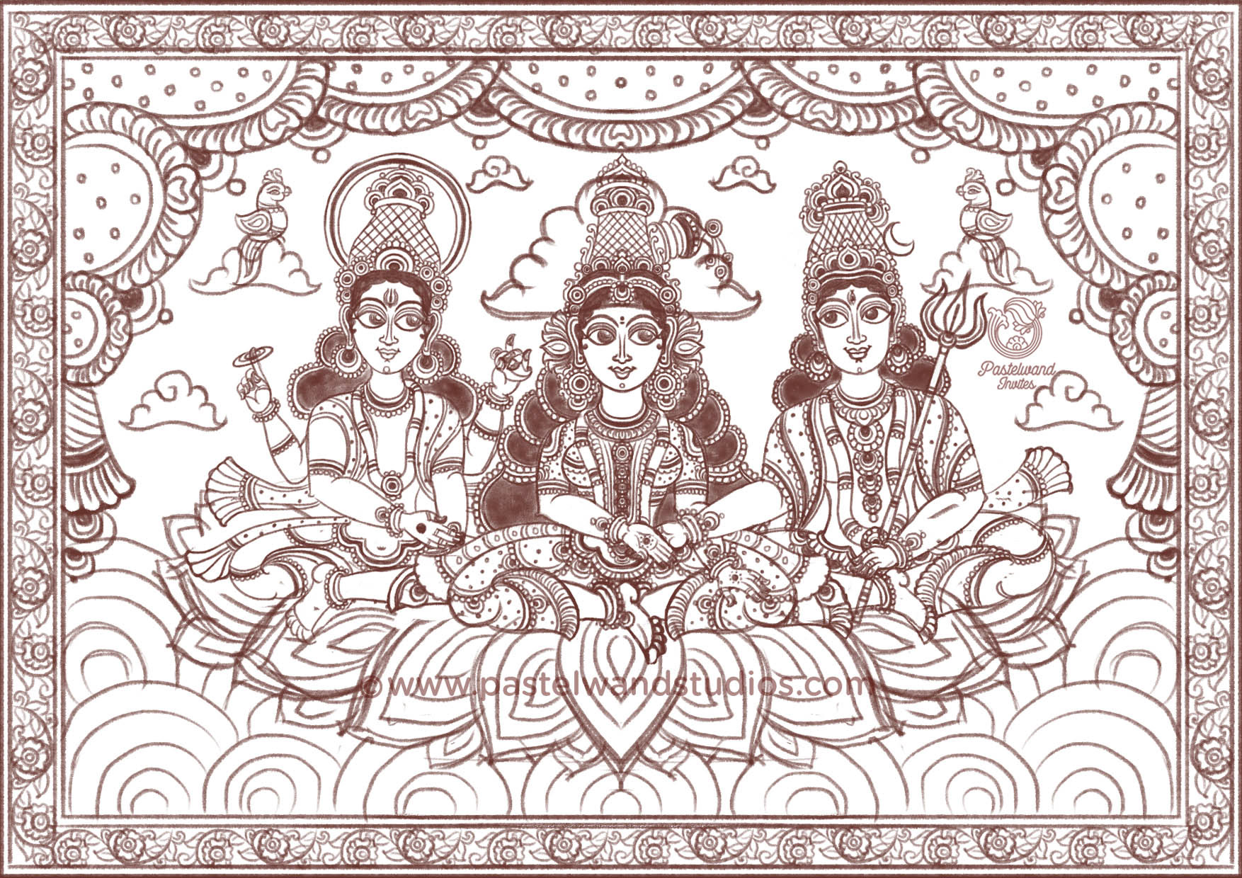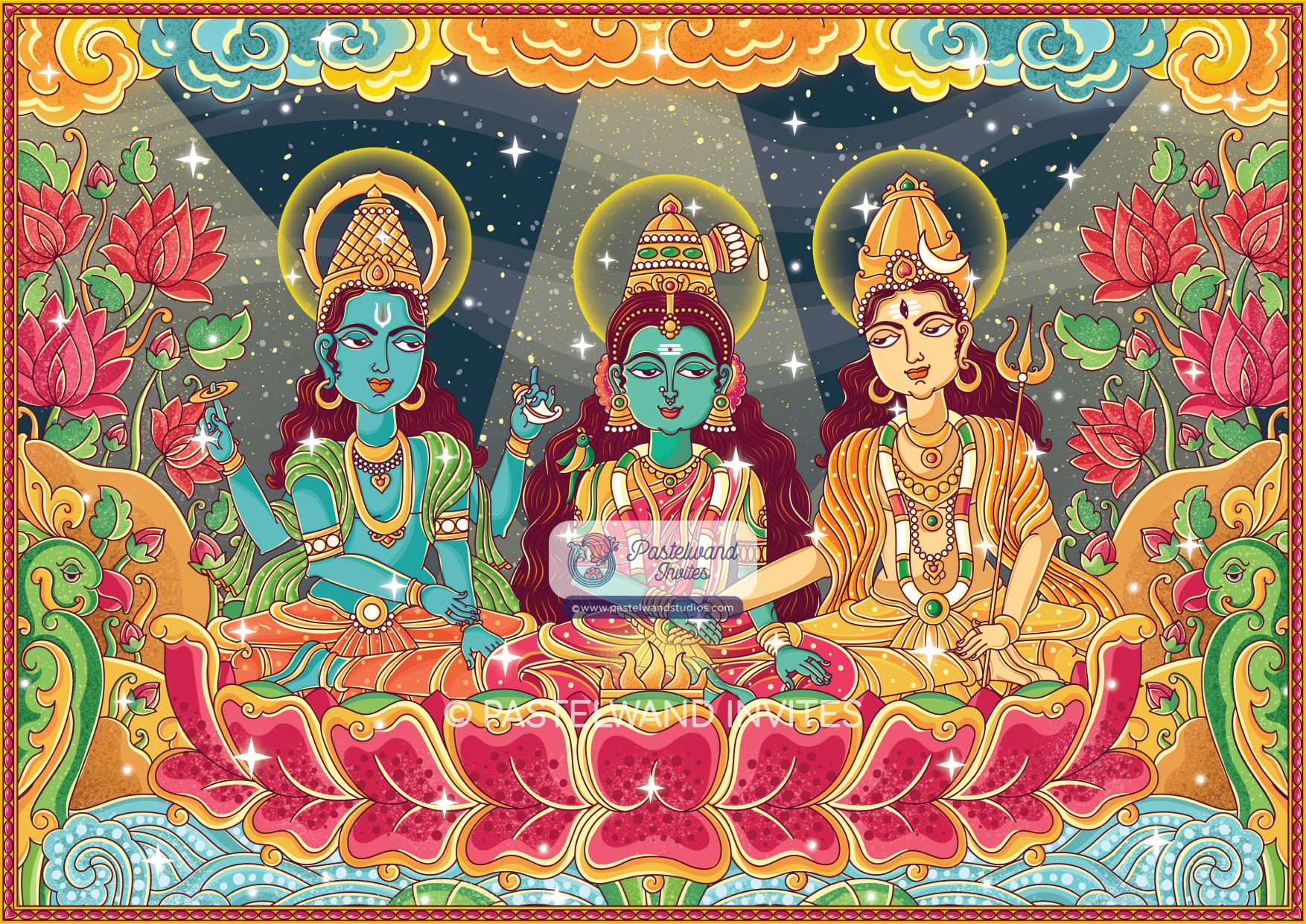 The wedding of Sri Meenakshi is a part of the Chithirai Thiruvizha celebration, which takes place in the Tamil month of Chithirai.This festival honours the magnificent union of the goddess Meenakshi and the god Shiva. Meenakshi's older brother, Mahavishnu, who is thought to be a manifestation of Alagar, has travelled to the wedding of his sister. They are all seated atop a magnificent lotus flower as the wedding takes place.Quirky style is full of vibrant, lively colours, and the characters are depicted in a quirky, cheerful way that will appeal to the viewers more.