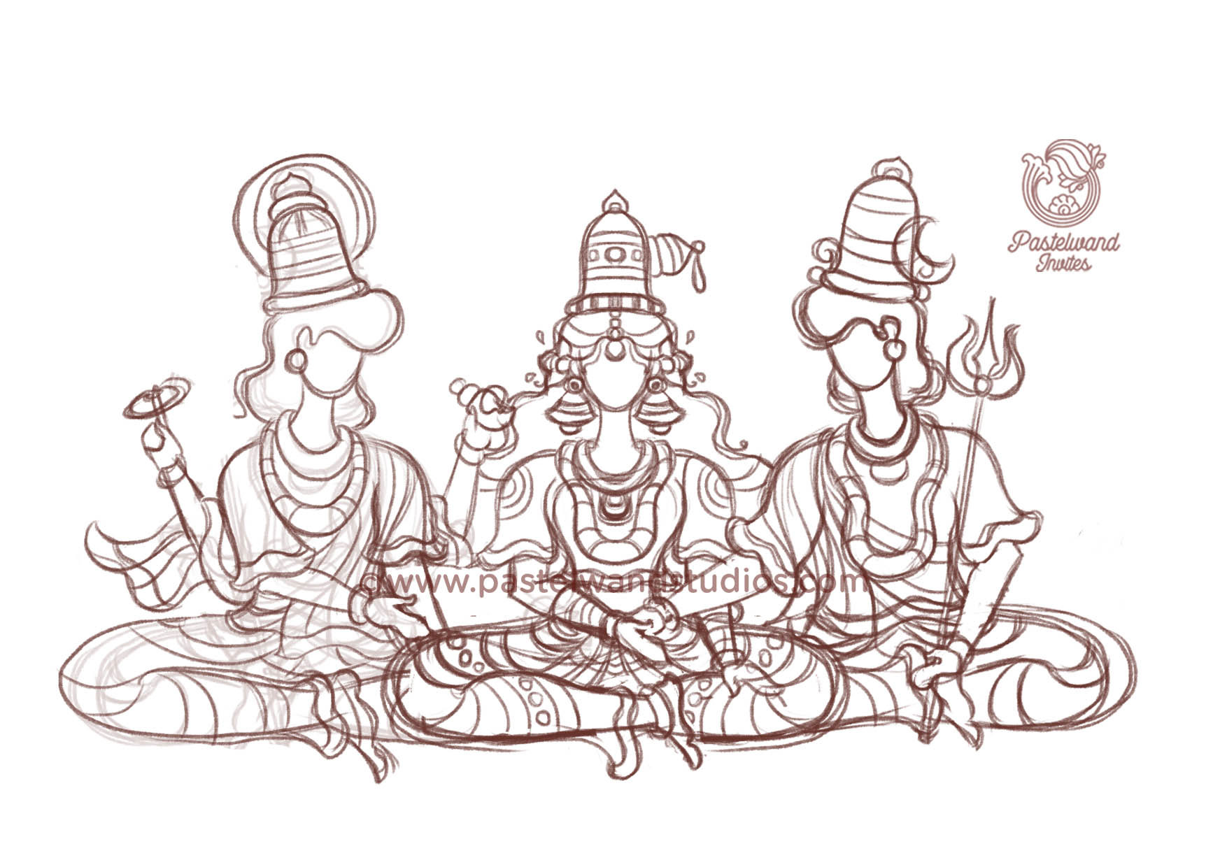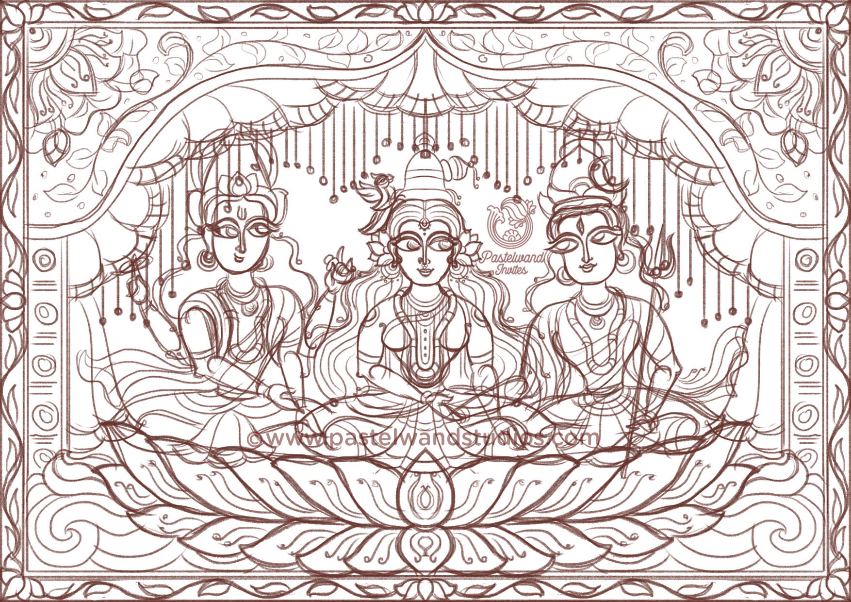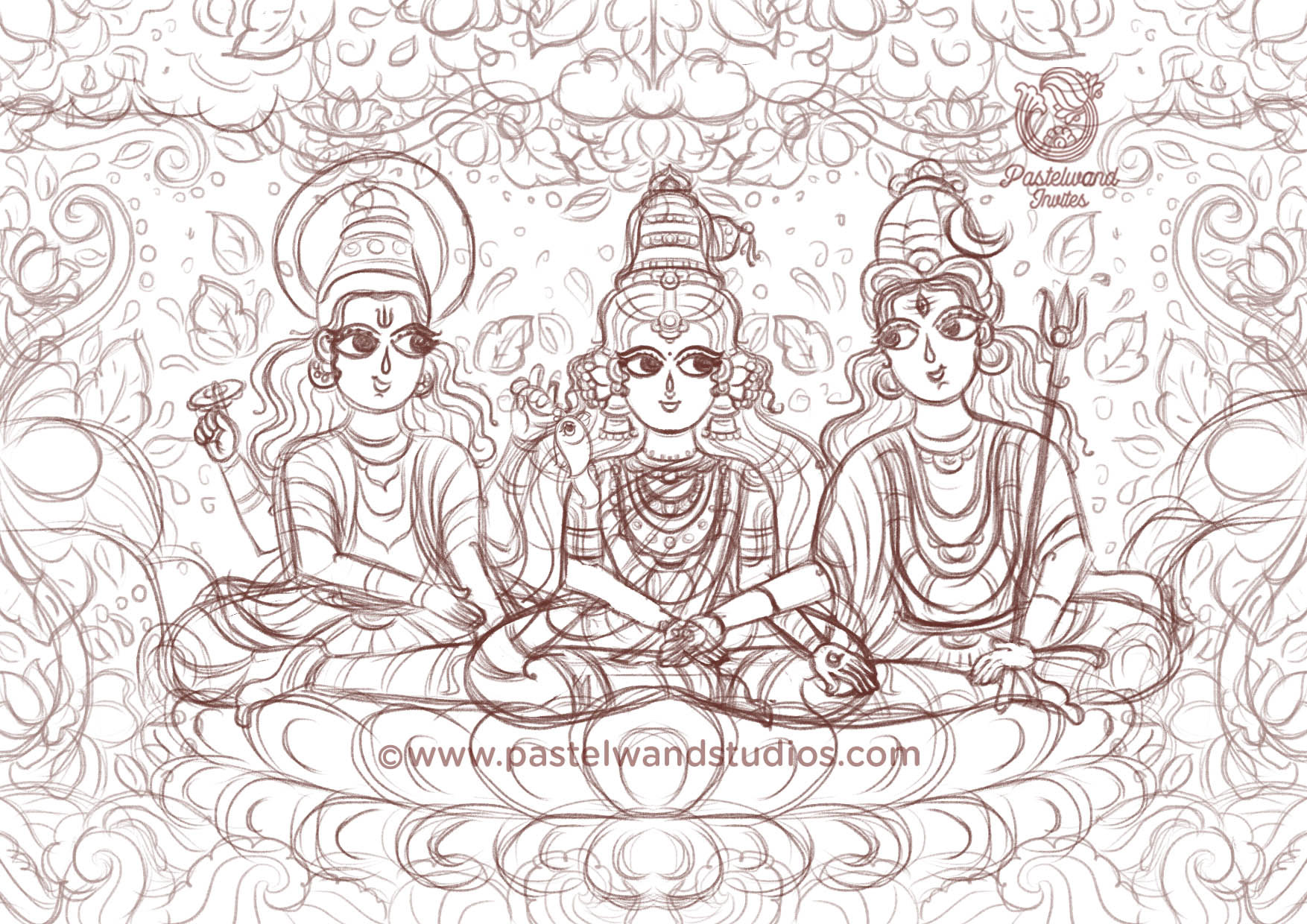 Intricate Shiva Parvati wedding invitation illustration created in Adobe Illustrator using Odisha Pattachitra, a traditional Indian folk art form.