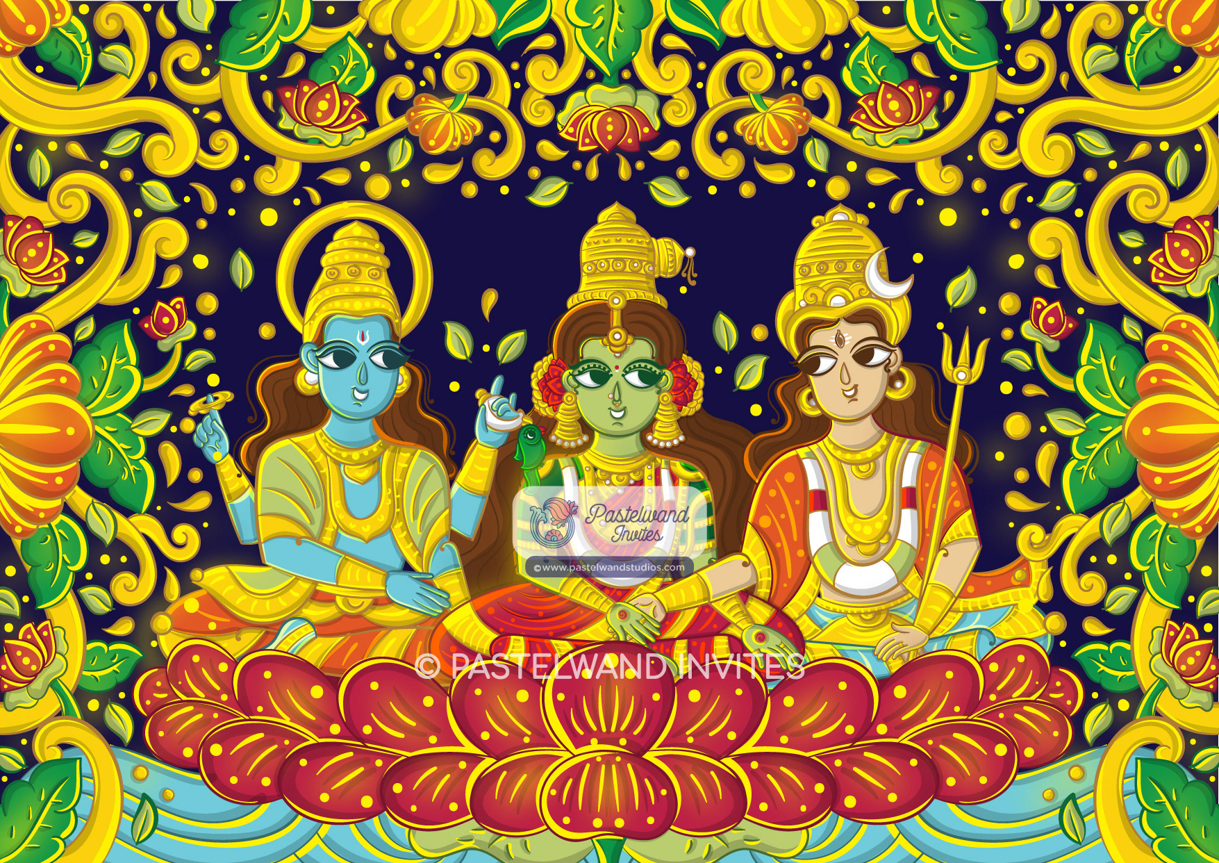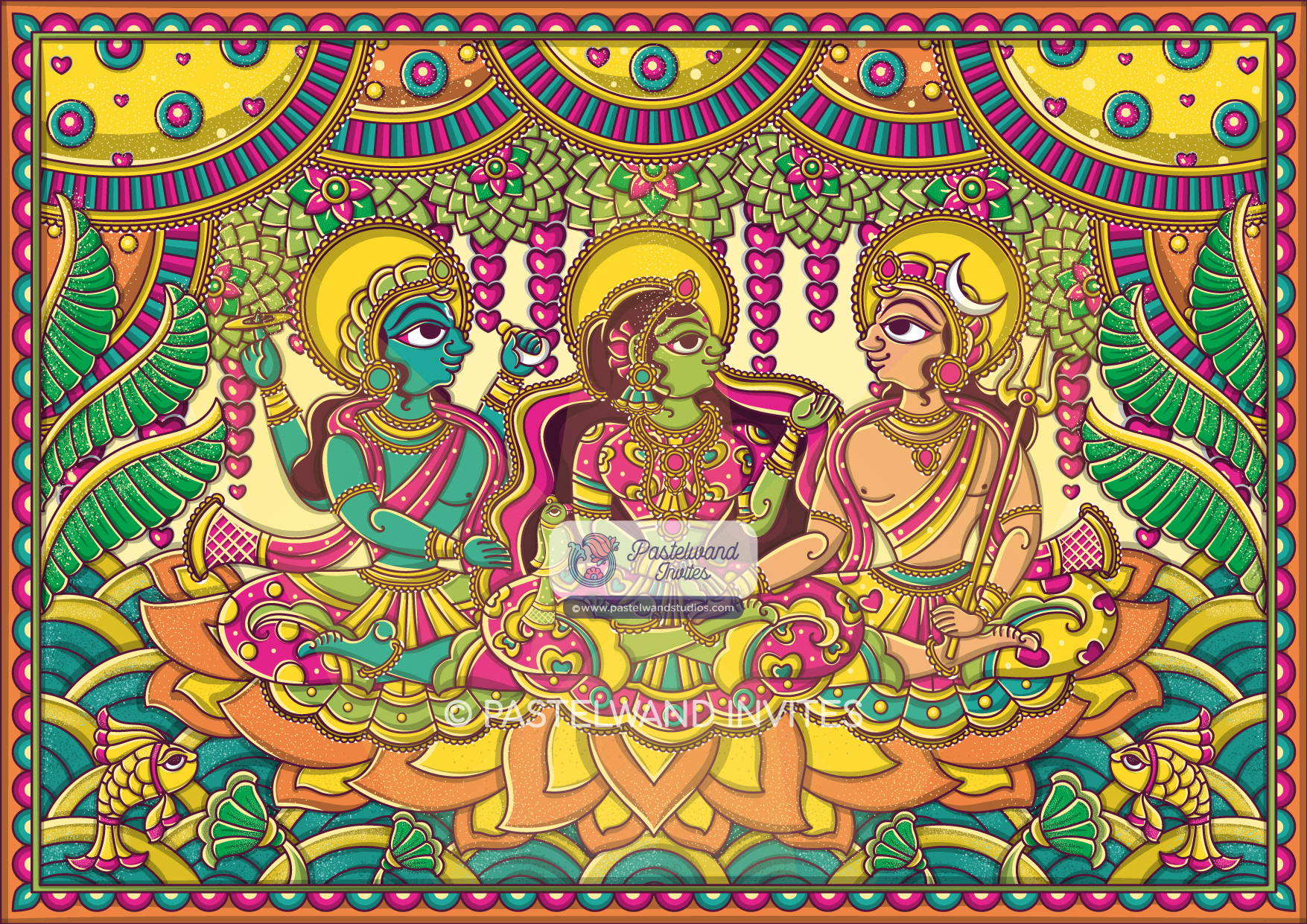 Beautiful Bengal pattachitra wedding invitation portraying Meenakshi Sundareshwarar in Jamini Roy style.