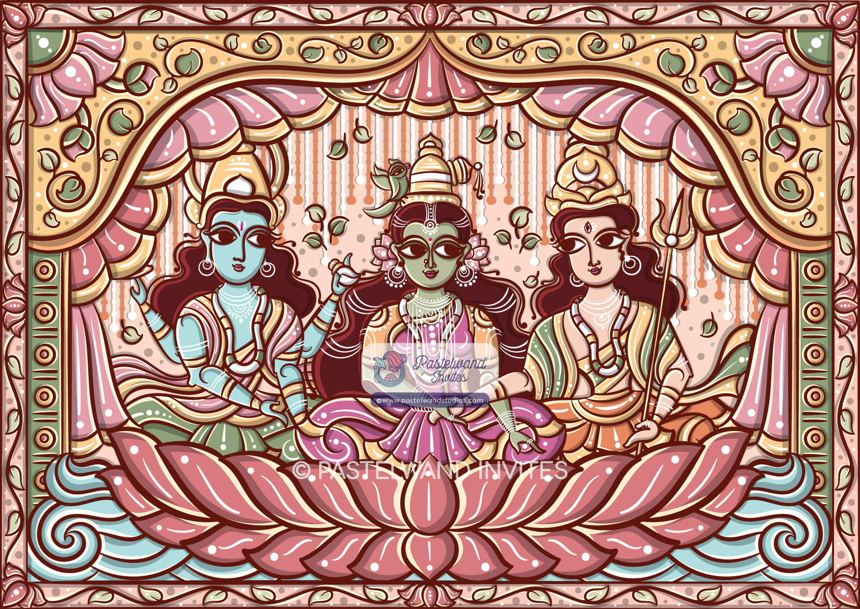 Cute baby shiva parvati madurai wedding invitation created in Adobe Illustrator in lovely pastel colours.