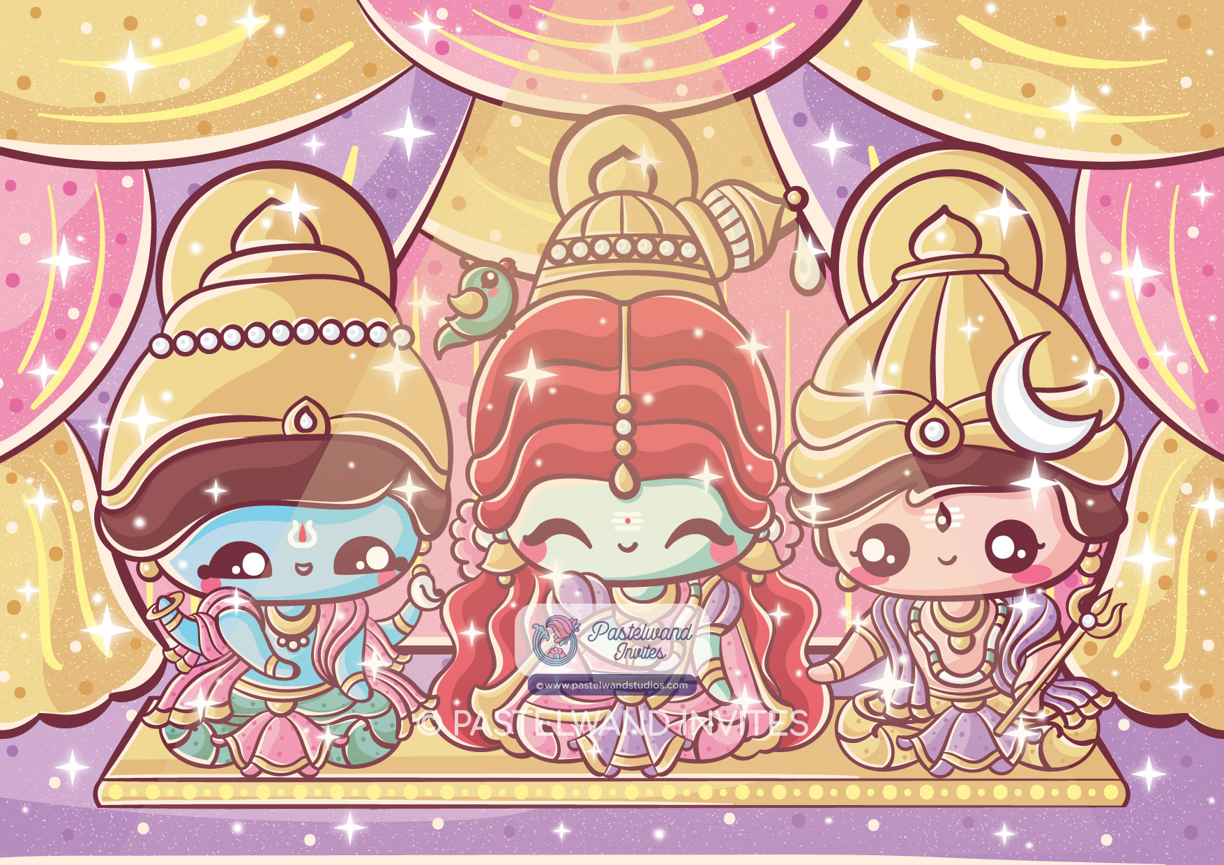 The depiction of Sri Meenakshi Thirukalyanam in the sweetest Kawaii Art Style features Goddess Meenakshi and God Sundareshwar dressed in silk robes, golden crowns, and flower garlands.Meenakshi's older brother, Mahavishnu, who is thought to be a manifestation of Alagar, has travelled to the wedding of his sister. They are all seated on a stunning golden shrine as the wedding takes place. Japanese culture of cuteness known as kawaii is very well-liked. Every character is depicted in a really cute way in the kawaii art style. Kawaii expresses joy, celebration, and happy times. The Madurai Wedding Invite by @pastelwandstudios is conceptualised in this cute art style and is sure to make everyone at your wedding adore!