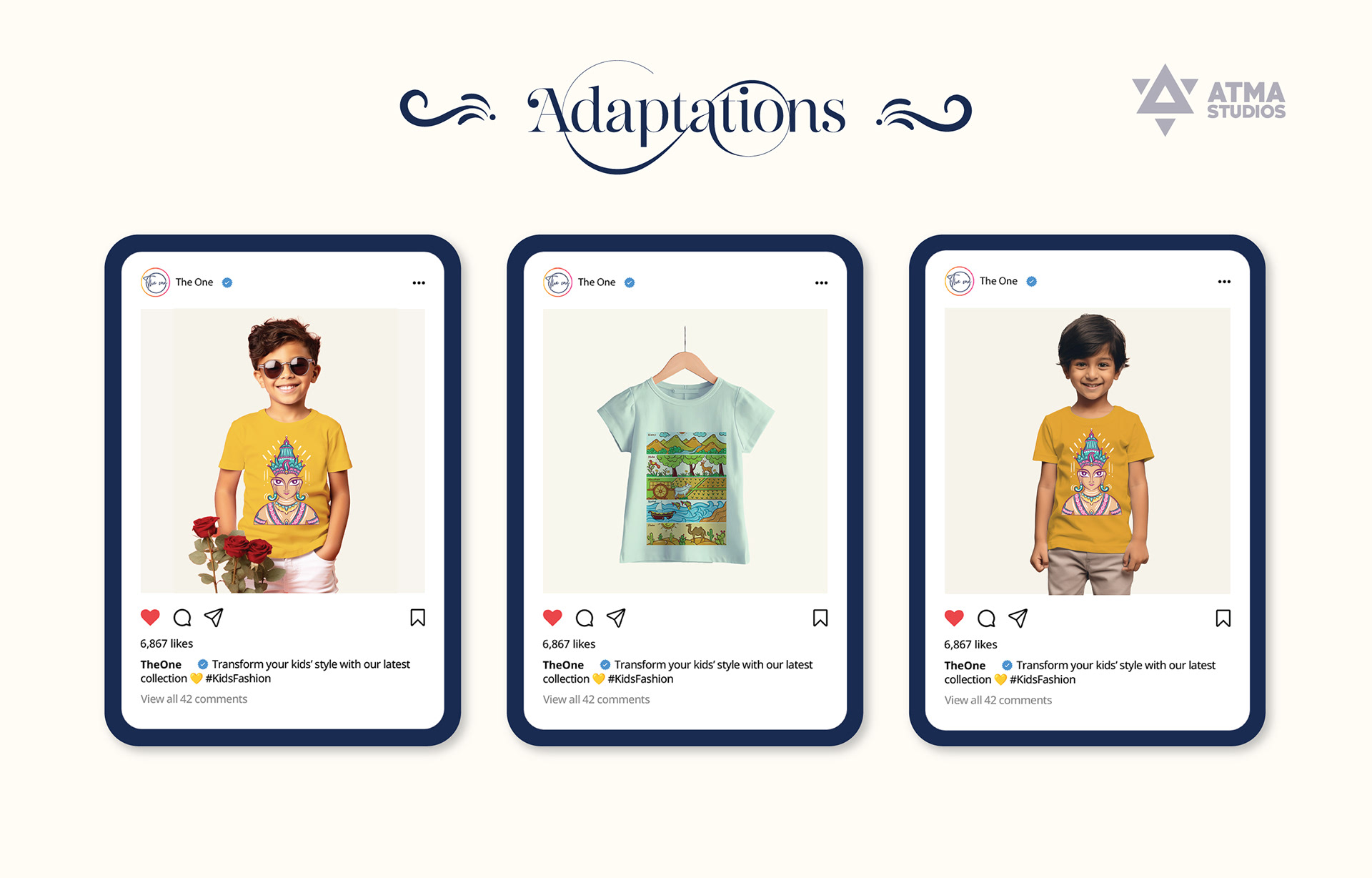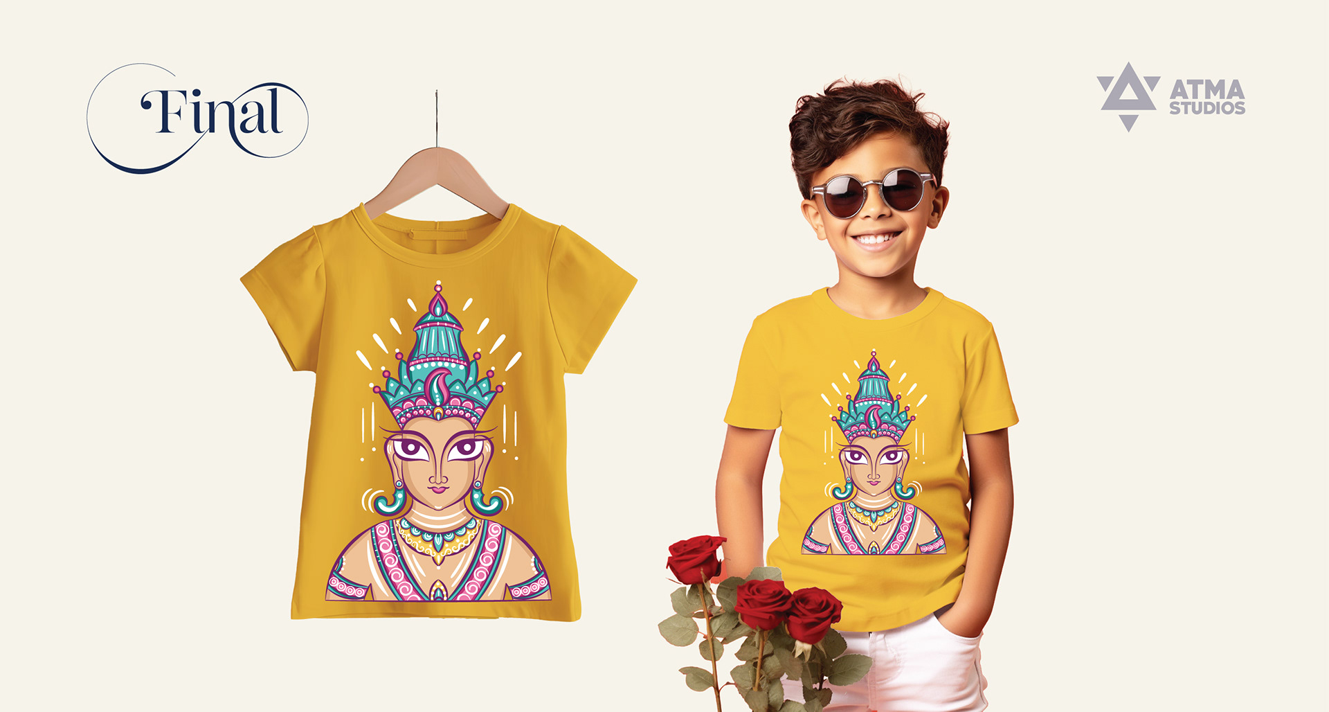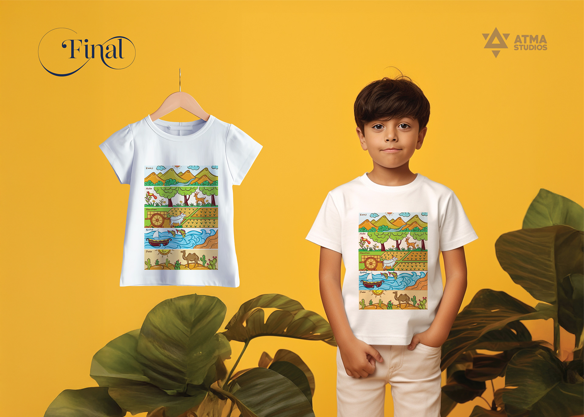 A vibrant fusion of culture and creativity, this project reimagines Indian heritage in a fun, child-friendly style. Featuring a Neo Bengal Folk Art version of King Suryavarman II and a colourful illustration of the Five Tamil Landscapes, the designs bring tradition to life as expressive, wearable art. From sketches to final tees, each piece celebrates storytelling, culture, and modern kids’ fashion.