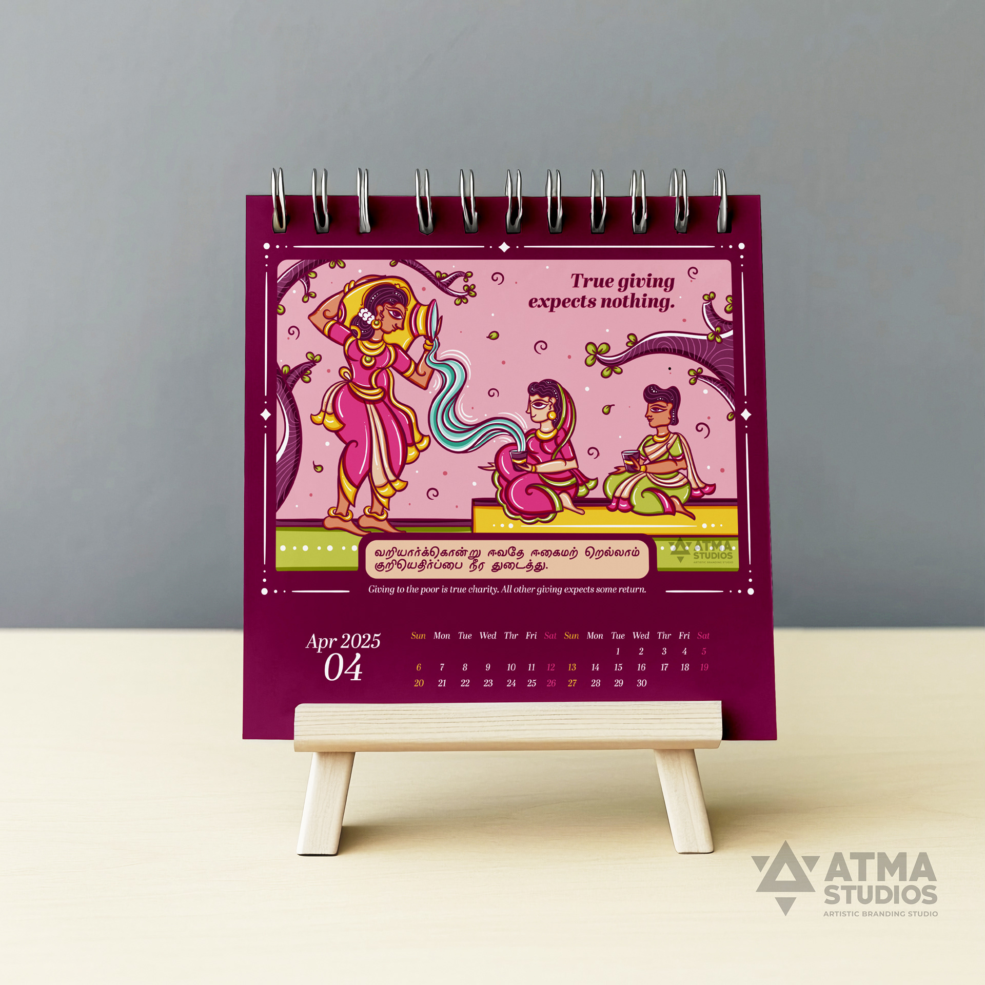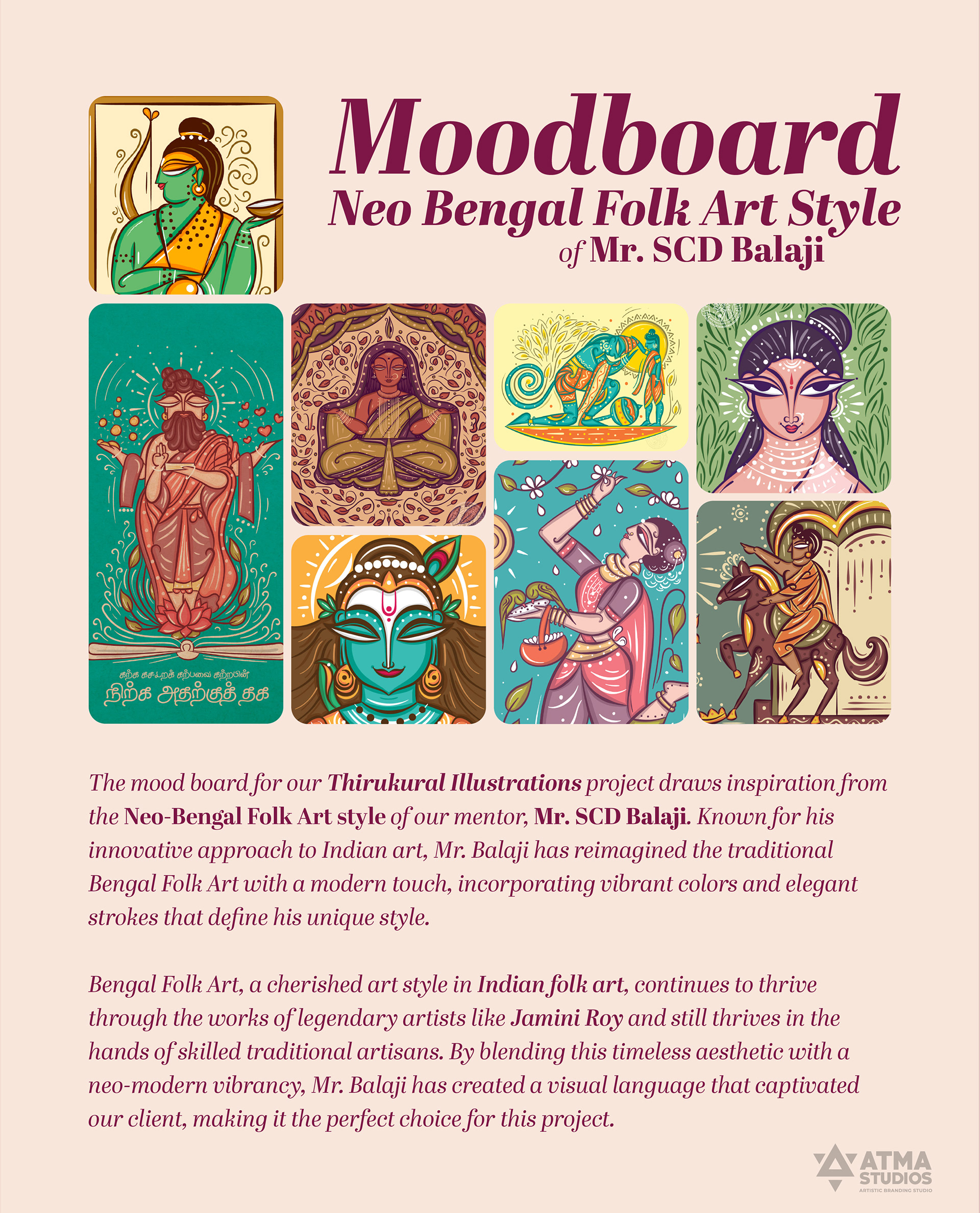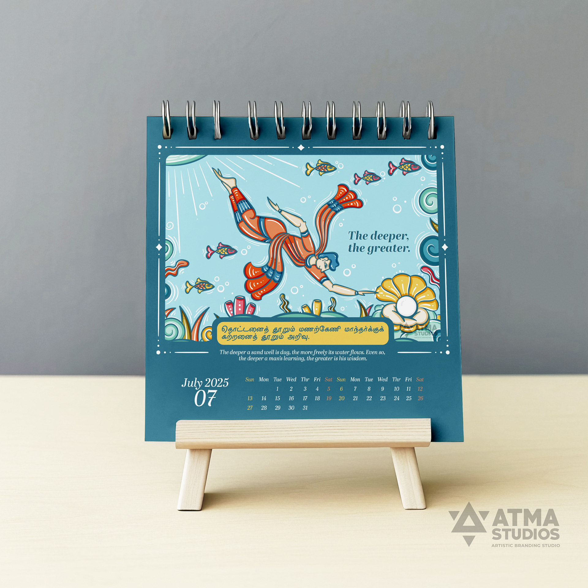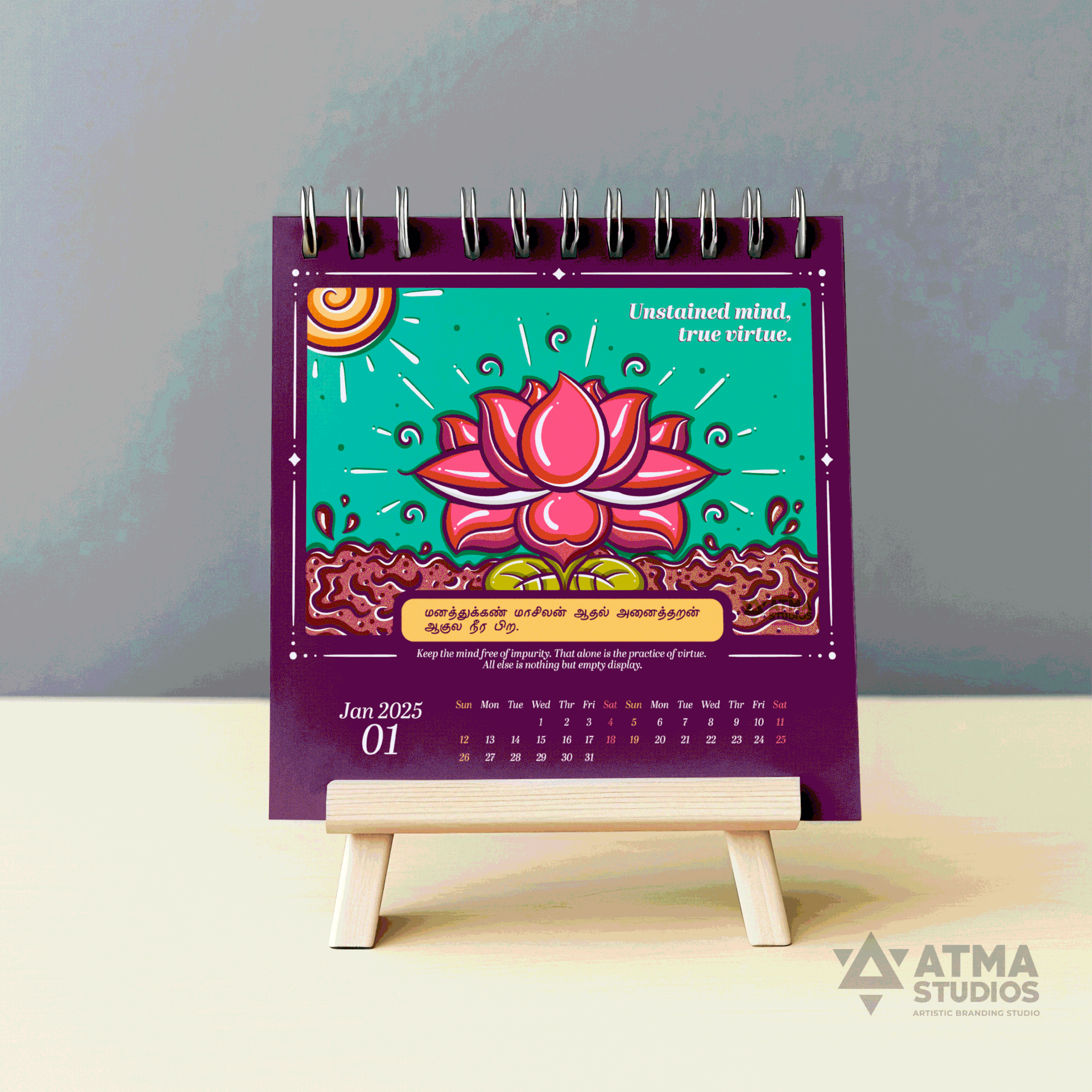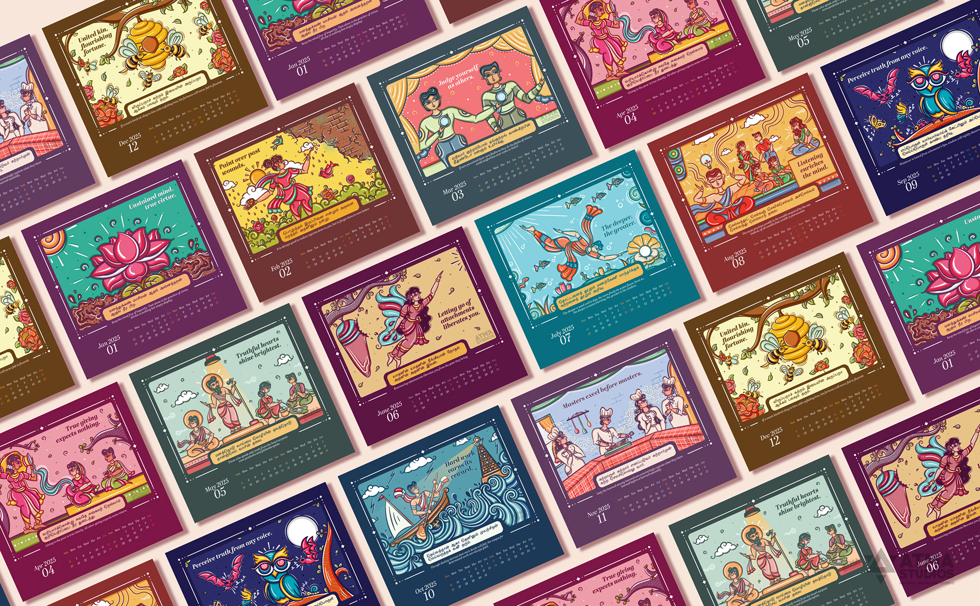 JC Residency’s founder, an ardent admirer of Neo Bengal Folk Art, envisioned a unique and culturally resonant 2025 calendar featuring 12 bespoke illustrations inspired by Thirukkural. Given the ambitious scope and timeline, SCD Balaji proposed an exceptional alternative: entrusting the project to an equally proficient artist and Artpreneur Online Program alumnus, Vinodhini N Durai, founder of Pastelwand Studios. Vinodhini’s expertise in Neo Bengal Folk Art, coupled with her professional finesse and dedication, made her the perfect candidate to bring this vision to life. Her involvement ensured the project’s seamless execution, maintaining Atma Studios’ standard of excellence while delivering a fresh and inspired interpretation. • Creative Direction: SCD Balaji, Atma Studios • Illustrations: Vinodhini N Durai, Pastelwand Studios
