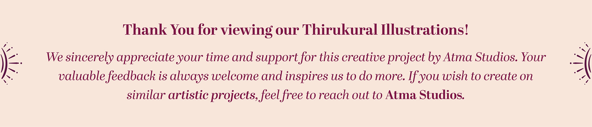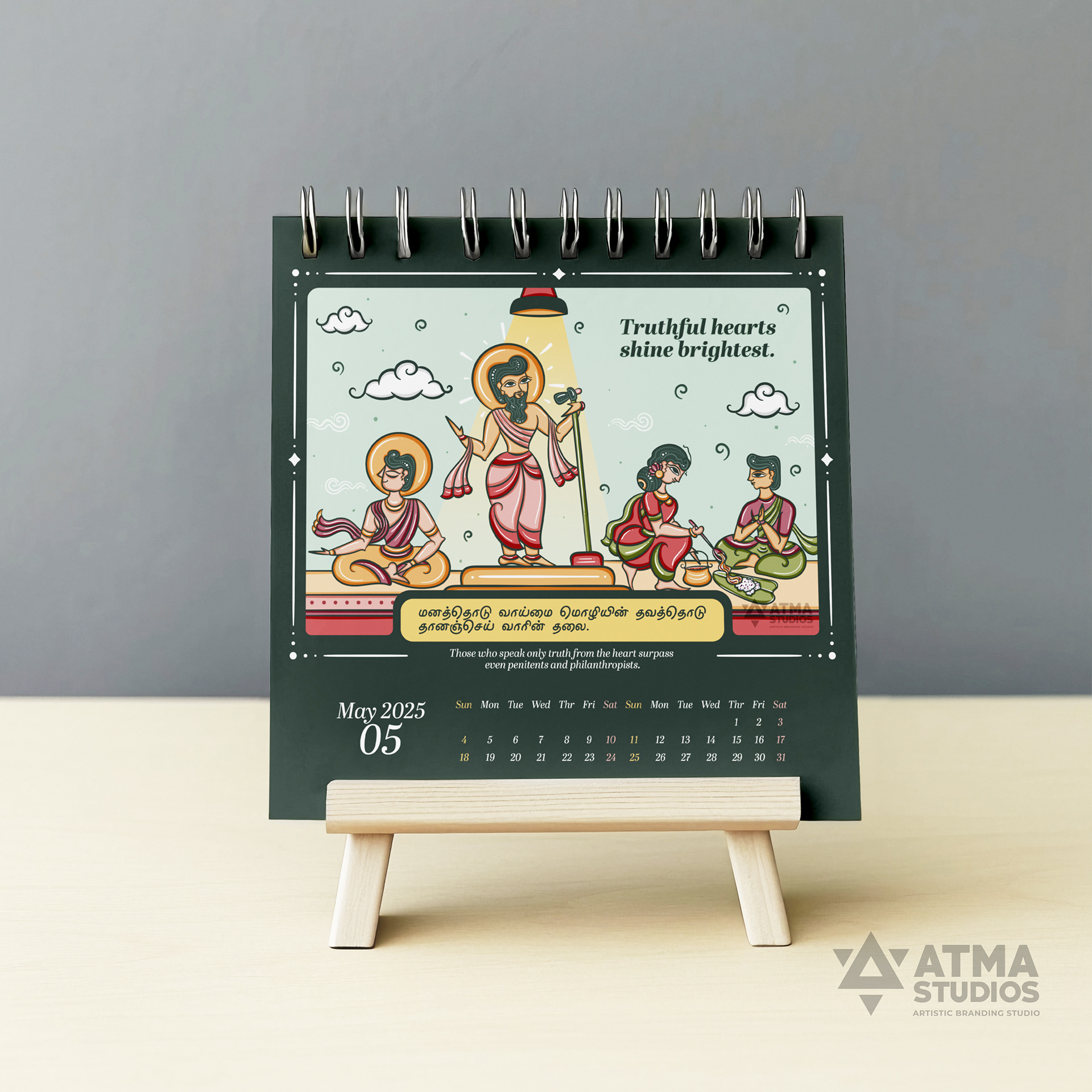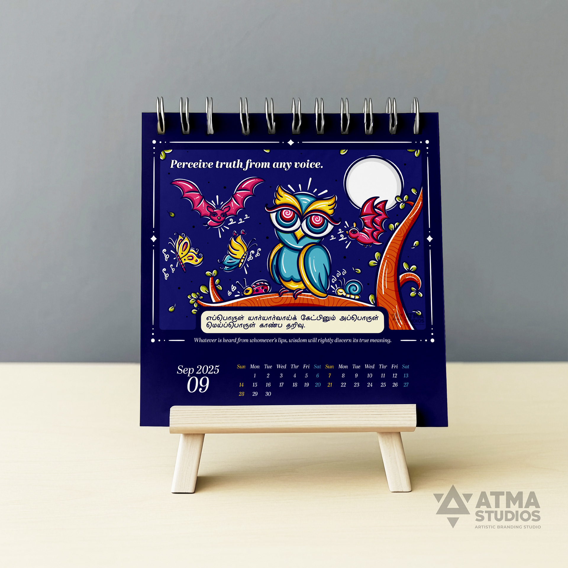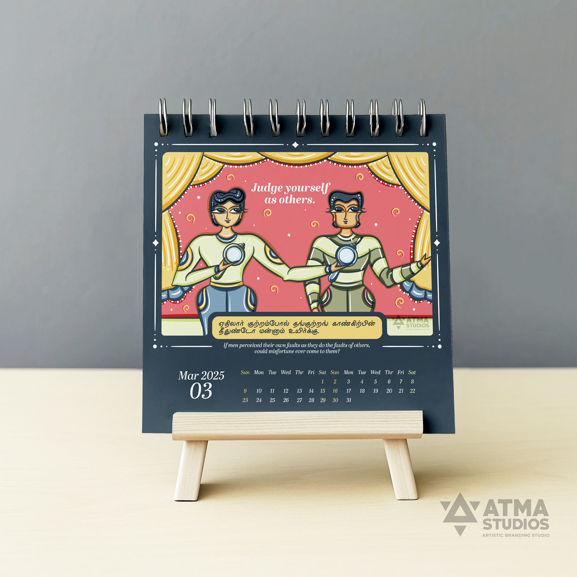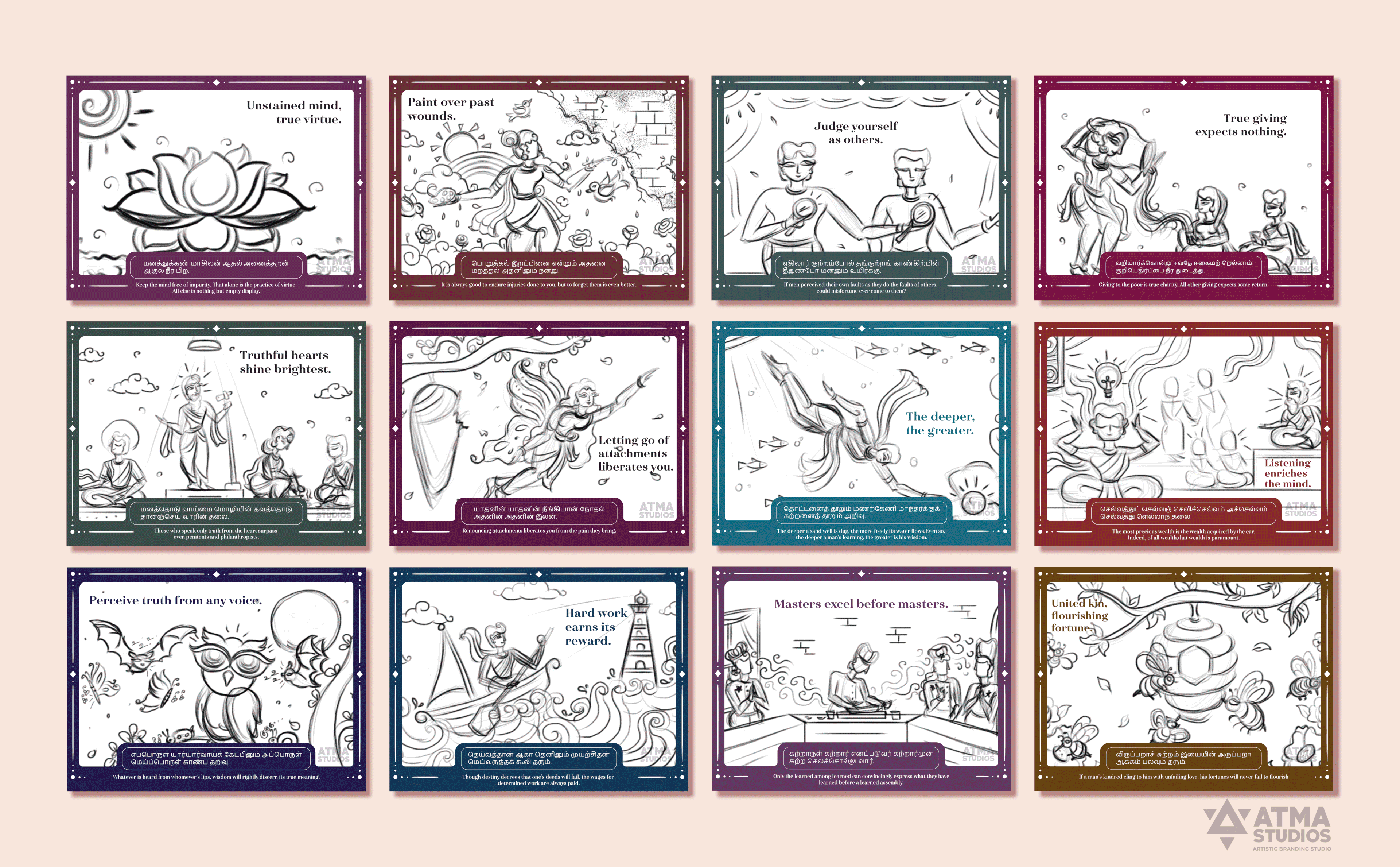 JC Residency’s founder, an ardent admirer of Neo Bengal Folk Art, envisioned a unique and culturally resonant 2025 calendar featuring 12 bespoke illustrations inspired by Thirukkural. Given the ambitious scope and timeline, SCD Balaji proposed an exceptional alternative: entrusting the project to an equally proficient artist and Artpreneur Online Program alumnus, Vinodhini N Durai, founder of Pastelwand Studios. Vinodhini’s expertise in Neo Bengal Folk Art, coupled with her professional finesse and dedication, made her the perfect candidate to bring this vision to life. Her involvement ensured the project’s seamless execution, maintaining Atma Studios’ standard of excellence while delivering a fresh and inspired interpretation. • Creative Direction: SCD Balaji, Atma Studios • Illustrations: Vinodhini N Durai, Pastelwand Studios