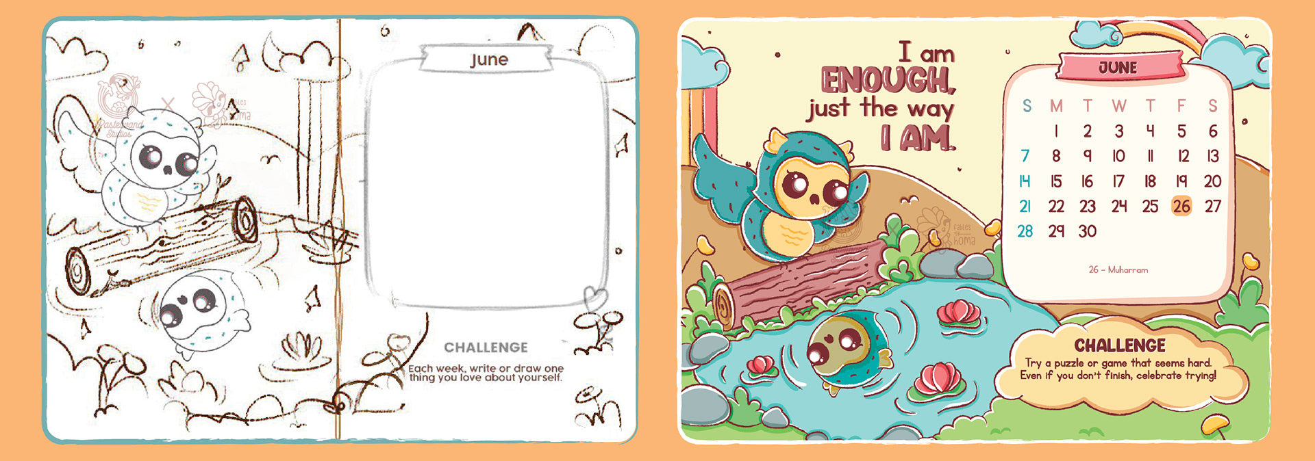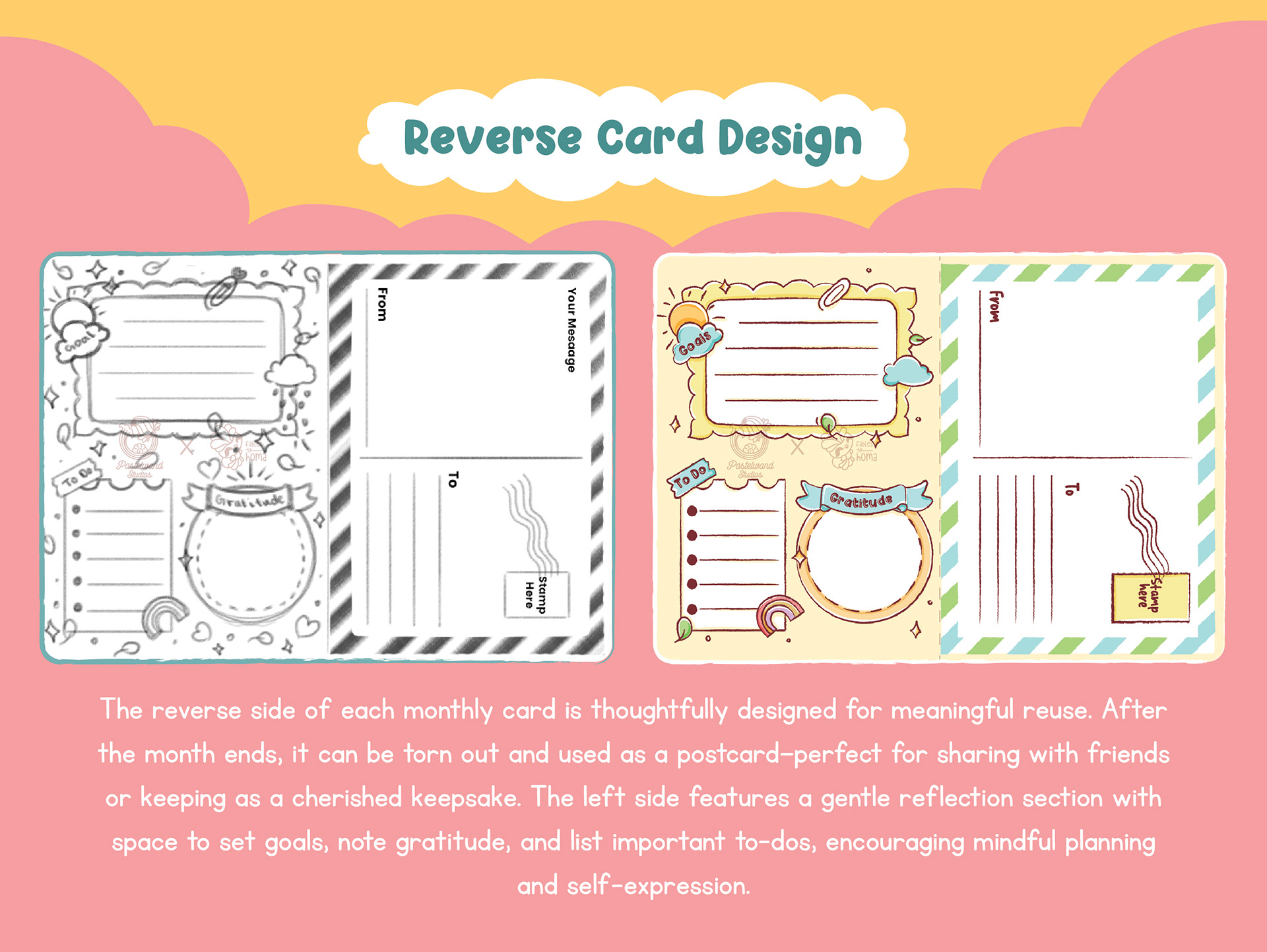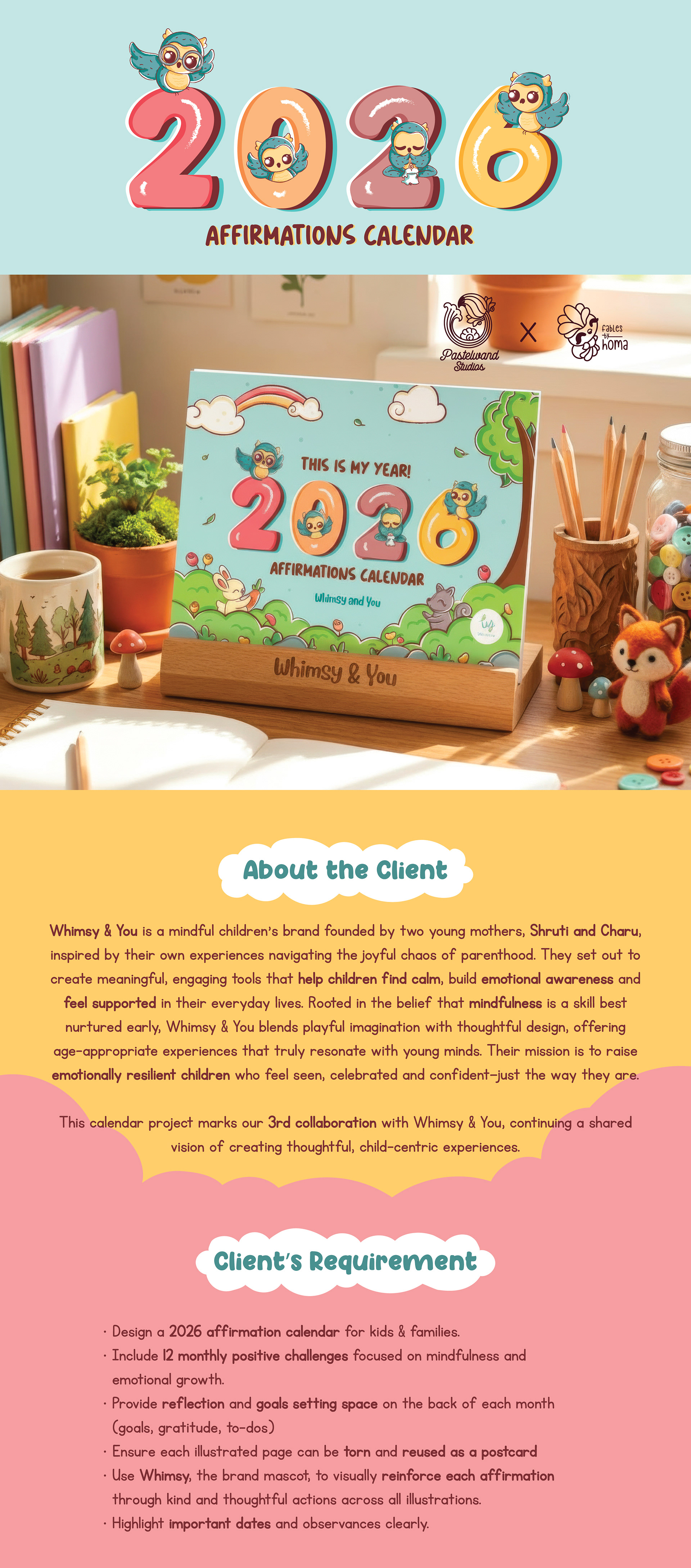 The Whimsy & You 2026 Affirmation Calendar was created to support children in building positive habits and emotional awareness in a simple, approachable way. Each month features a clear affirmation paired with a small, child-friendly challenge that encourages reflection, kindness, and mindfulness. The brand mascot, Whimsy, appears across all illustrations, helping reinforce each message through everyday, relatable actions. The calendar follows a postcard-style format, with the reverse side offering space for goals, gratitude, and important to-dos. Once the month ends, each page can be reused as a postcard or kept as a memory. Designed to sit on a desk or shelf, the calendar balances function and warmth for everyday use.