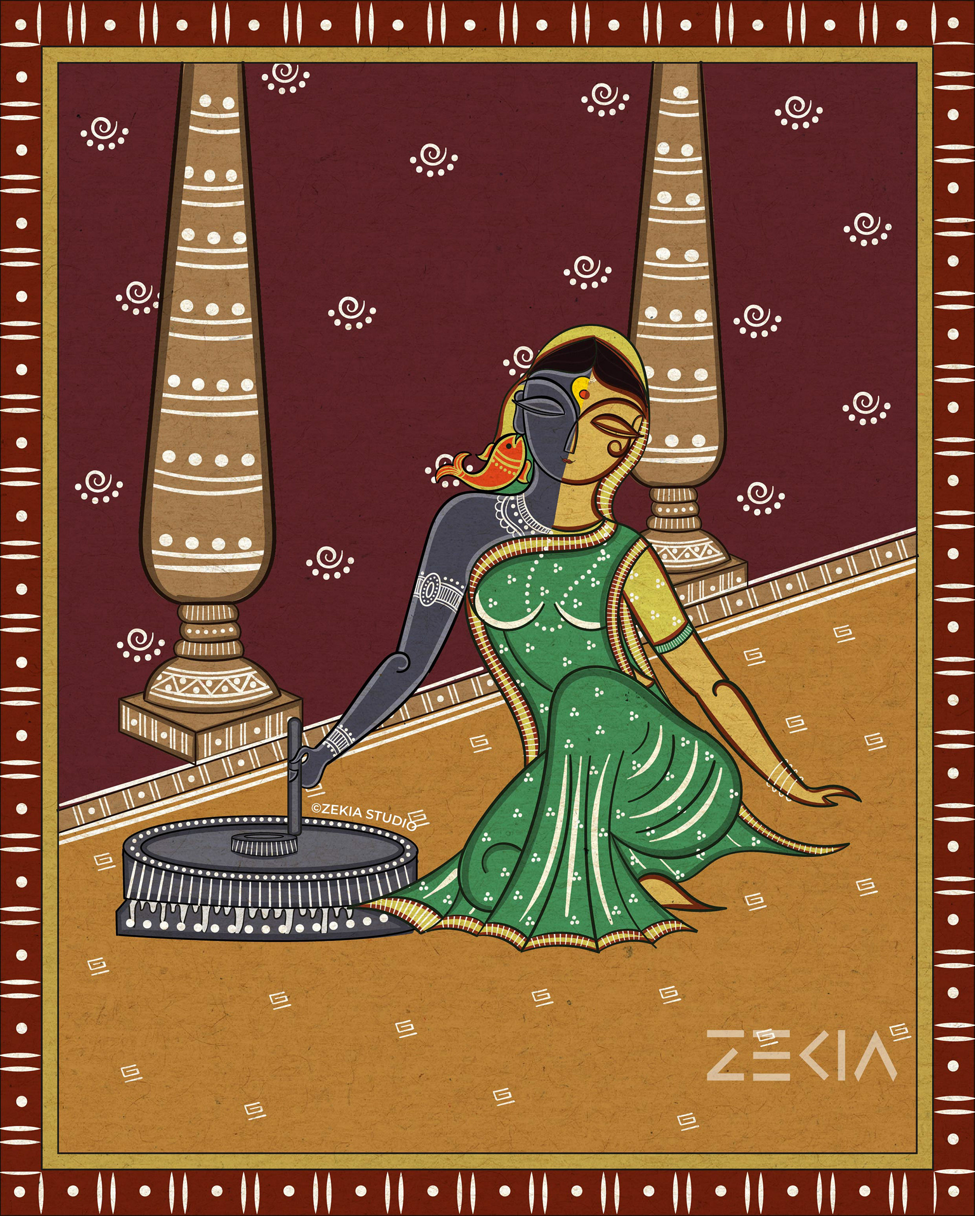 Perceive the emotions flowing through these elegant illustrations of “Female mystics in transcendental Bhakti” edition in Bengal Pattachitra style.